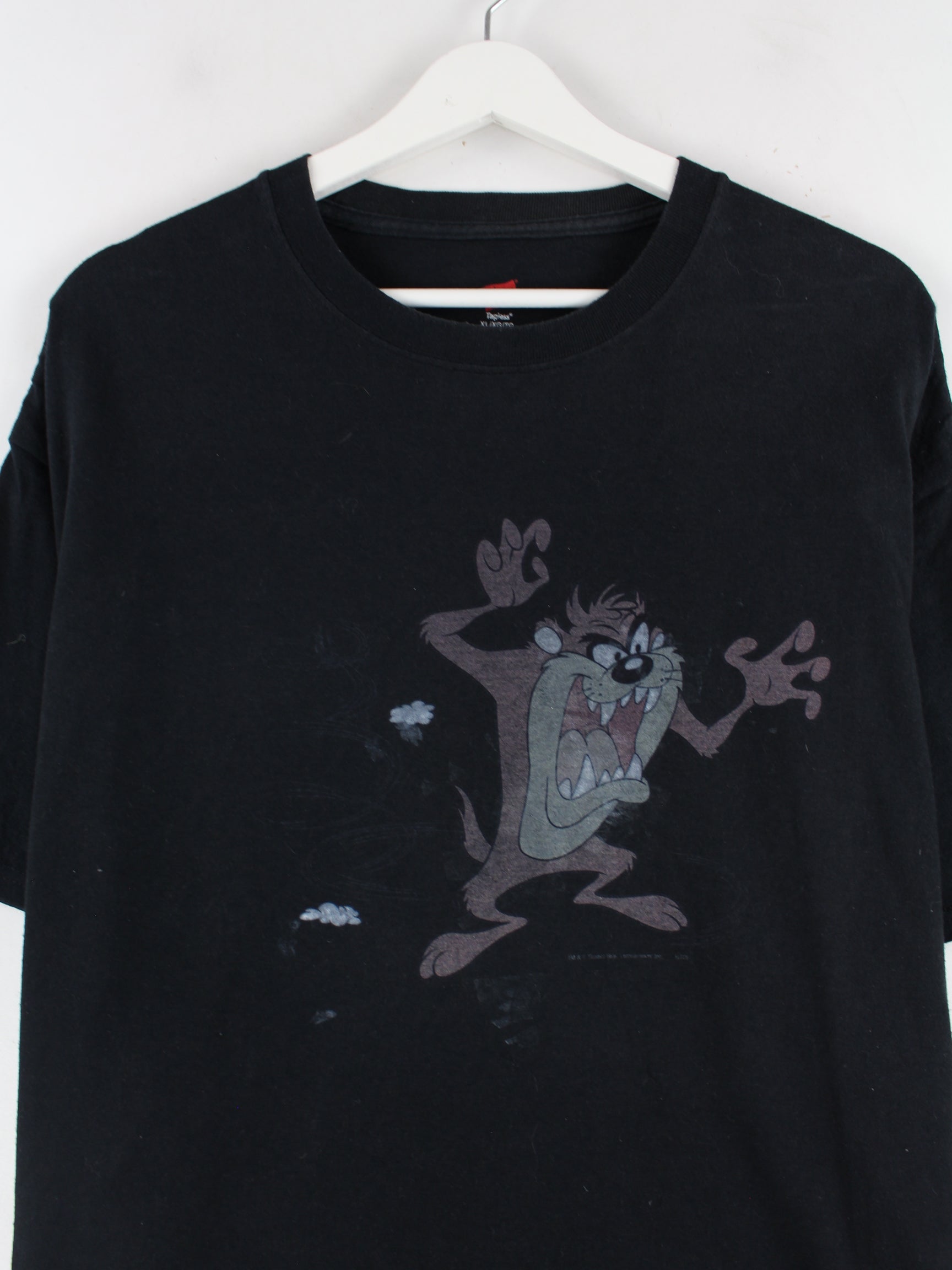 Schwarzes T-Shirt der Brand Hanes in Größe XL. Es ist aus Baumwolle und in sehr gutem Zustand auf Lager. Mit schönem Taz Print.