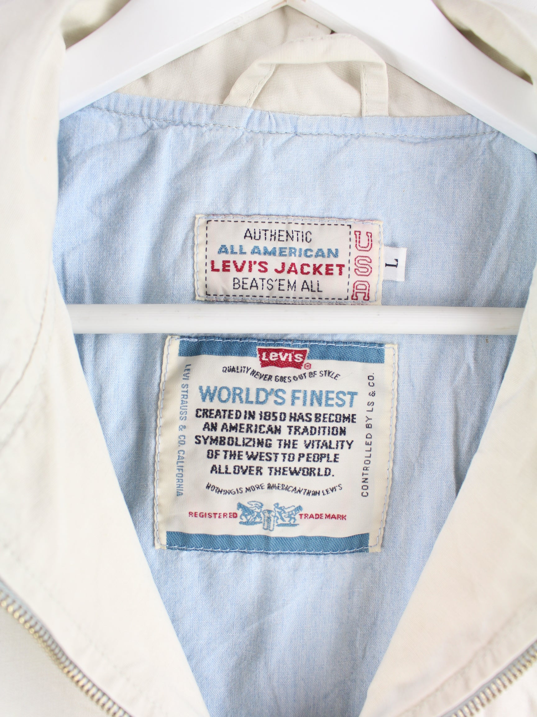 Leichte Jacke der Marke Levi's in Größe L aus den 90'ern. Sie ist aus einer Baumwollmischung produziert und in Beige im Angebot.