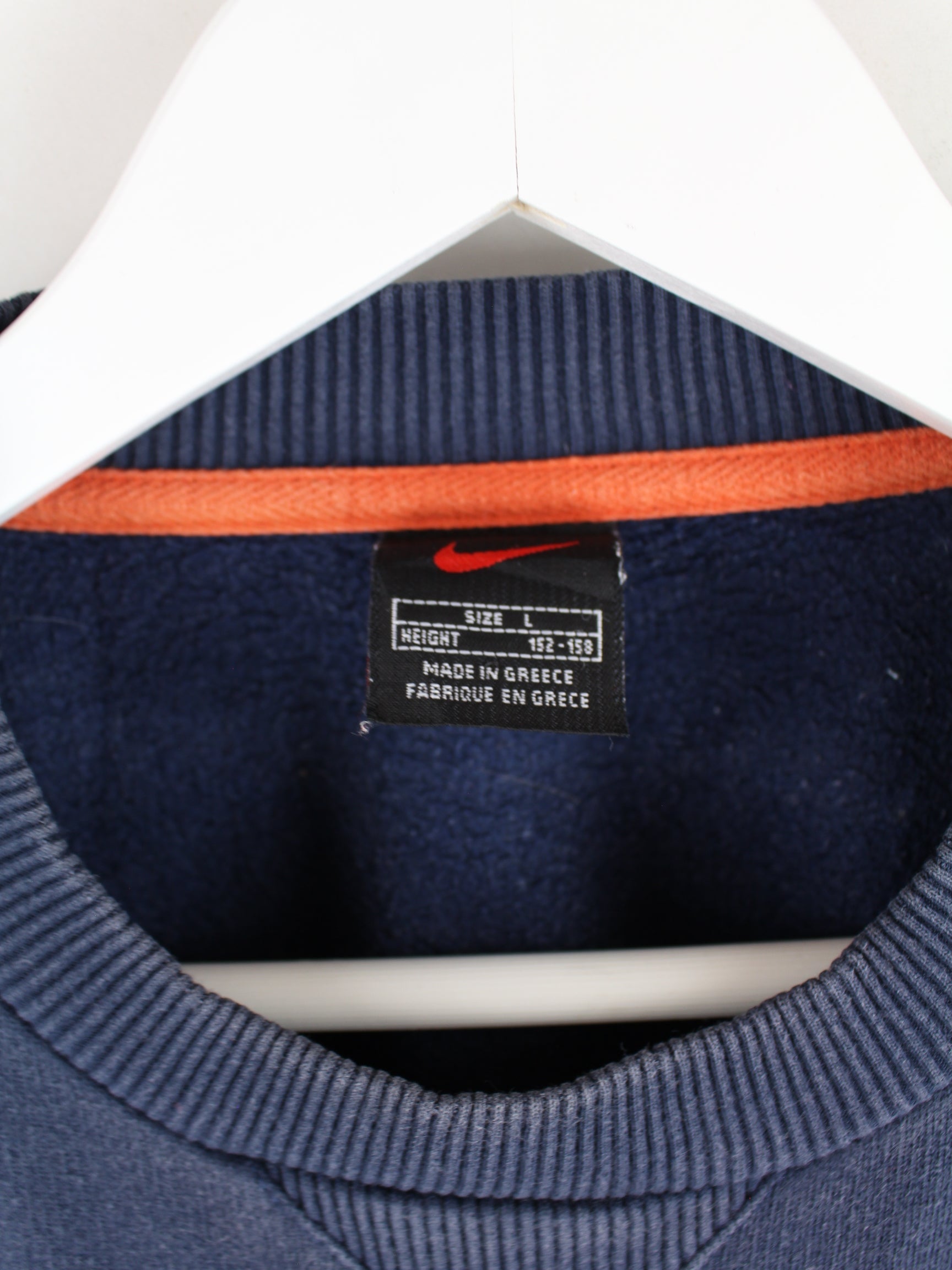 Sweater vom Brand Nike mit gestickten Motiven in Größe XS aus den 90'ern. Er ist aus einer Baumwollmischung gefertigt und in Blau auf Lager.