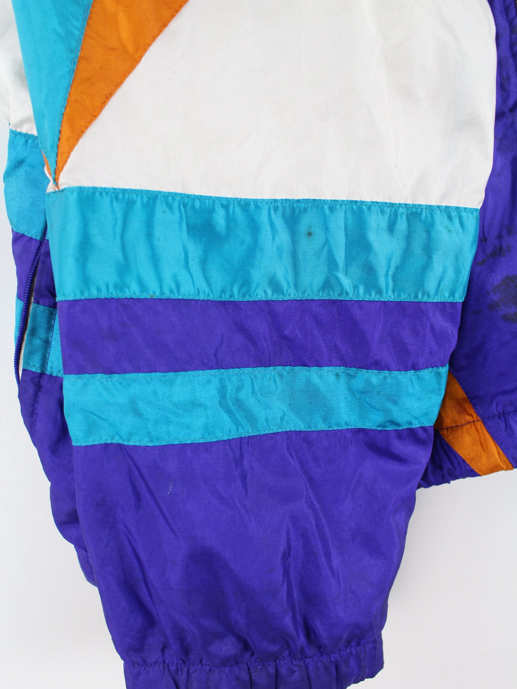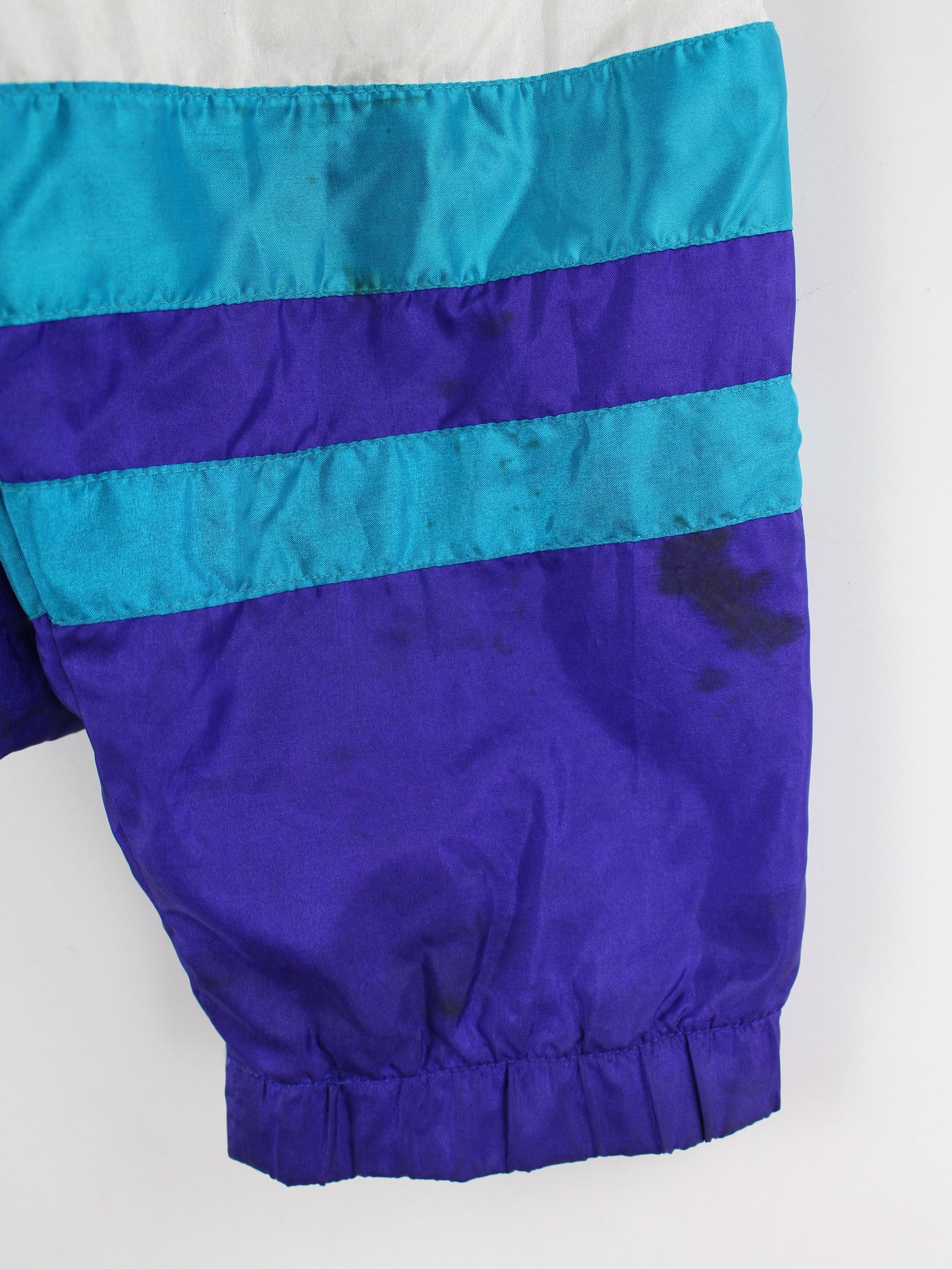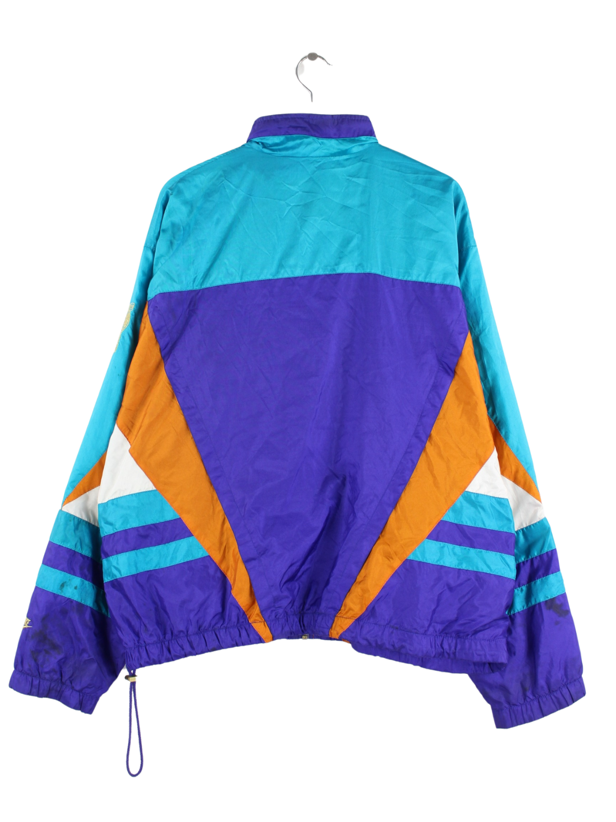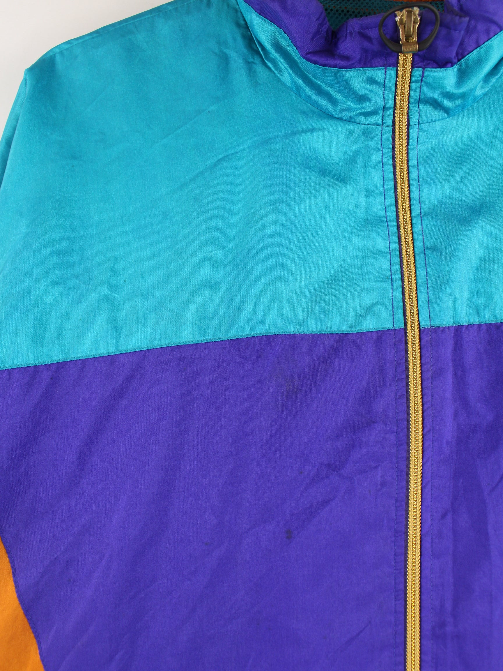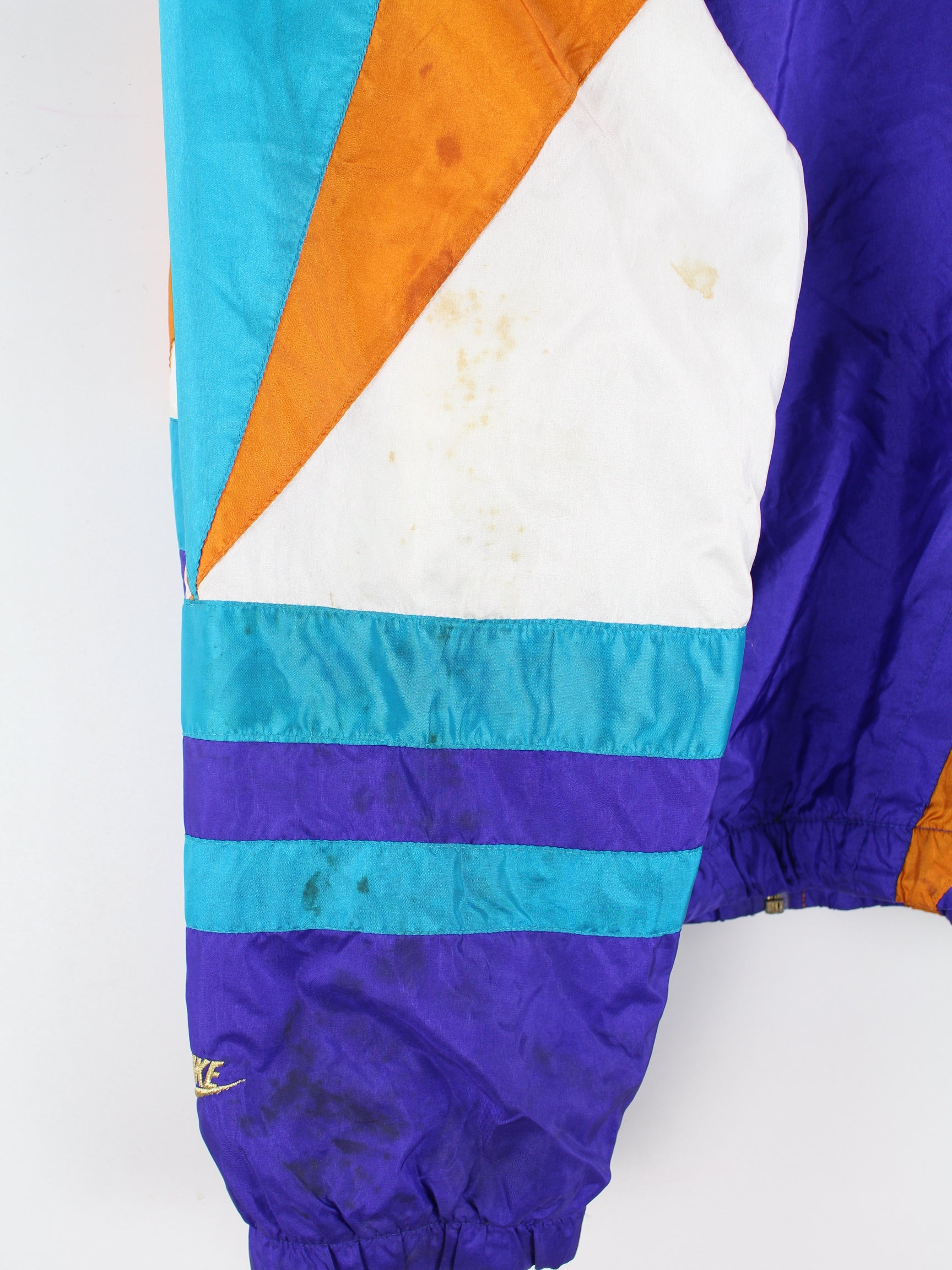 Mehrfarbige Trainingsjacke mit gestickten Motiven vom Brand Nike aus den 90'ern in Größe XL. Sie ist aus Synthetik angefertigt. Den Zustand würden wir als 'In Ordnung' bezeichnen (vergl. Bilder).