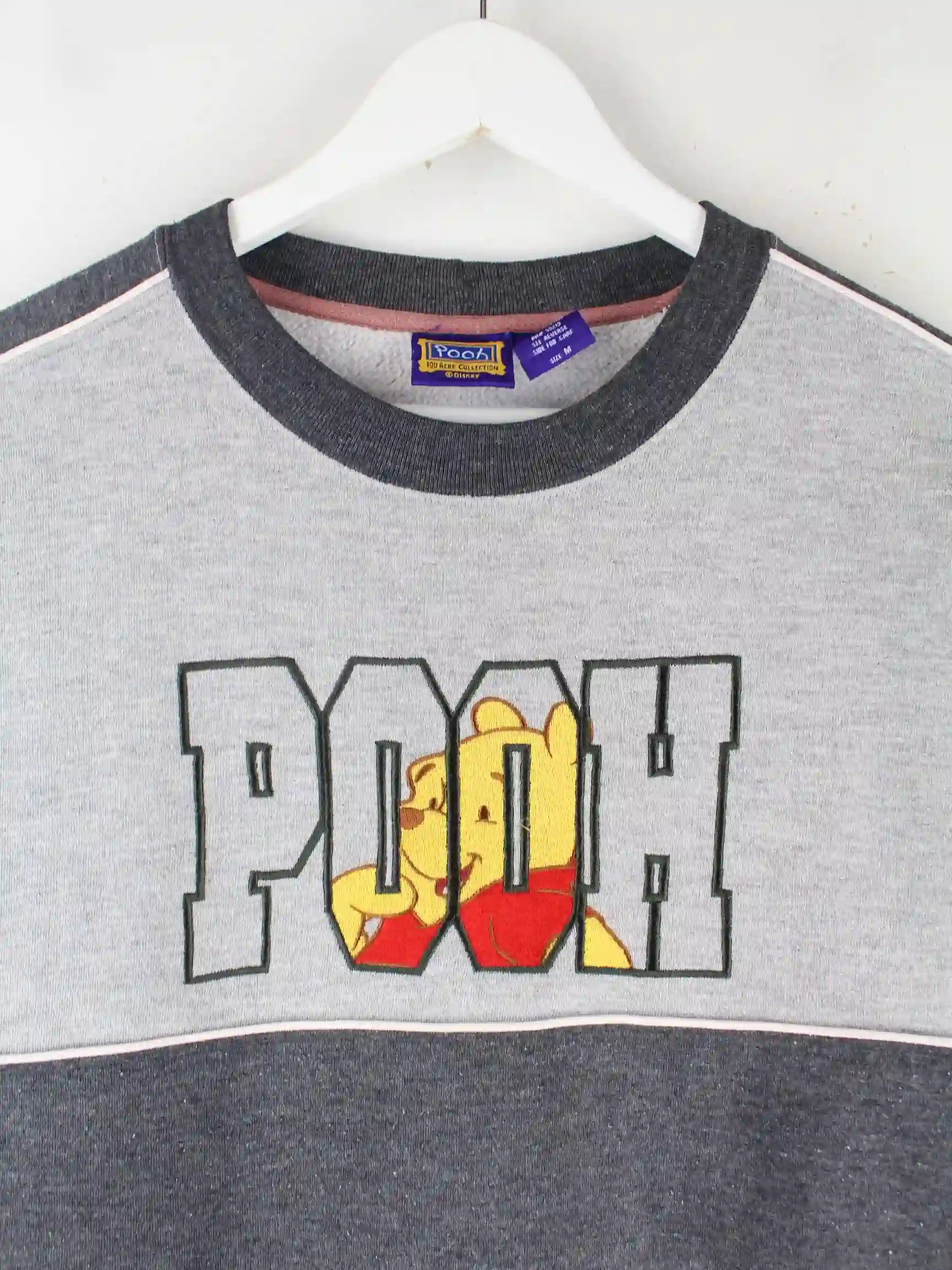 Grauer Sweater mit Stick der Brand Pooh in Größe M. Er ist aus einer Baumwollmischung und in sehr gutem Zustand vorrätig.