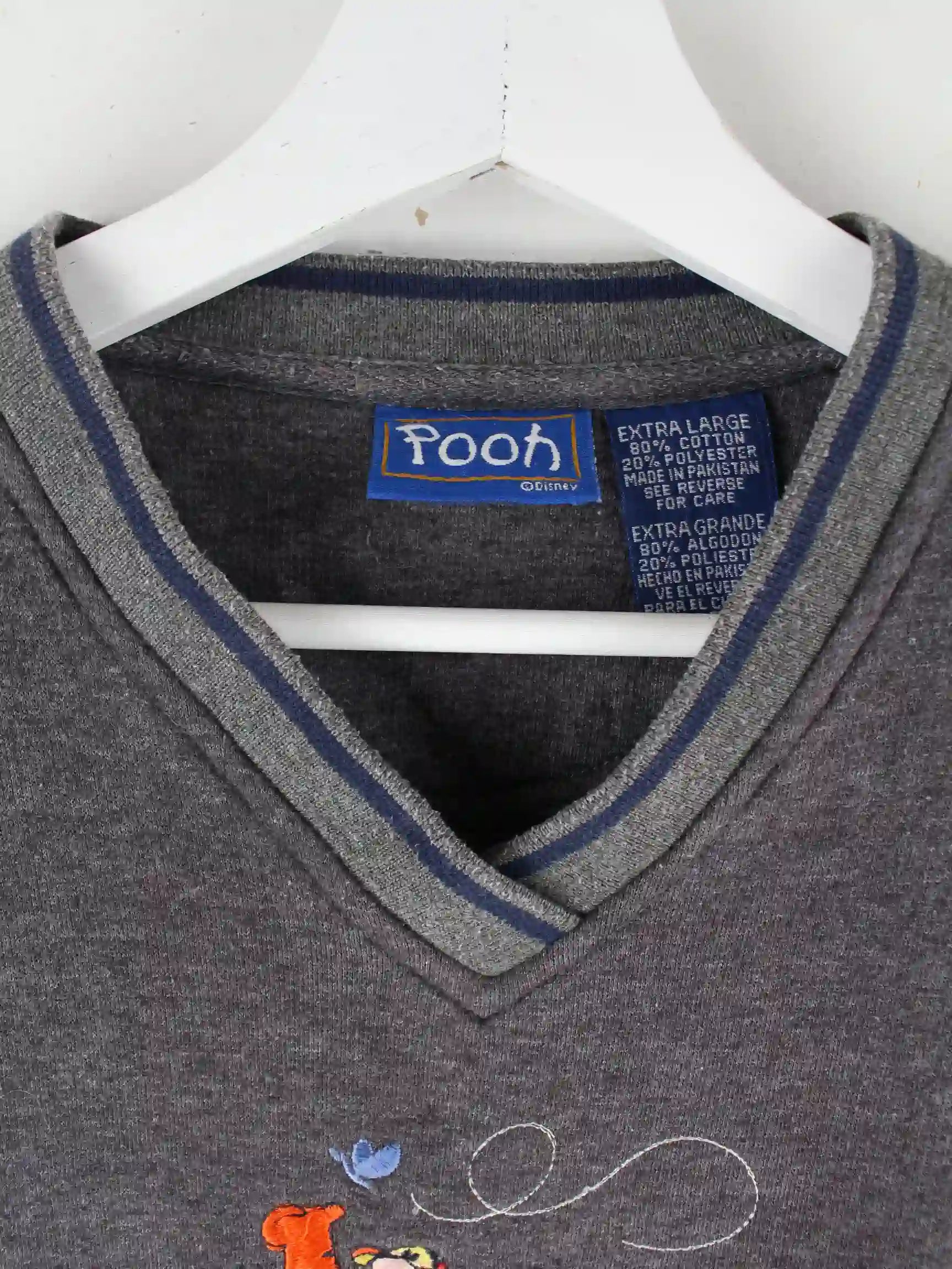 Grauer Sweater aus dem Hause Pooh aus den 90'ern in Größe XL. Er ist aus einer Baumwollmischung gemacht und in sehr gutem Zustand zu haben.