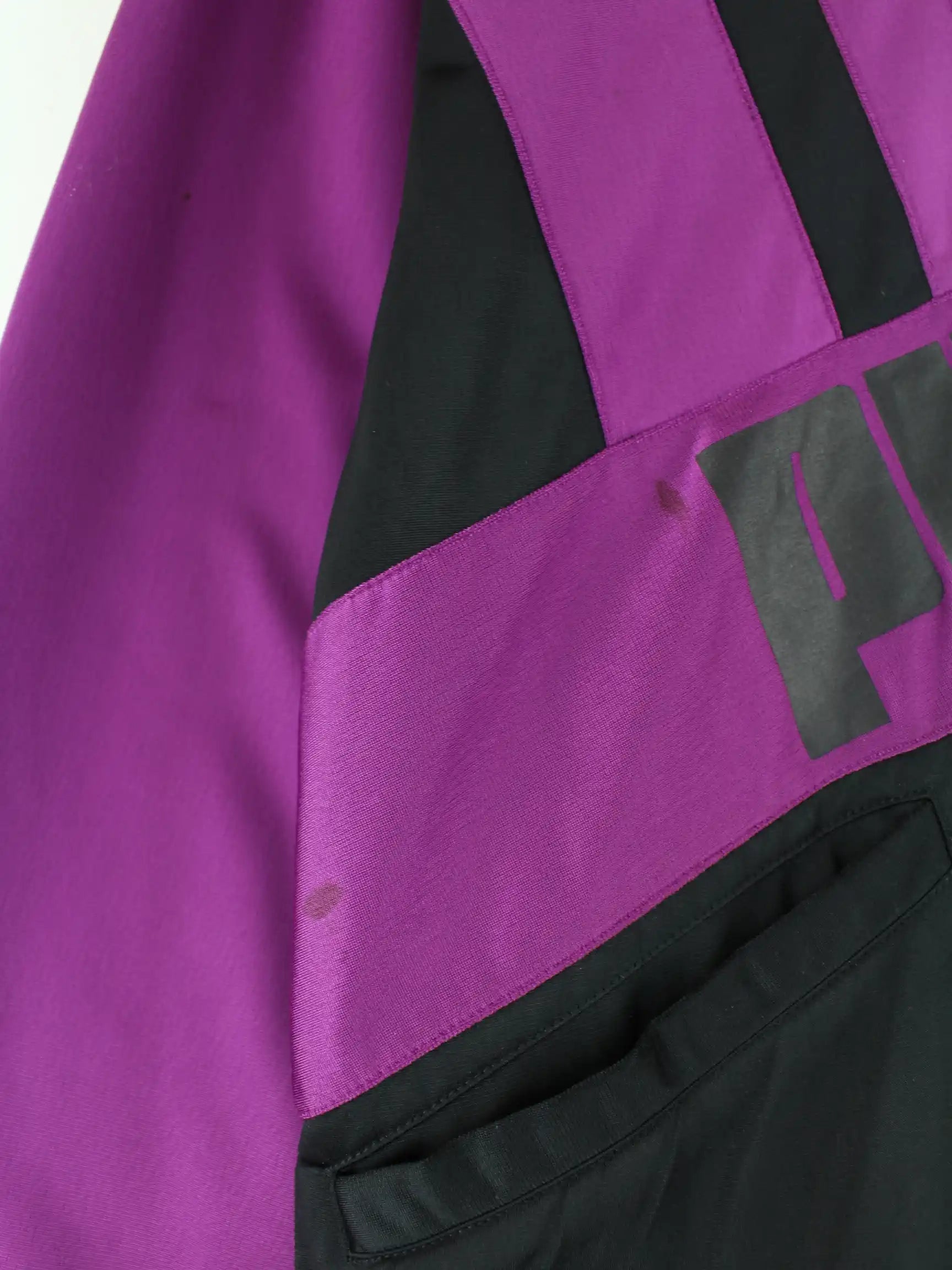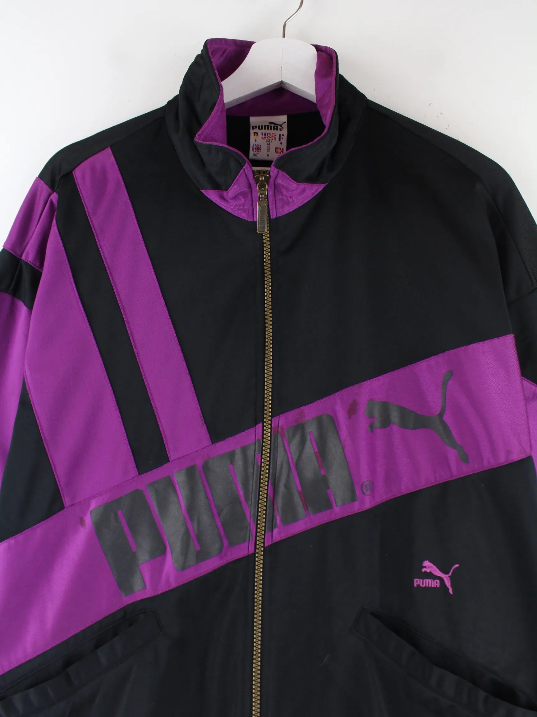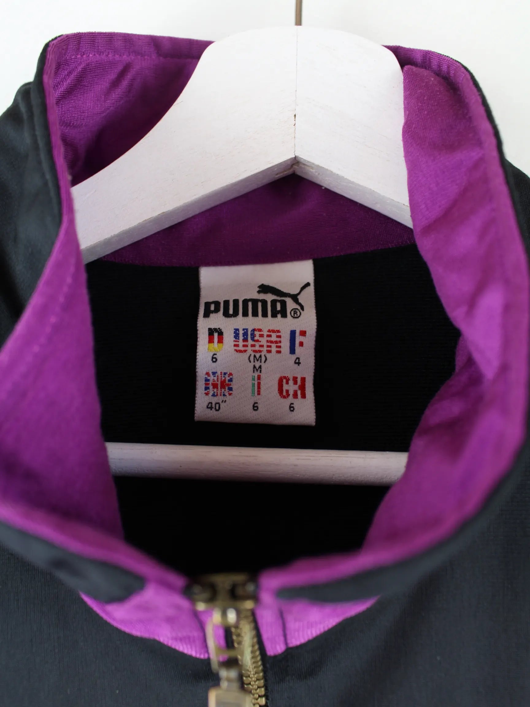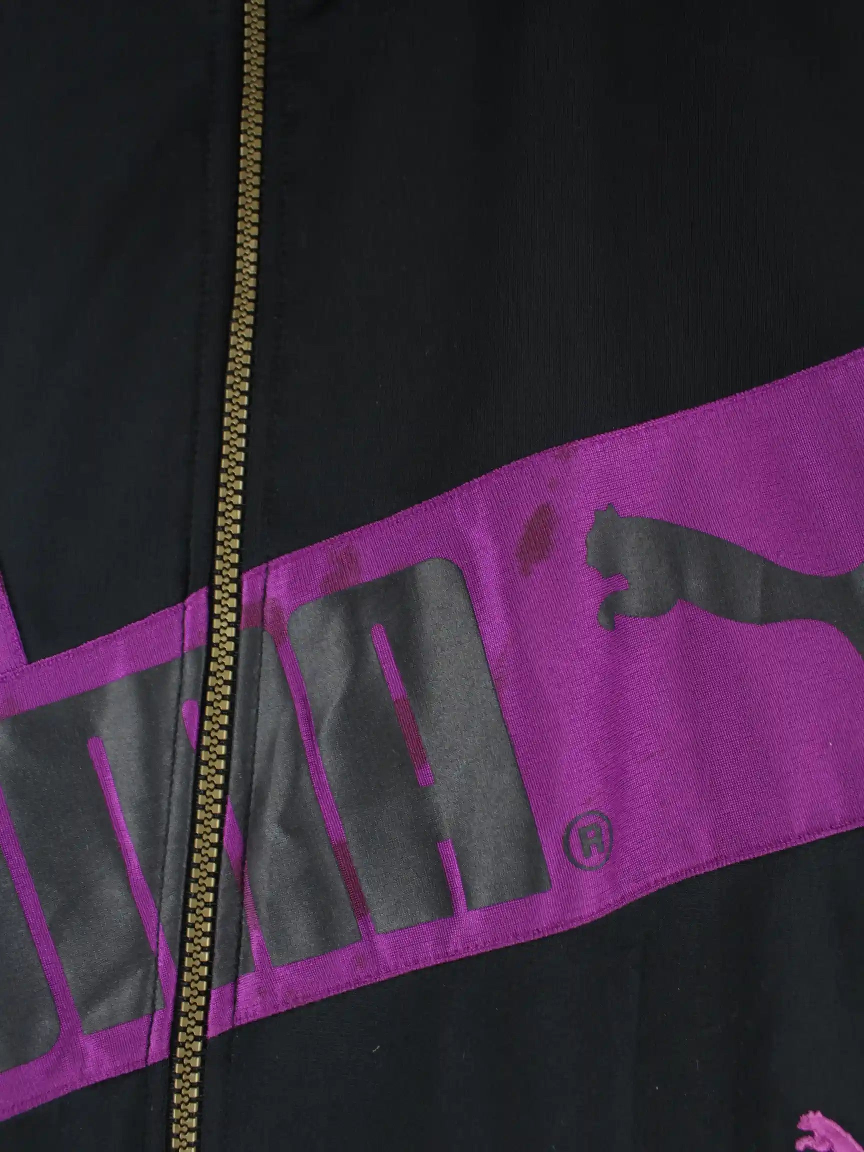 Schwarze Trainingsjacke aus dem Hause Puma aus den 90'ern in Größe M. Sie ist aus Synthetik hergestellt. Den Zustand würden wir als 'In Ordnung' bezeichnen (vergl. Bilder).Mit chiquem Vintage Print.