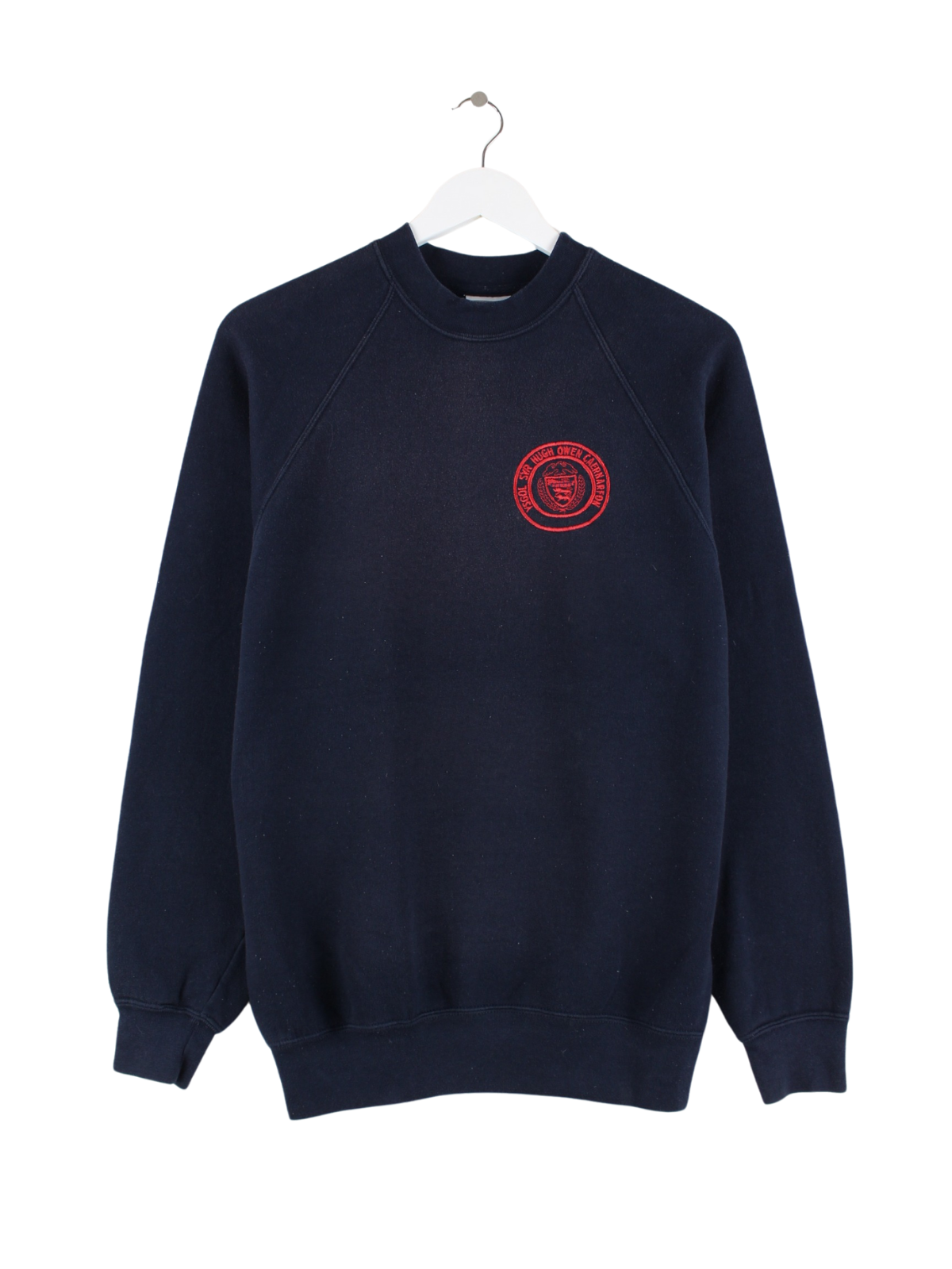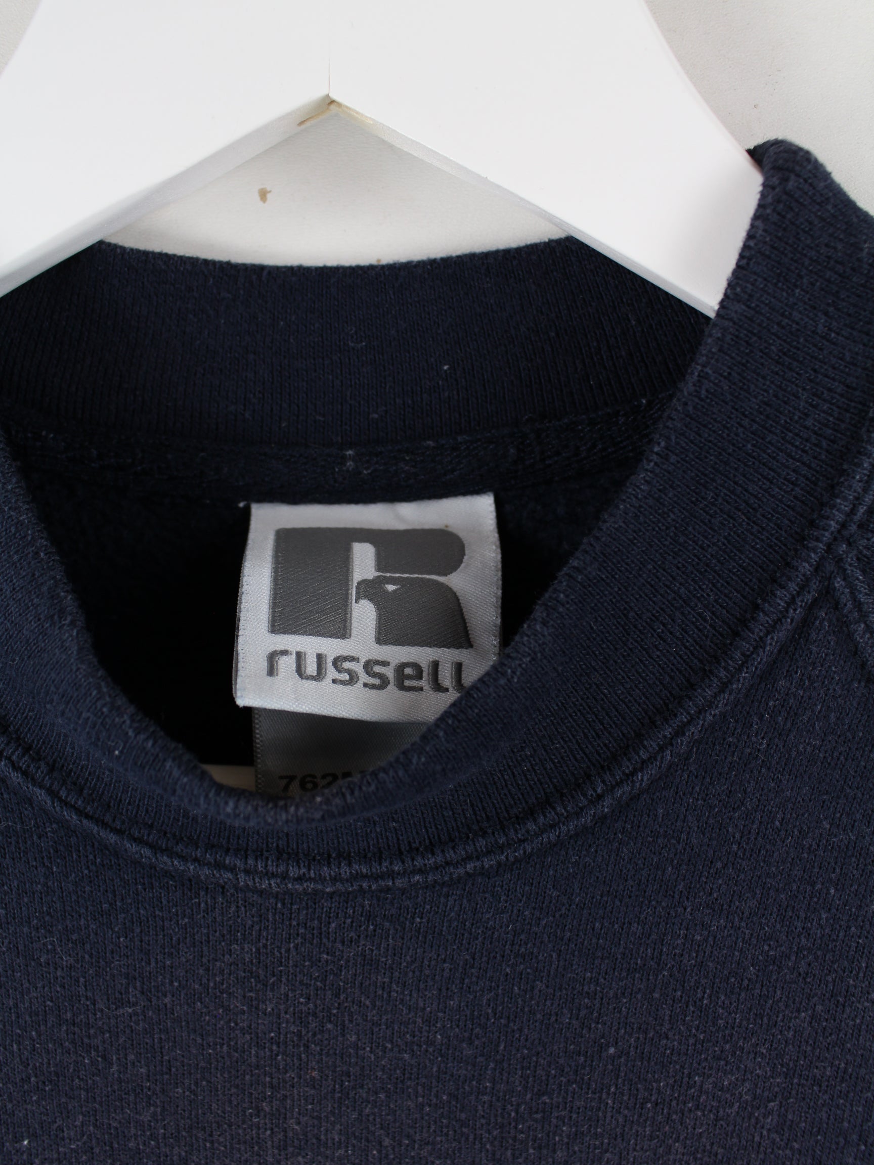 Sweater des Labels Russell Athletic mit gesticktem Logo in Größe S aus den 90'ern. Er ist aus einer Baumwollmischung angefertigt und in Blau im Angebot.