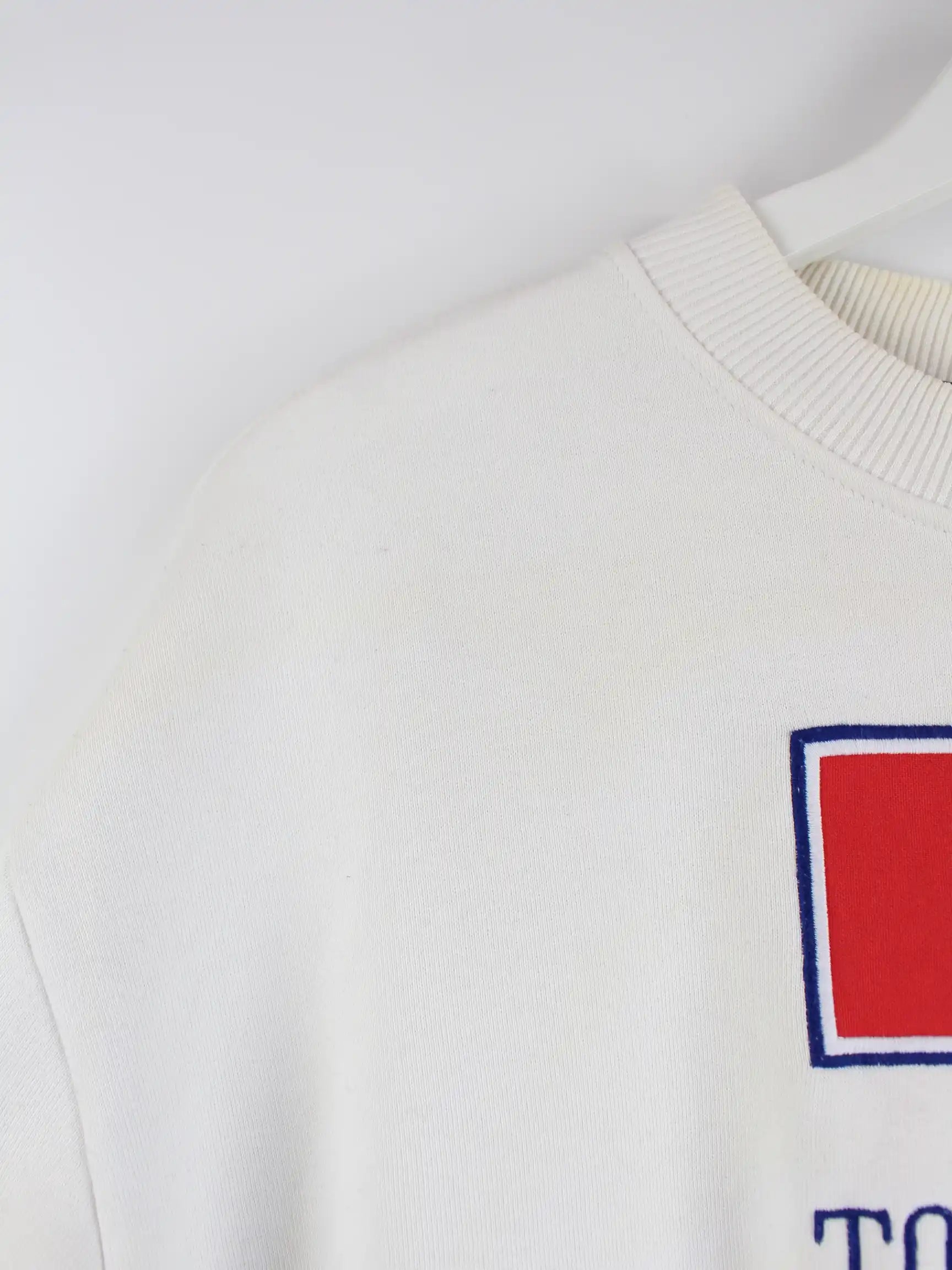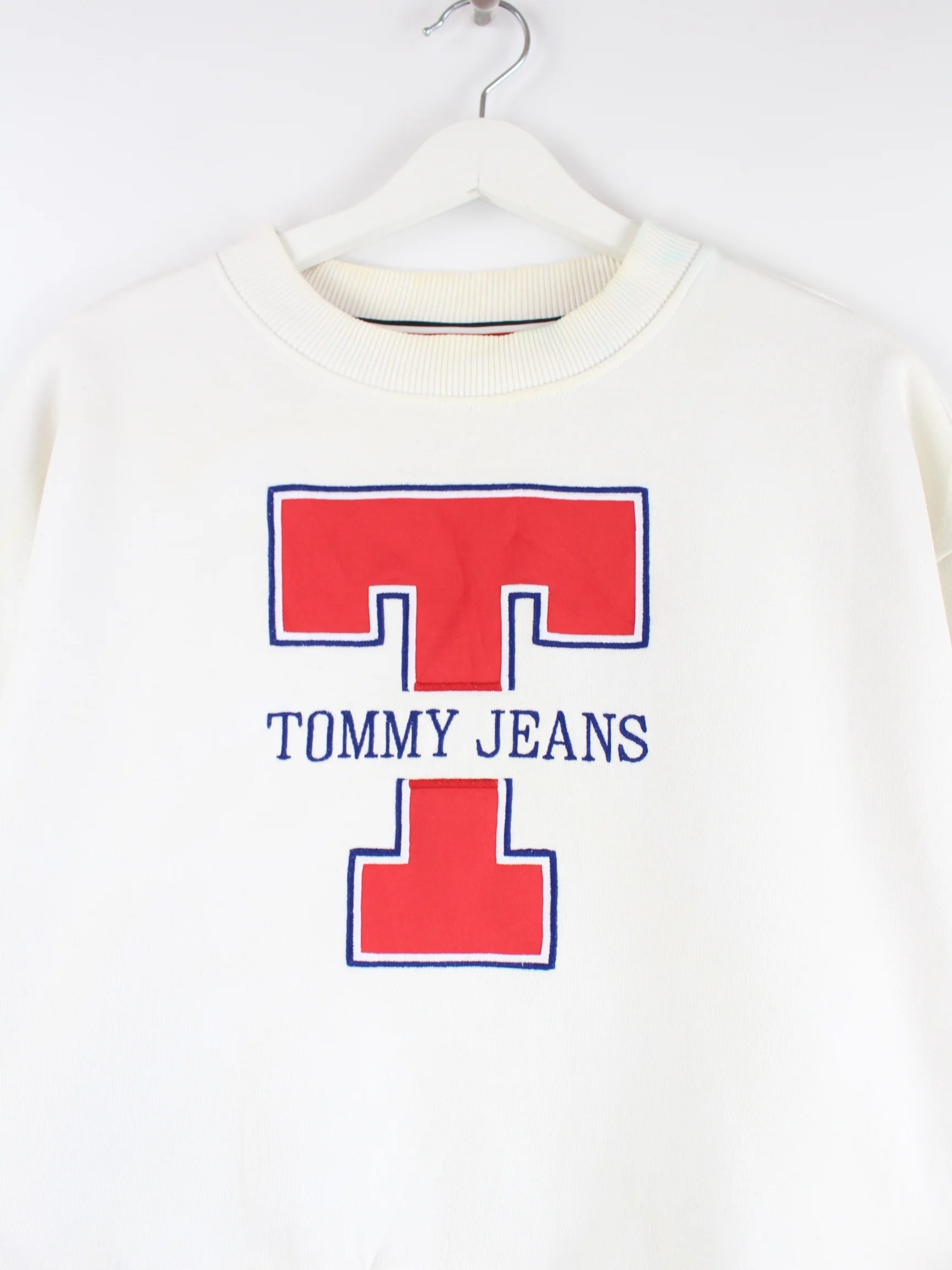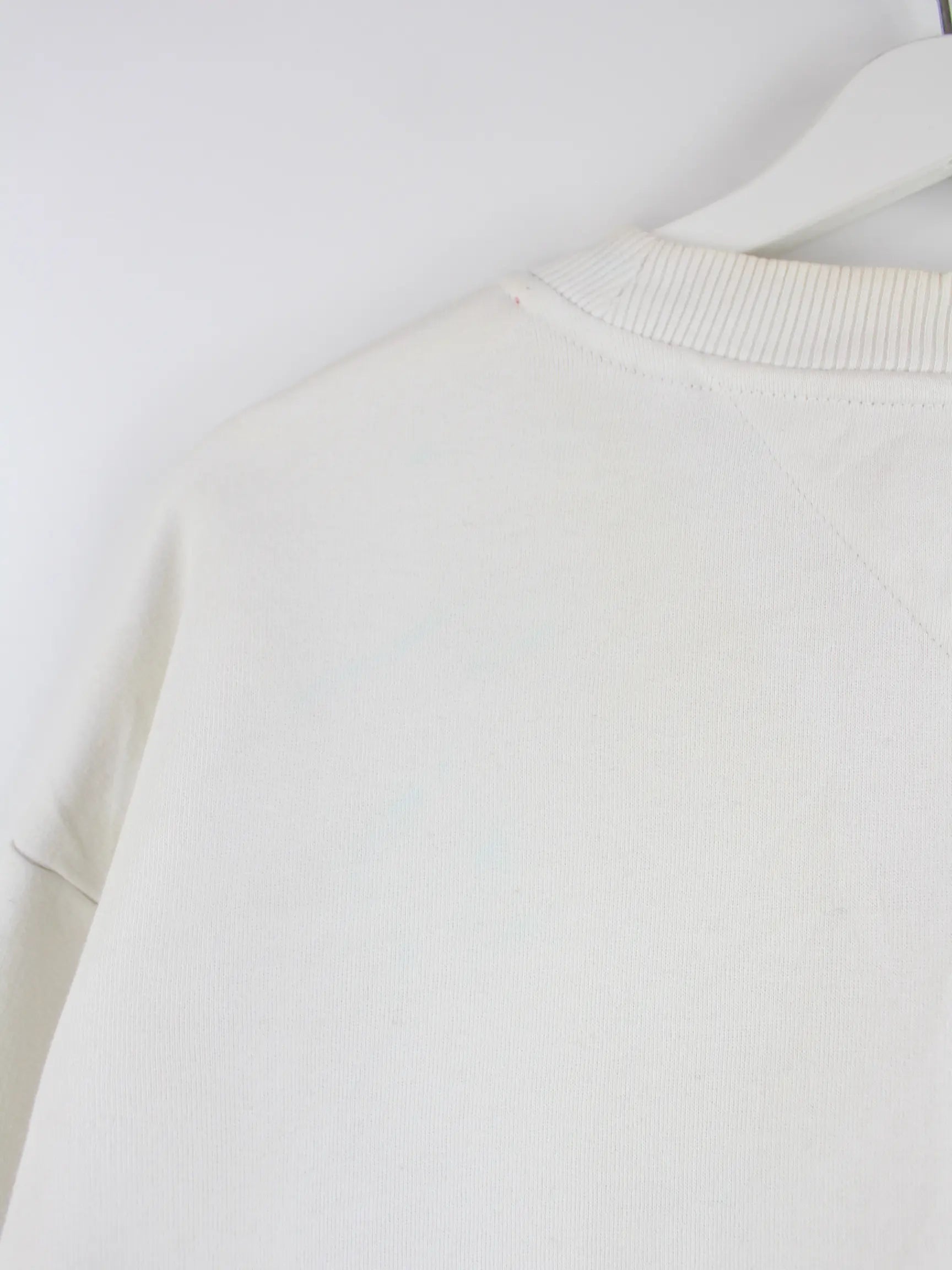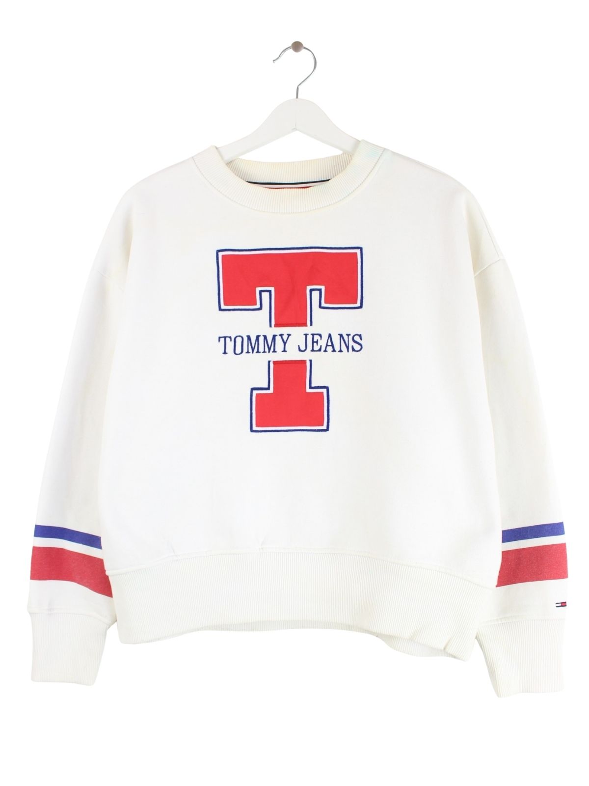 Weißer Sweater der Marke Tommy Hilfiger in Größe S. Er ist aus einer Baumwollmischung gefertigt. Den Zustand würden wir als 'In Ordnung' bezeichnen (vergl. Bilder).