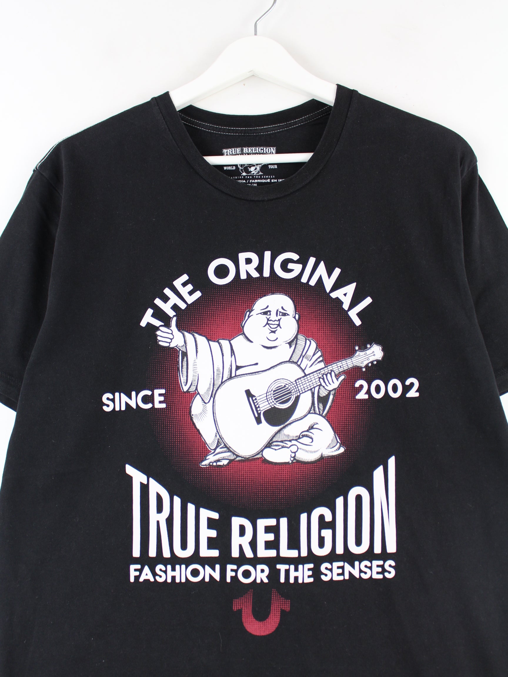 Schwarzes T-Shirt aus dem Hause True Religion in Größe M. Es ist aus Baumwolle gemacht und in sehr gutem Zustand im Bestand. Mit schönem Buddha Print.
