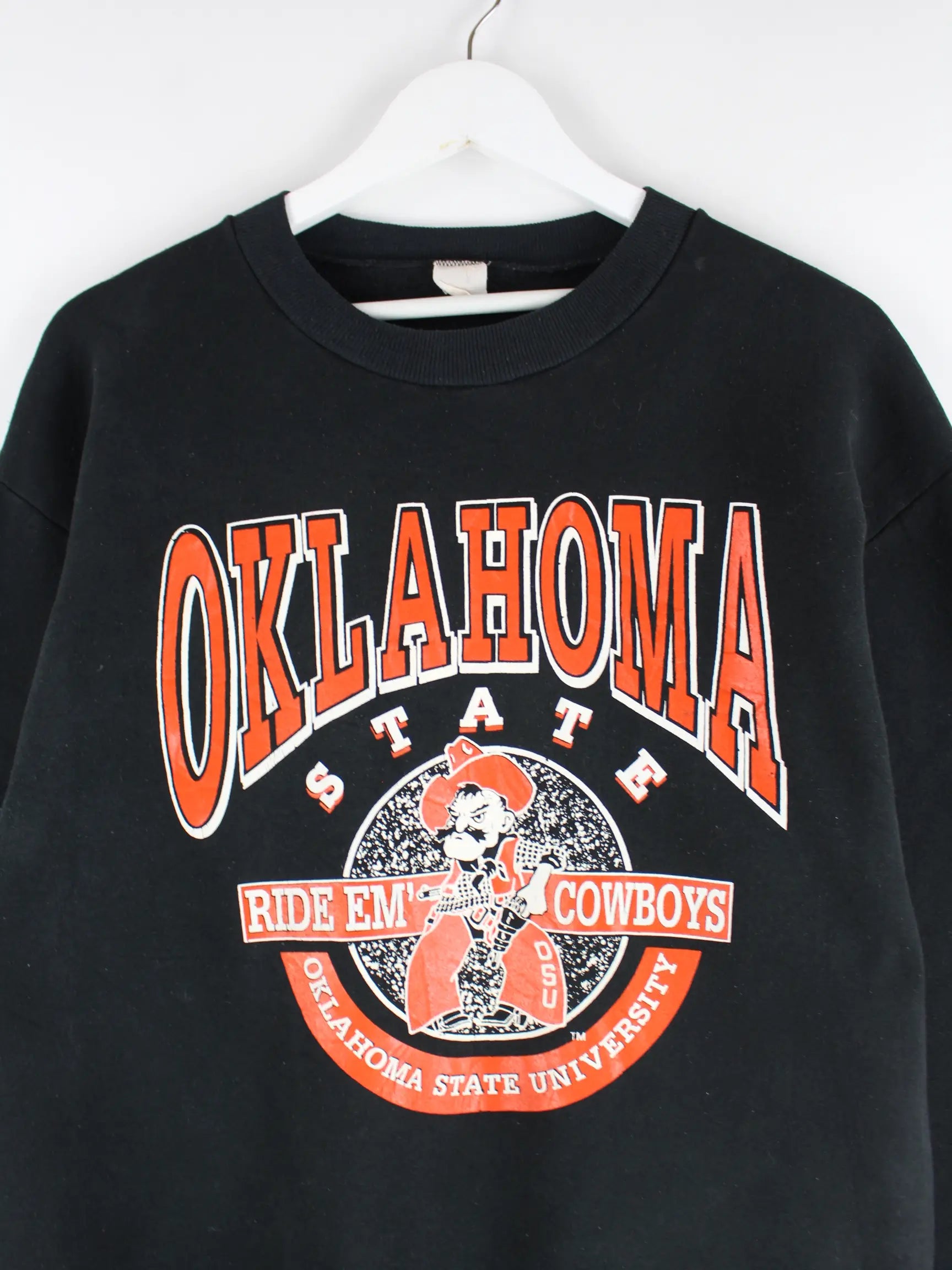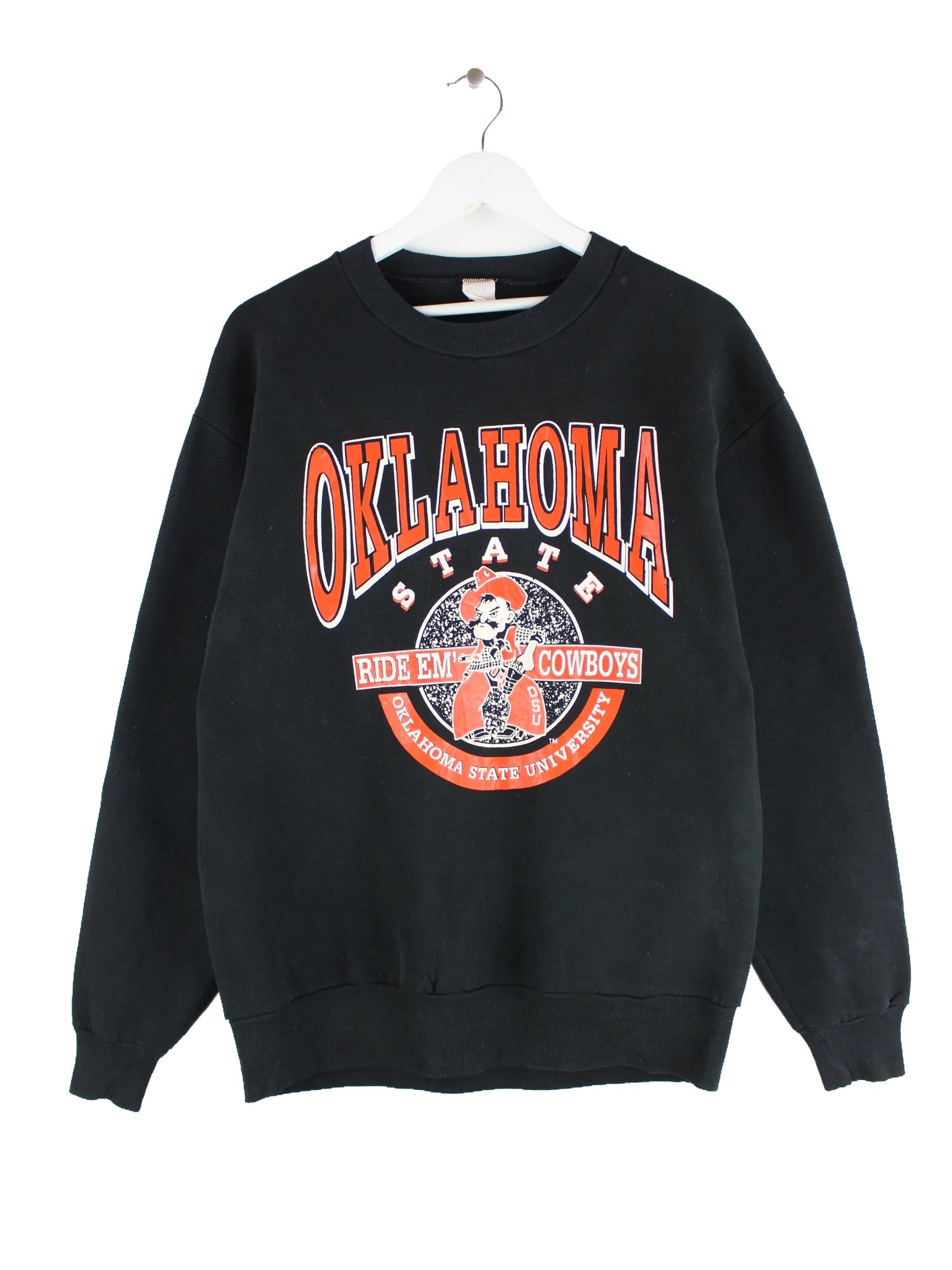 Schwarzer Vintage Sweater aus den 90'ern in Größe L. Er ist aus einer Baumwollmischung gefertigt und in gutem Zustand im Bestand. Mit seltenem Oklahoma Print.