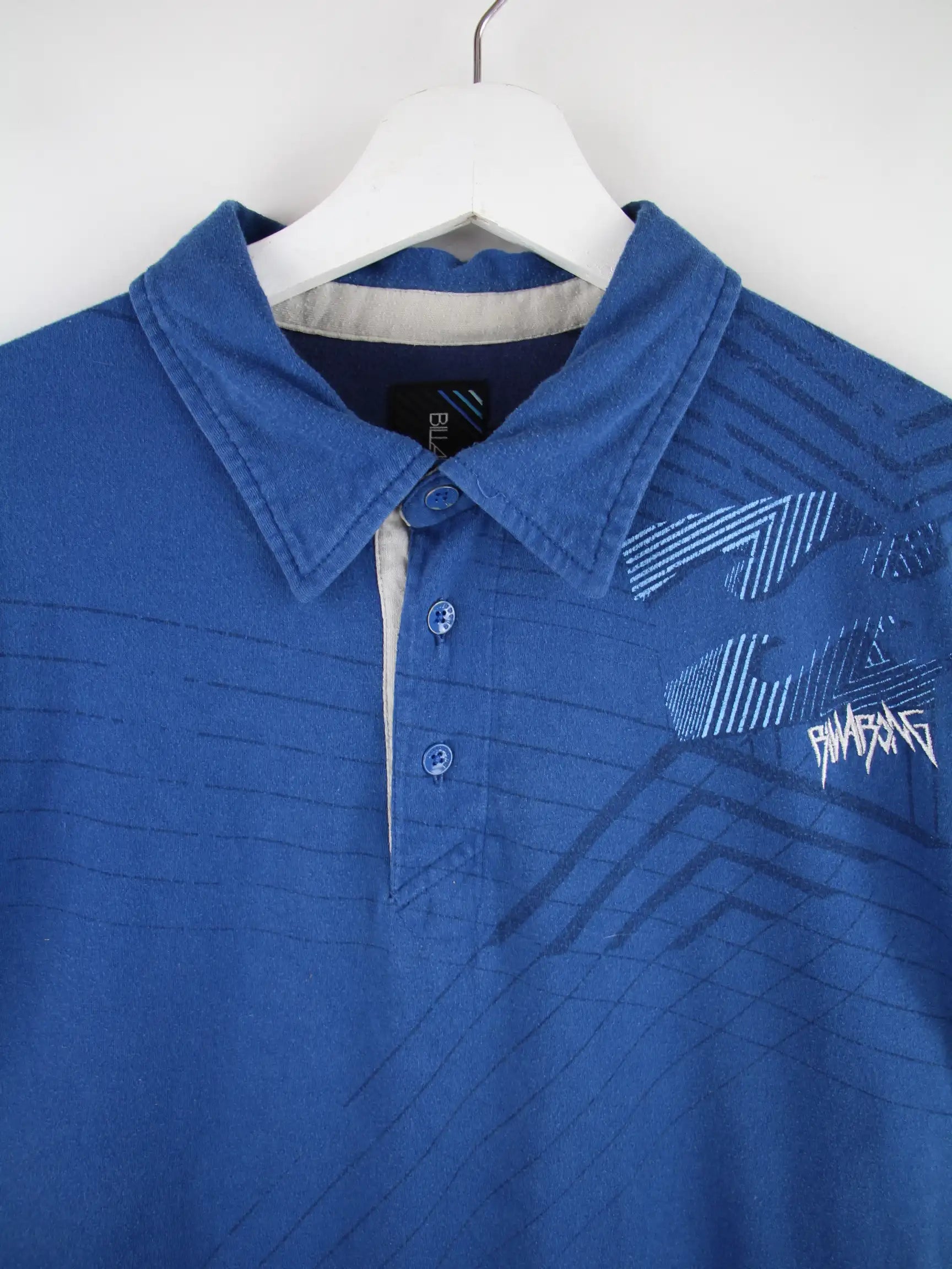 Blaues Poloshirt der Marke Billabong in Größe M. Es ist aus Baumwolle hergestellt und in gutem Zustand bei uns vorrätig. Mit schickem Print.