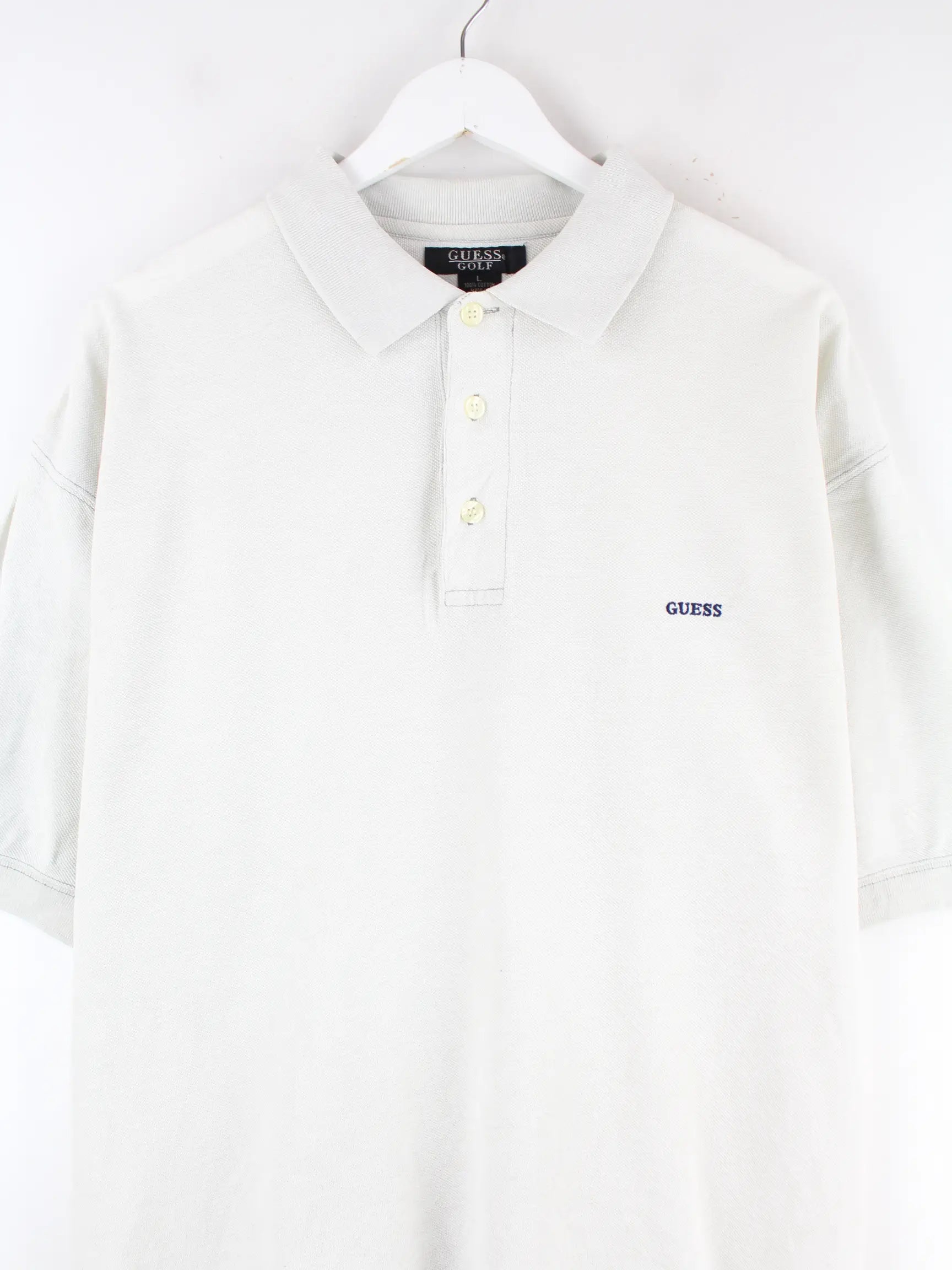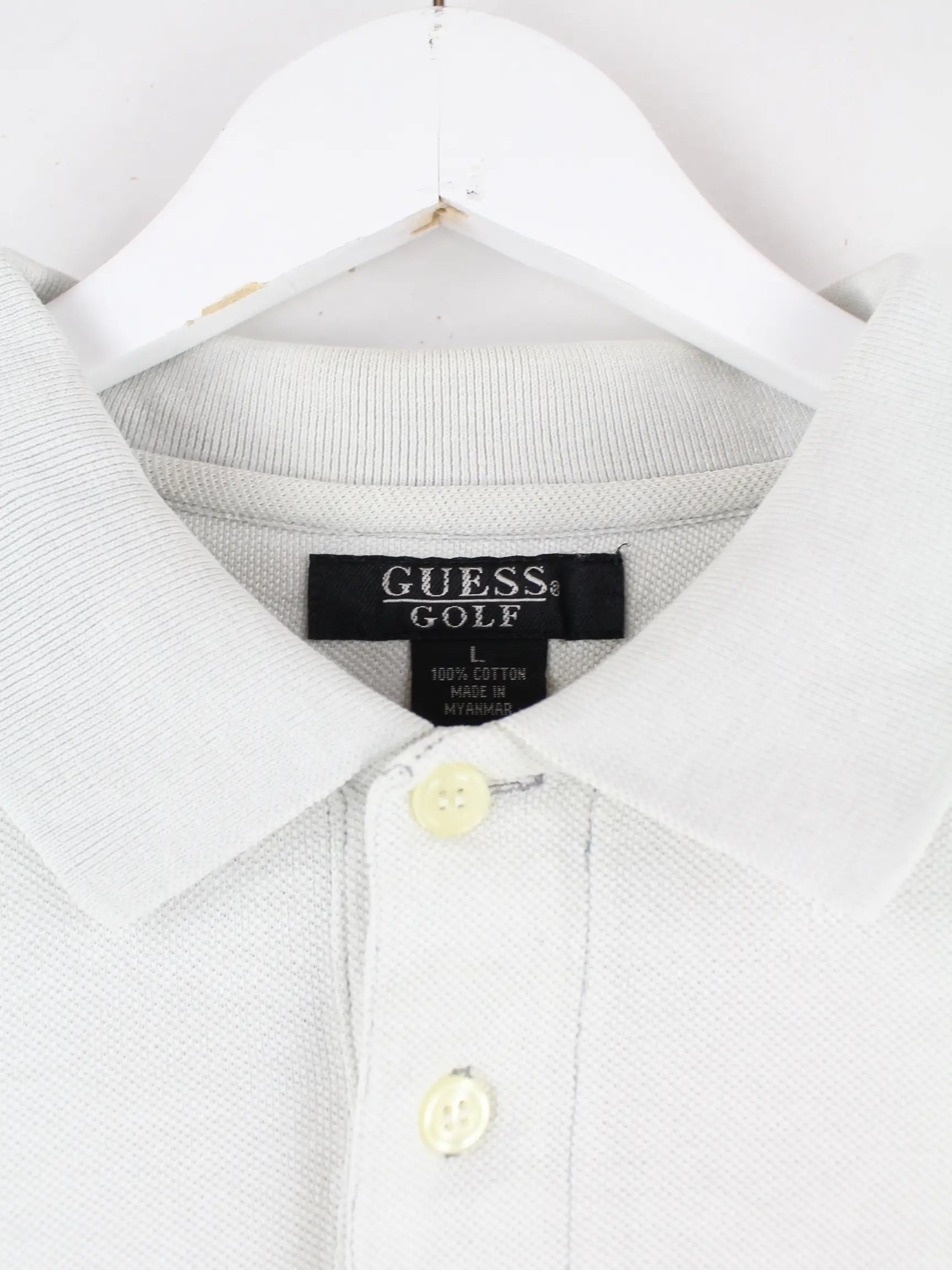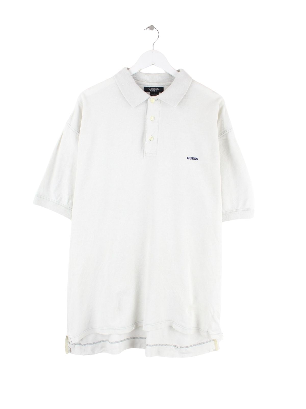 Graues Poloshirt vom Label Guess aus den 90'ern in Größe XL. Es ist aus Baumwolle hergestellt und in gutem Zustand zu haben.