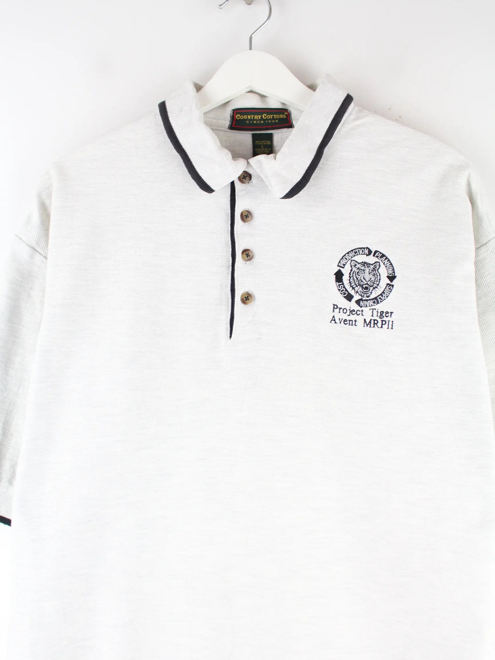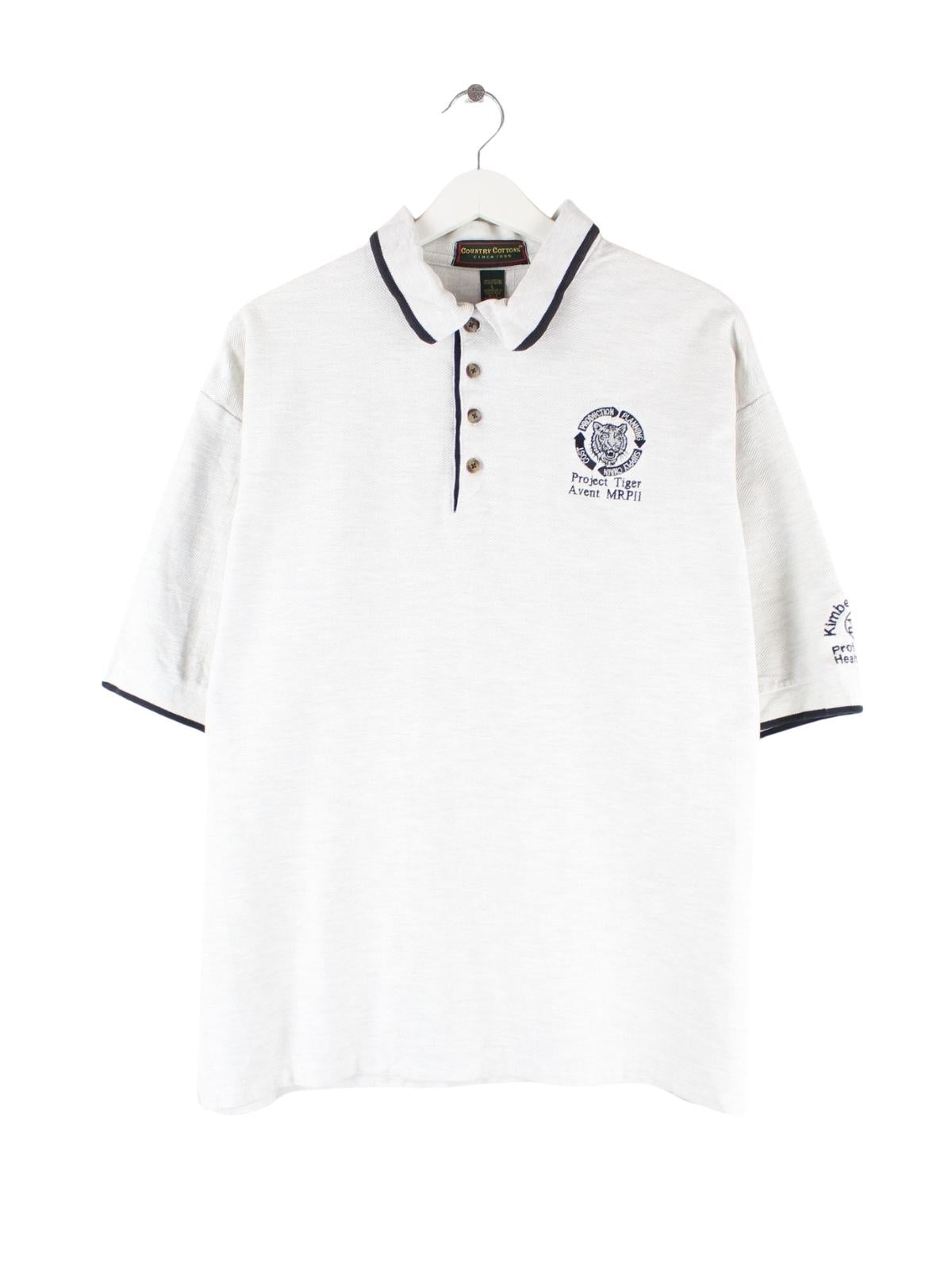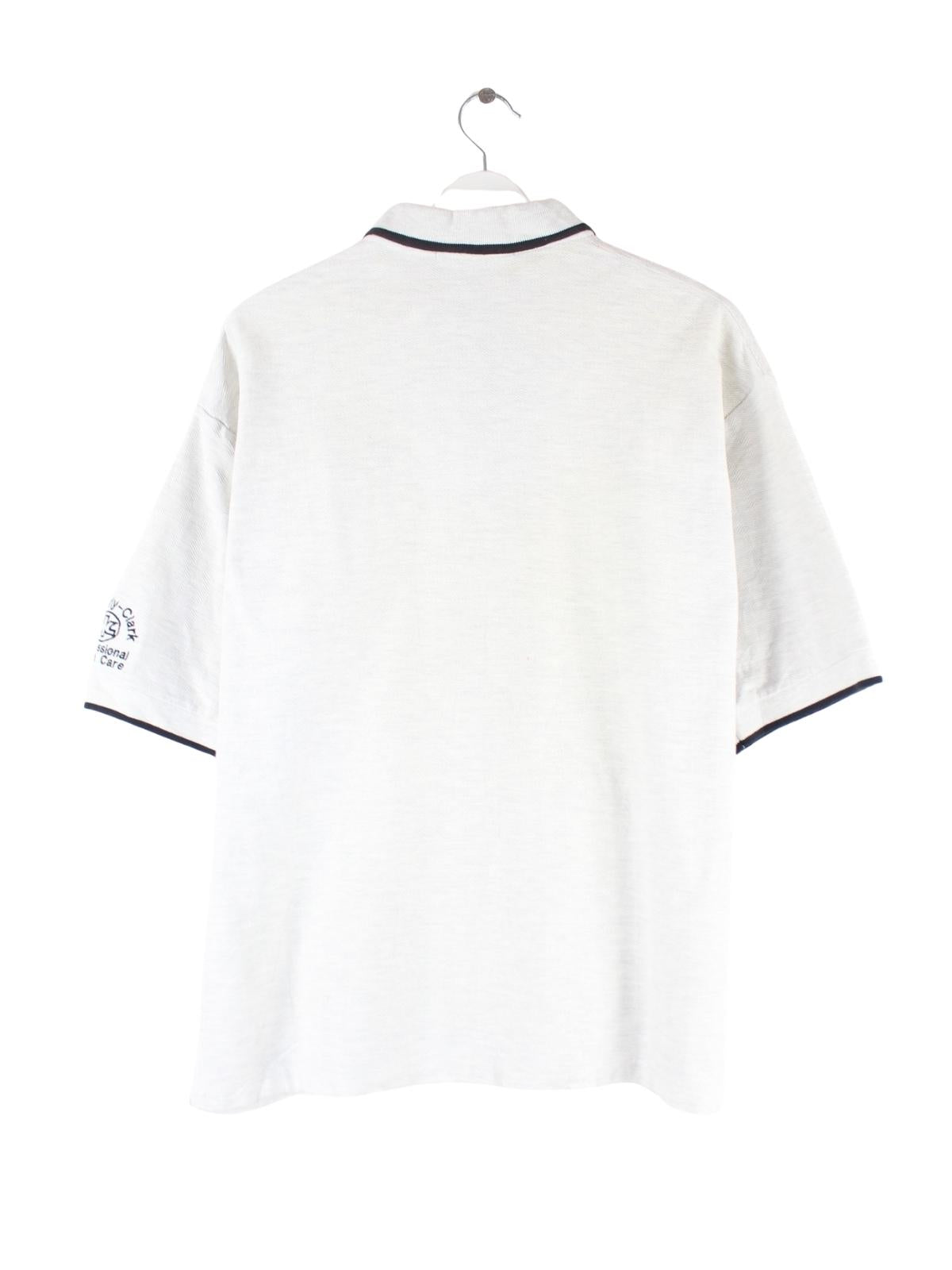 Vintage Poloshirt mit gesticktem Logo in Größe L. Es ist aus Baumwolle gemacht und in Grau im Bestand.