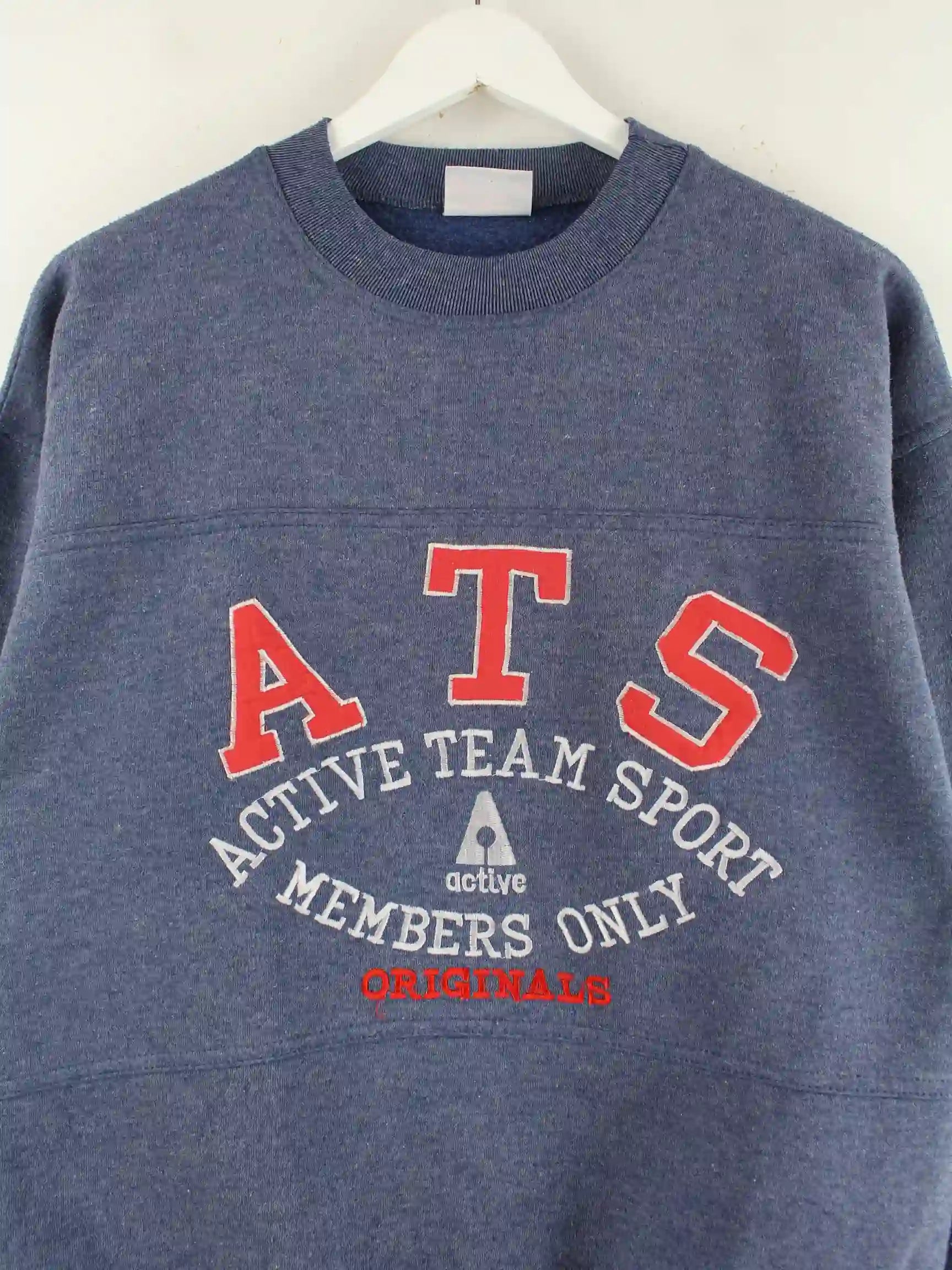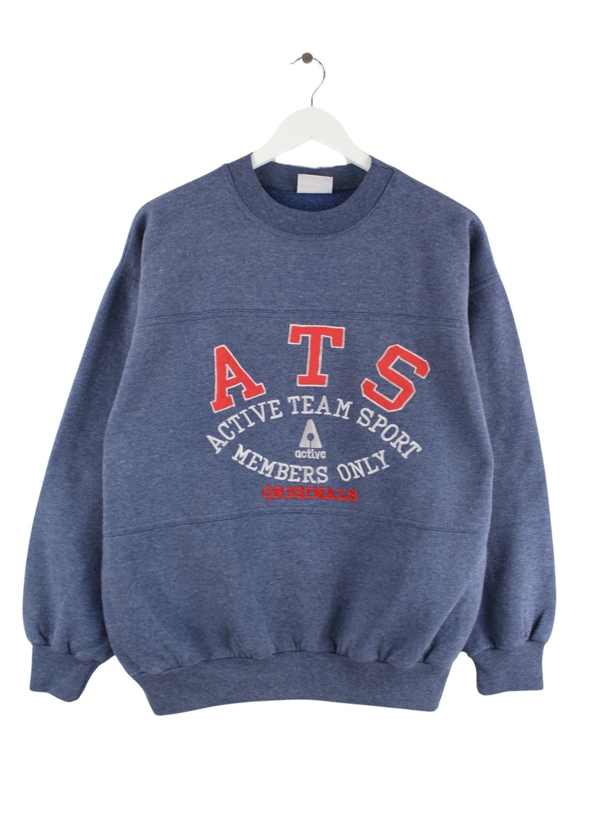 Sweater des Labels Active Swiss mit Stick in Größe L aus den 90'ern. Er ist aus einer Baumwollmischung produziert und in Blau in Stock.