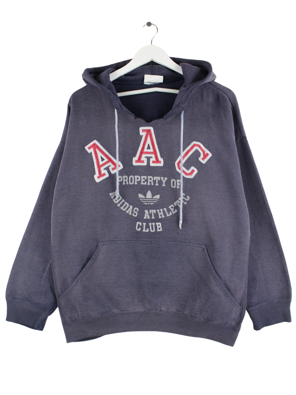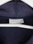 Hoodie des Labels Adidas mit gestickten Motiven in Größe M aus den 80'ern. Er ist aus einer Baumwollmischung und in Blau im Bestand.