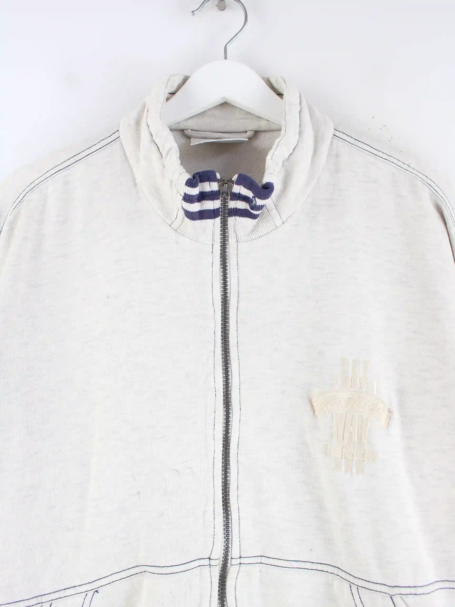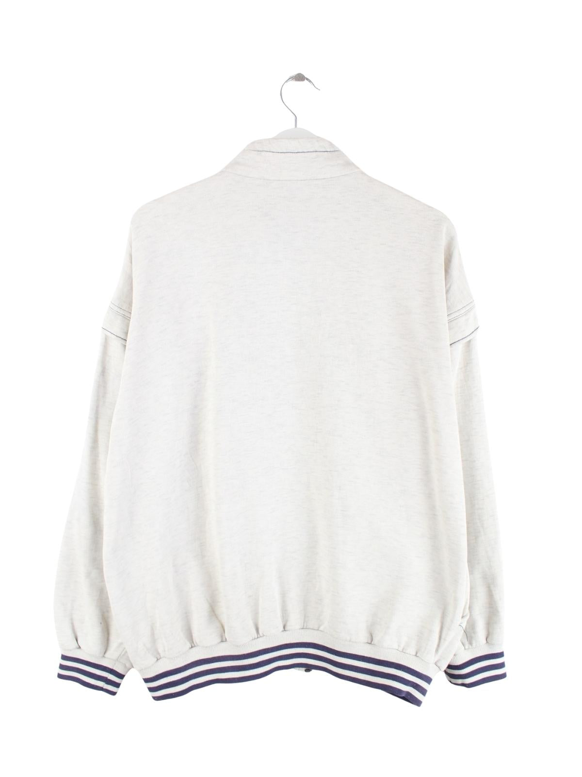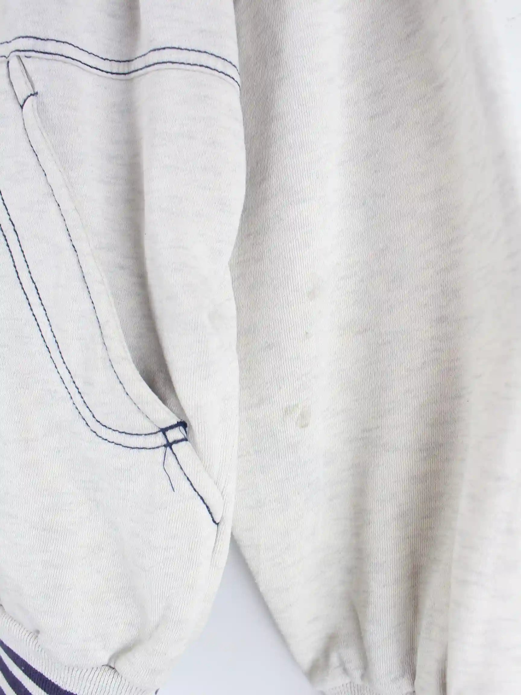 Sweatjacke vom Brand Adidas in Größe L aus den 80'ern. Sie ist aus einer Baumwollmischung gemacht und in Grau zu haben.