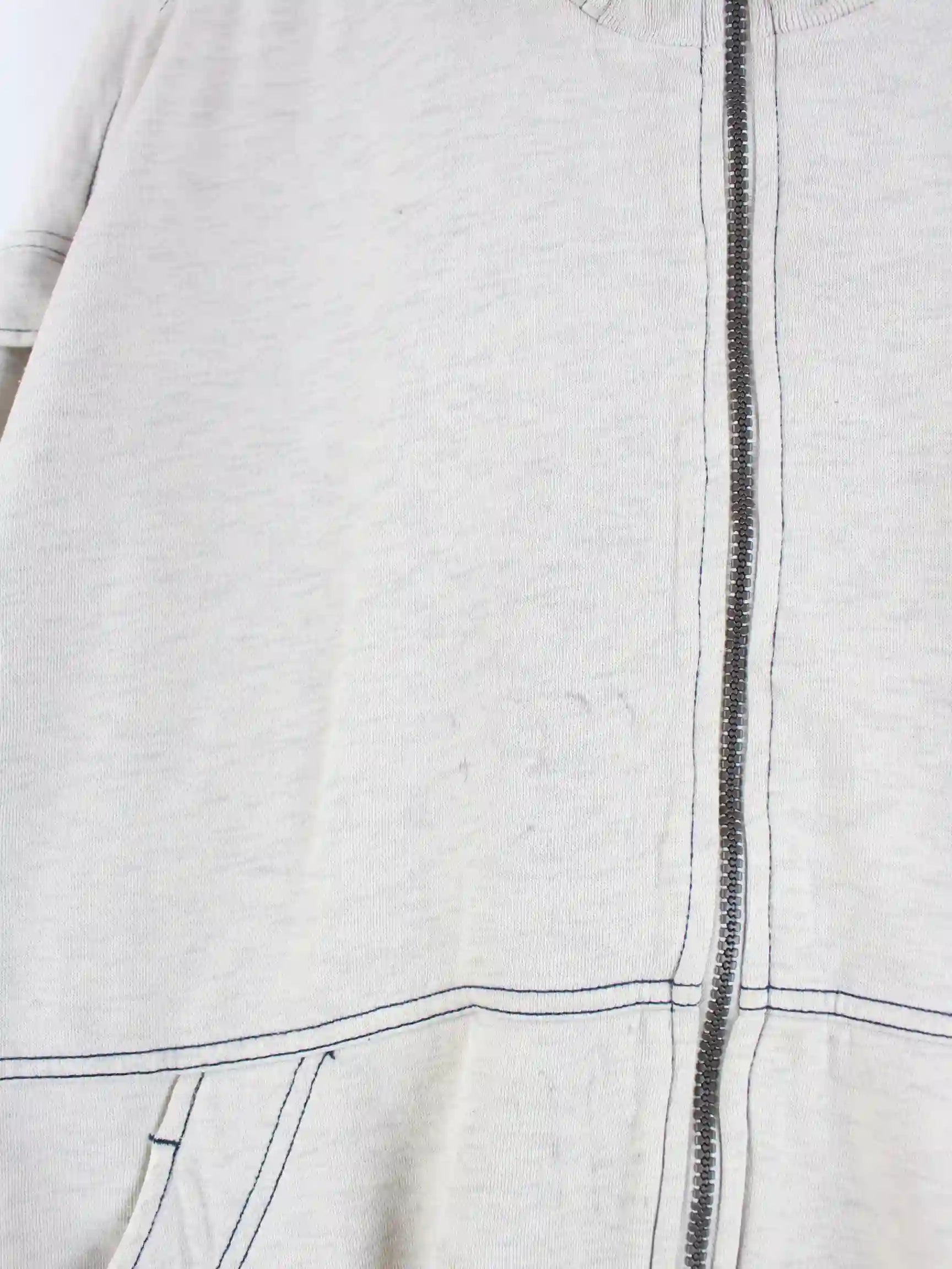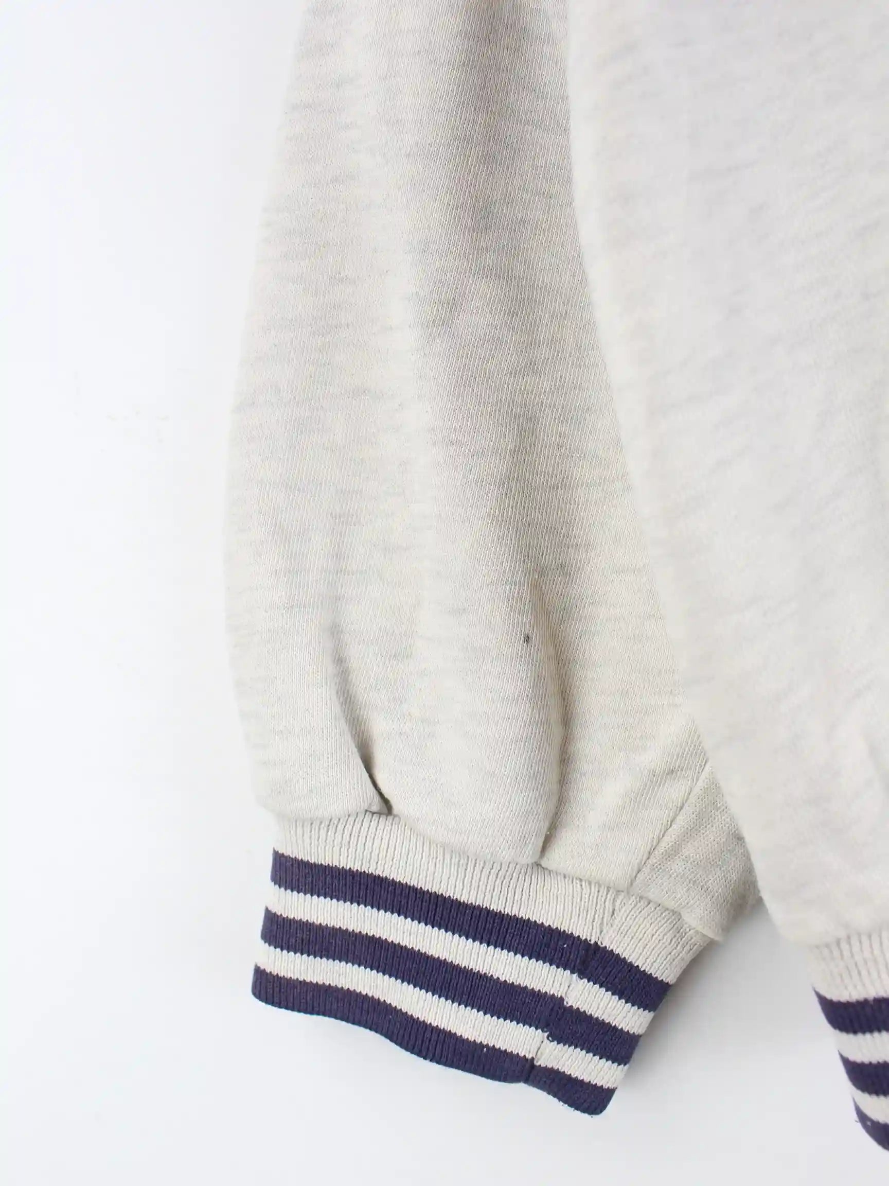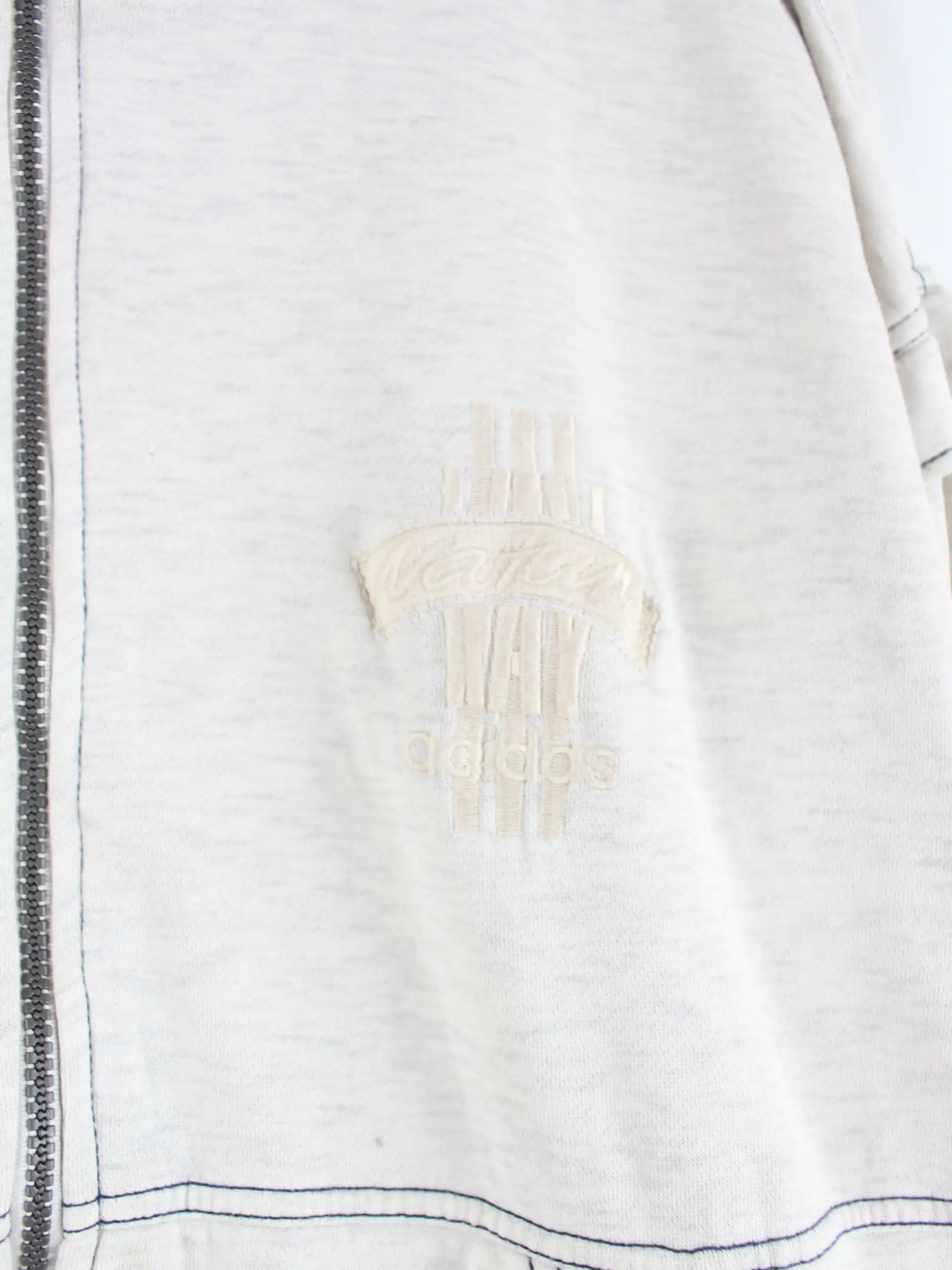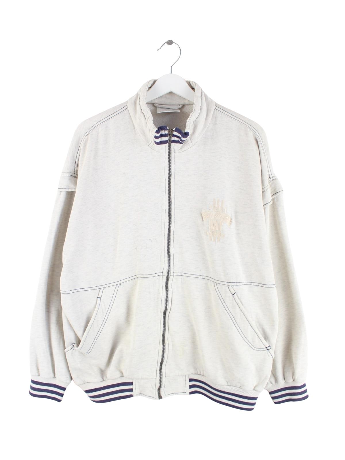 Sweatjacke vom Brand Adidas in Größe L aus den 80'ern. Sie ist aus einer Baumwollmischung gemacht und in Grau zu haben.
