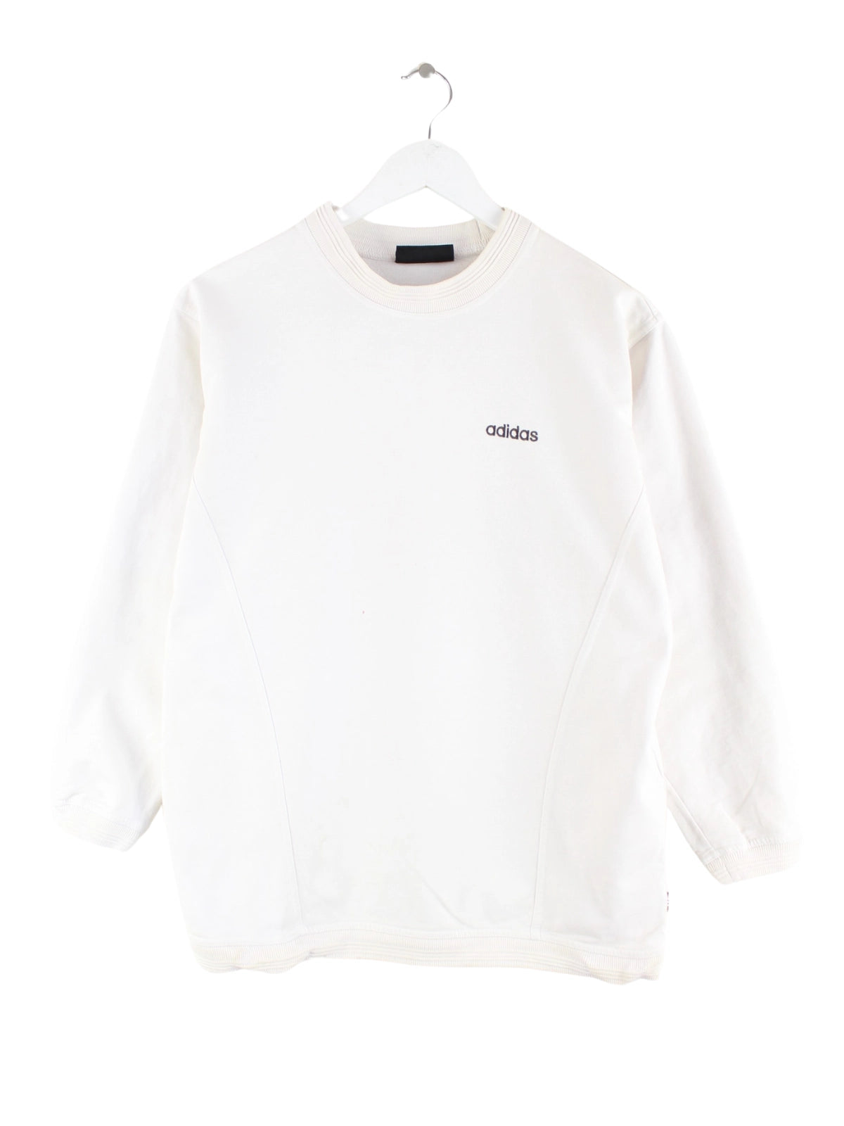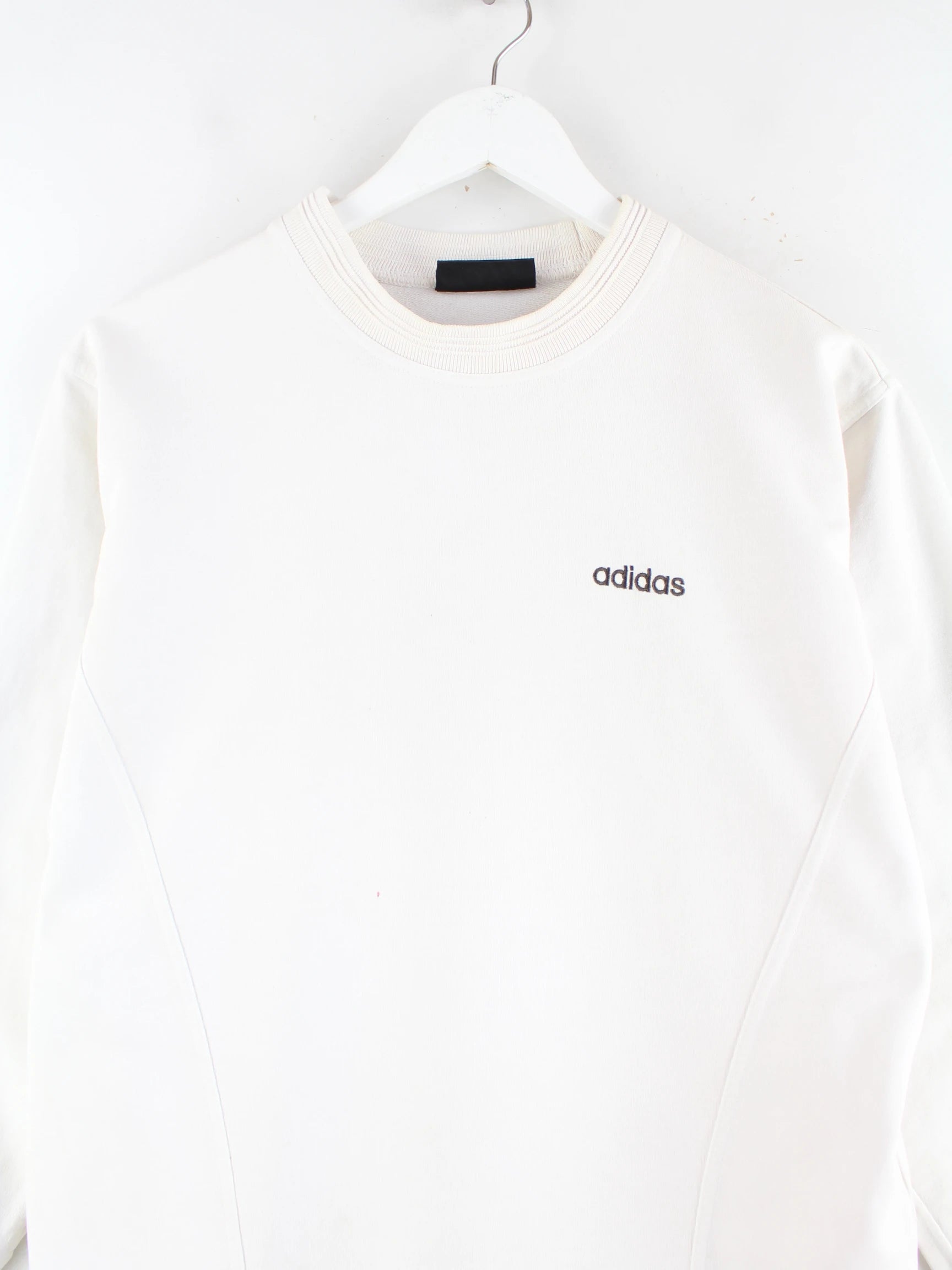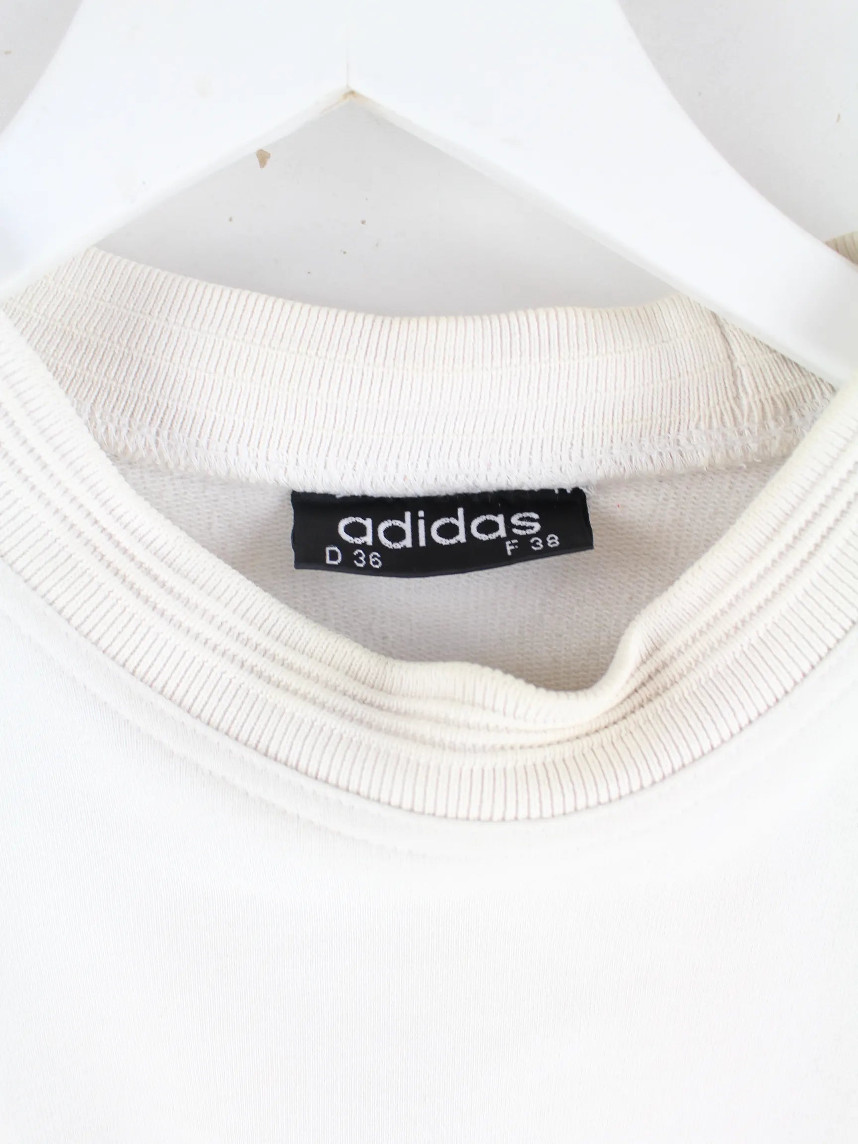 Weißer Sweater von Adidas aus den 90'ern in Größe S. Er ist aus einer Baumwollmischung angefertigt. Den Zustand würden wir als 'In Ordnung' bezeichnen (vergl. Bilder).