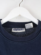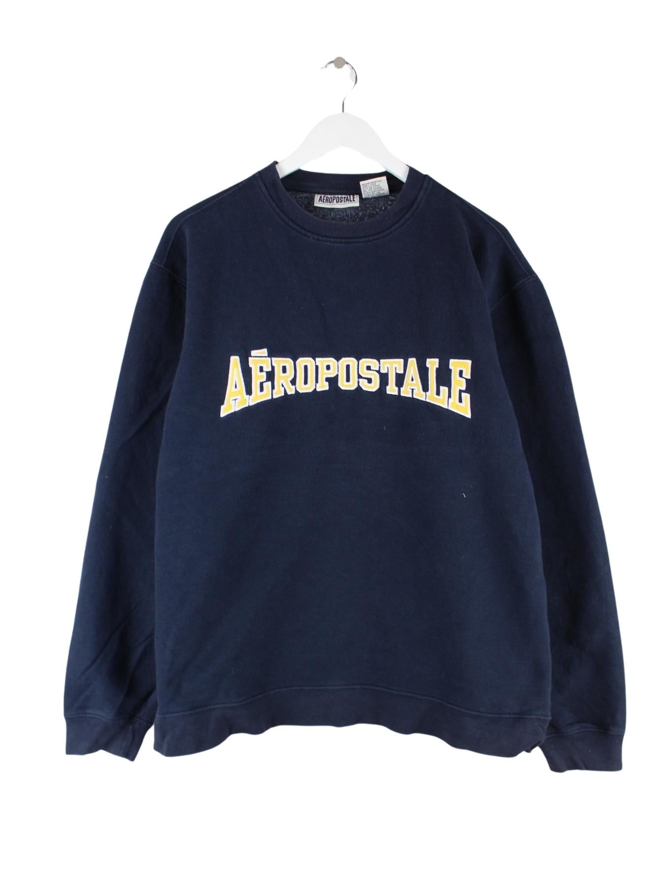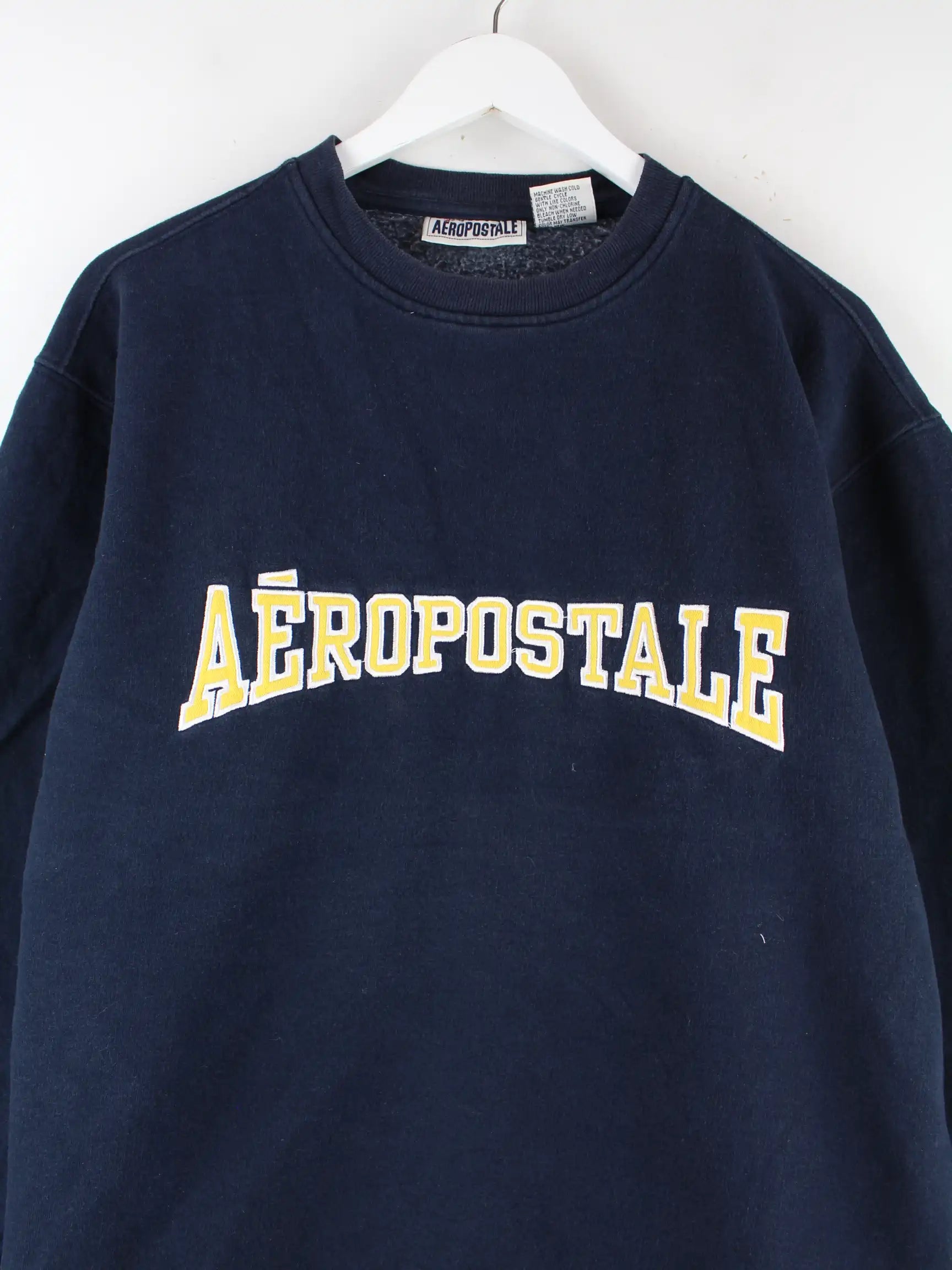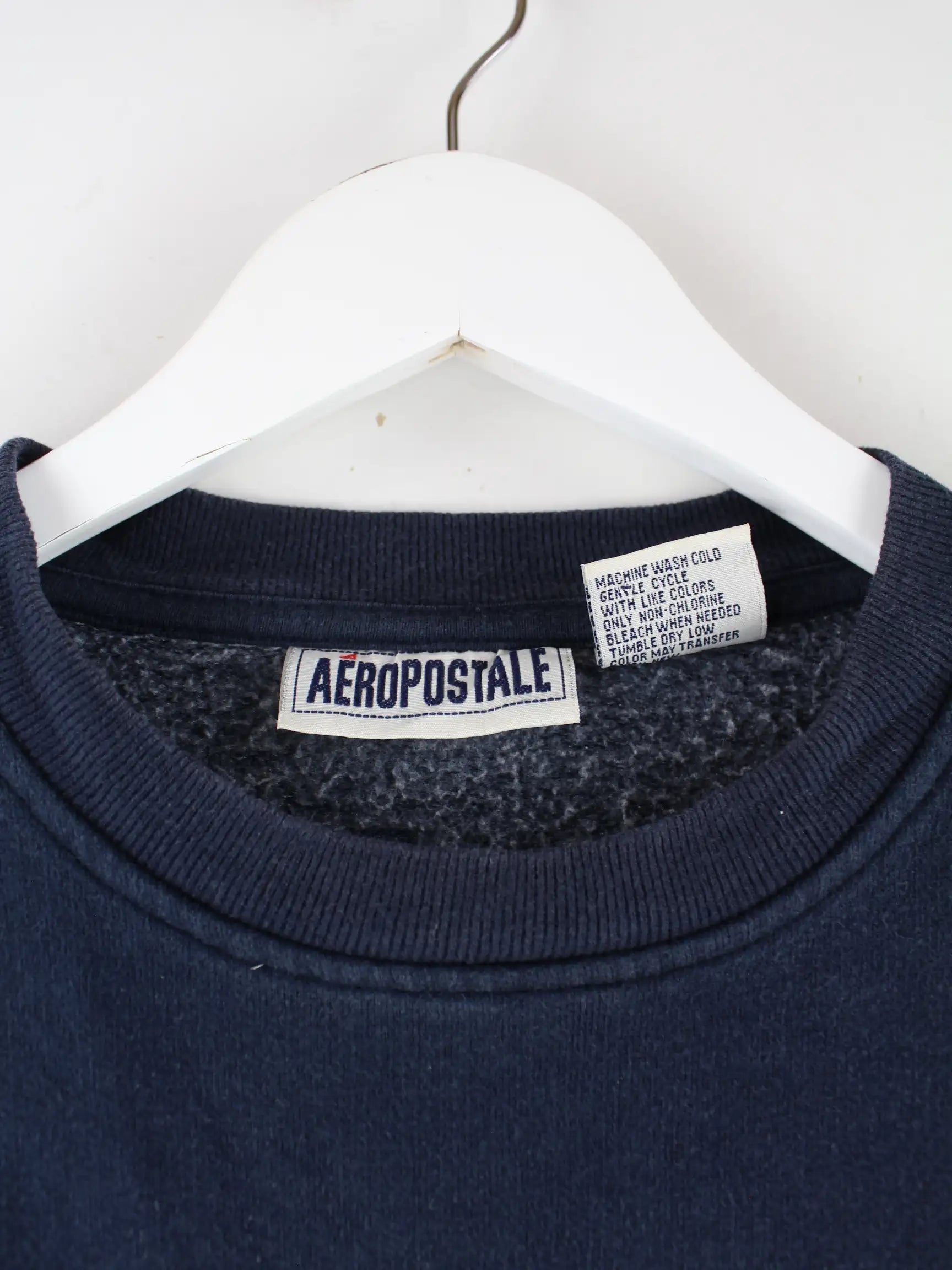 Blauer Sweater mit Stickereien der Brand Aeropostale in Größe M. Er ist aus einer Baumwollmischung gefertigt und in sehr gutem Zustand auf Lager.