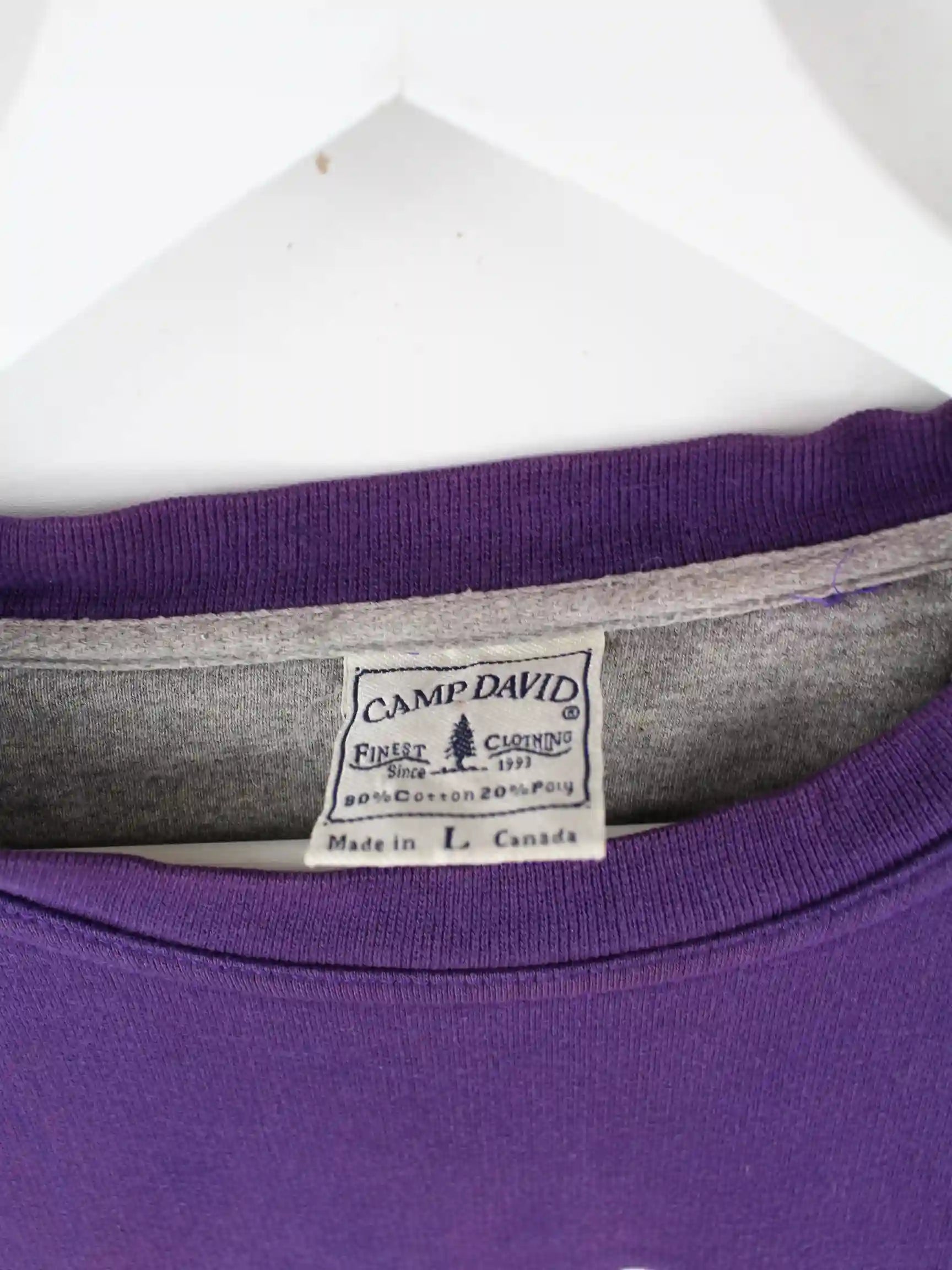 Lilafarbener Sweater mit gesticktem Logo von Camp David aus den 90'ern in Größe L. Er ist aus einer Baumwollmischung produziert und in gutem Zustand bei uns vorrätig.