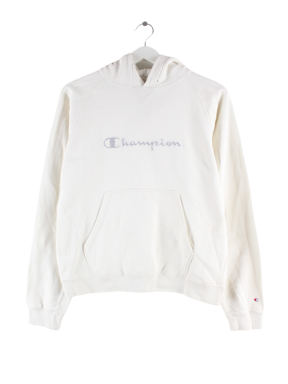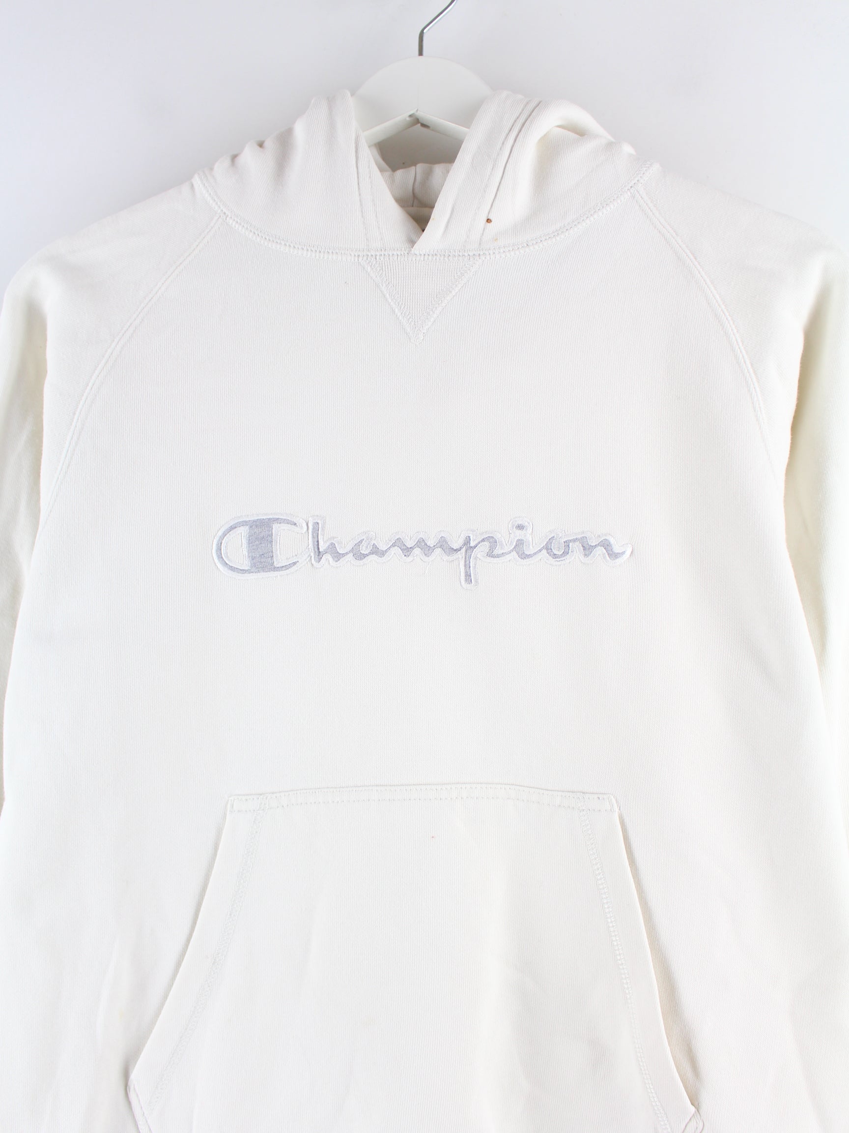 Hoodie der Marke Champion mit gesticktem Logo in Größe XS. Er ist aus einer Baumwollmischung angefertigt und in Weiß auf Lager.