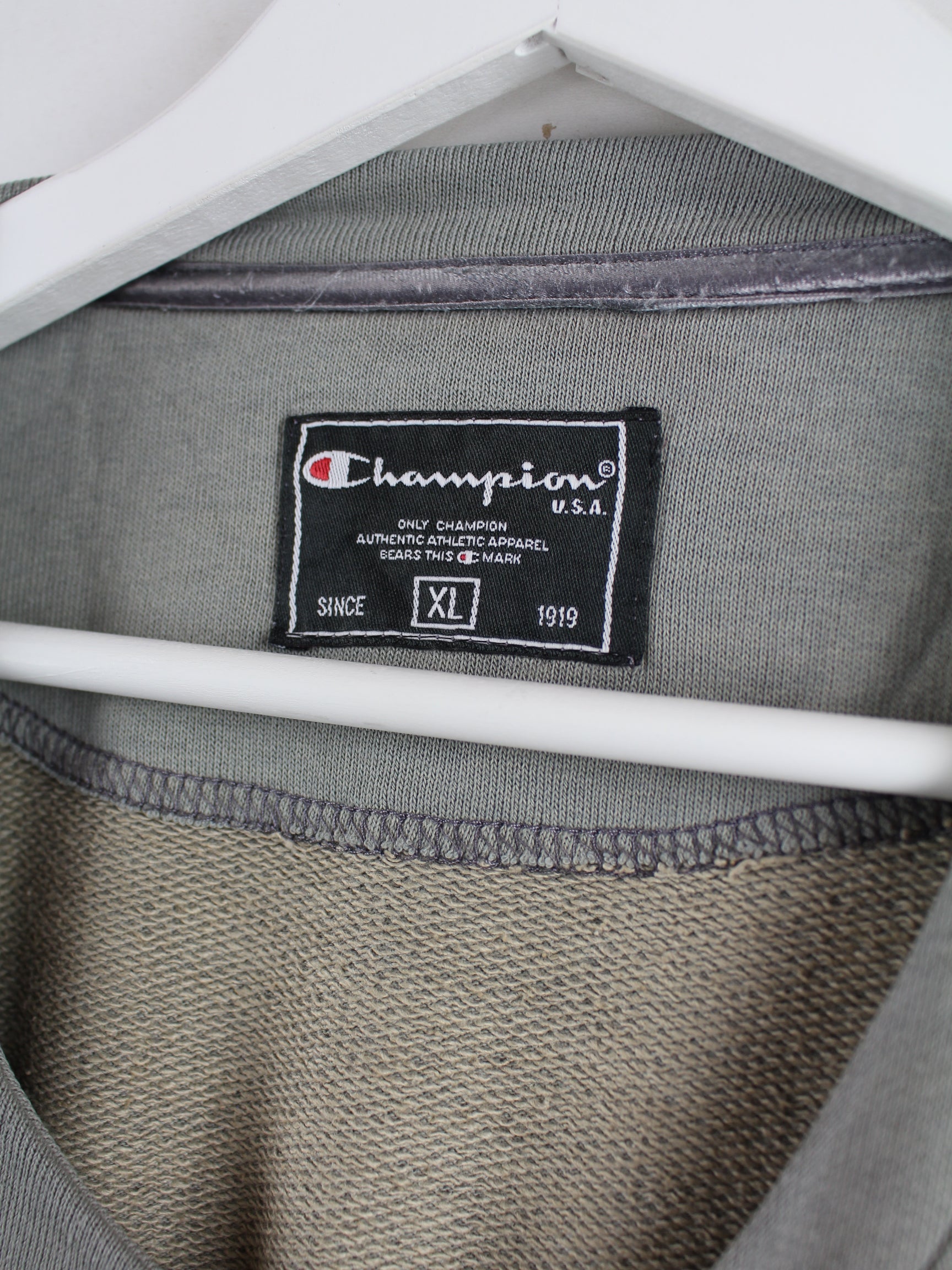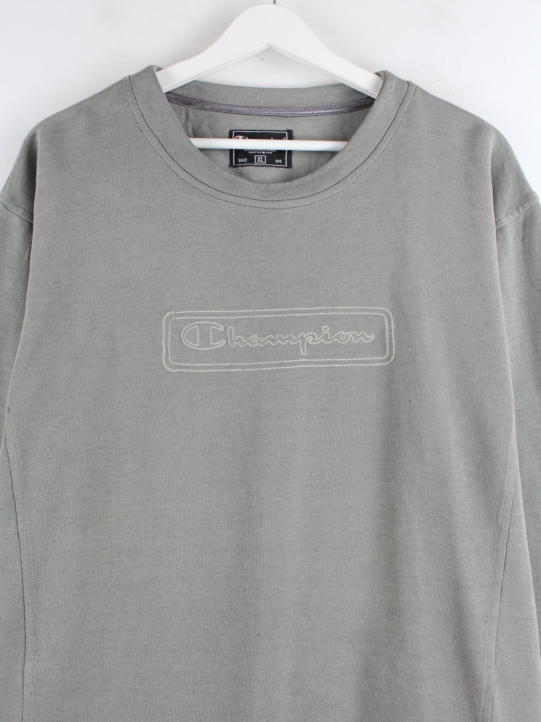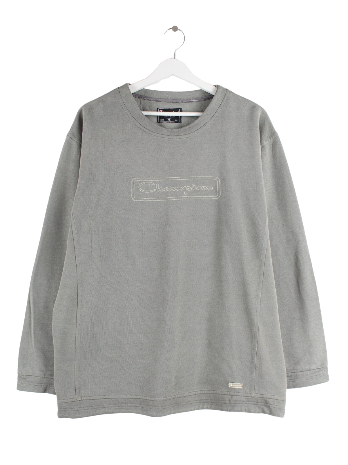 Sweater des Labels Champion mit Stick in Größe XL. Er ist aus einer Baumwollmischung hergestellt und in Grau in Stock.