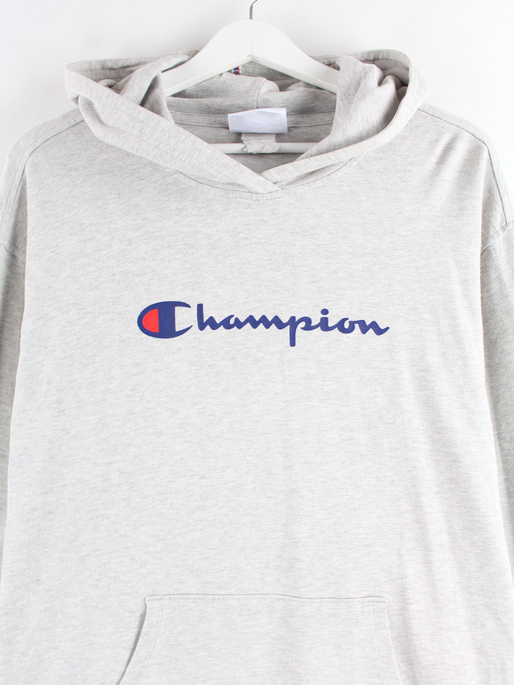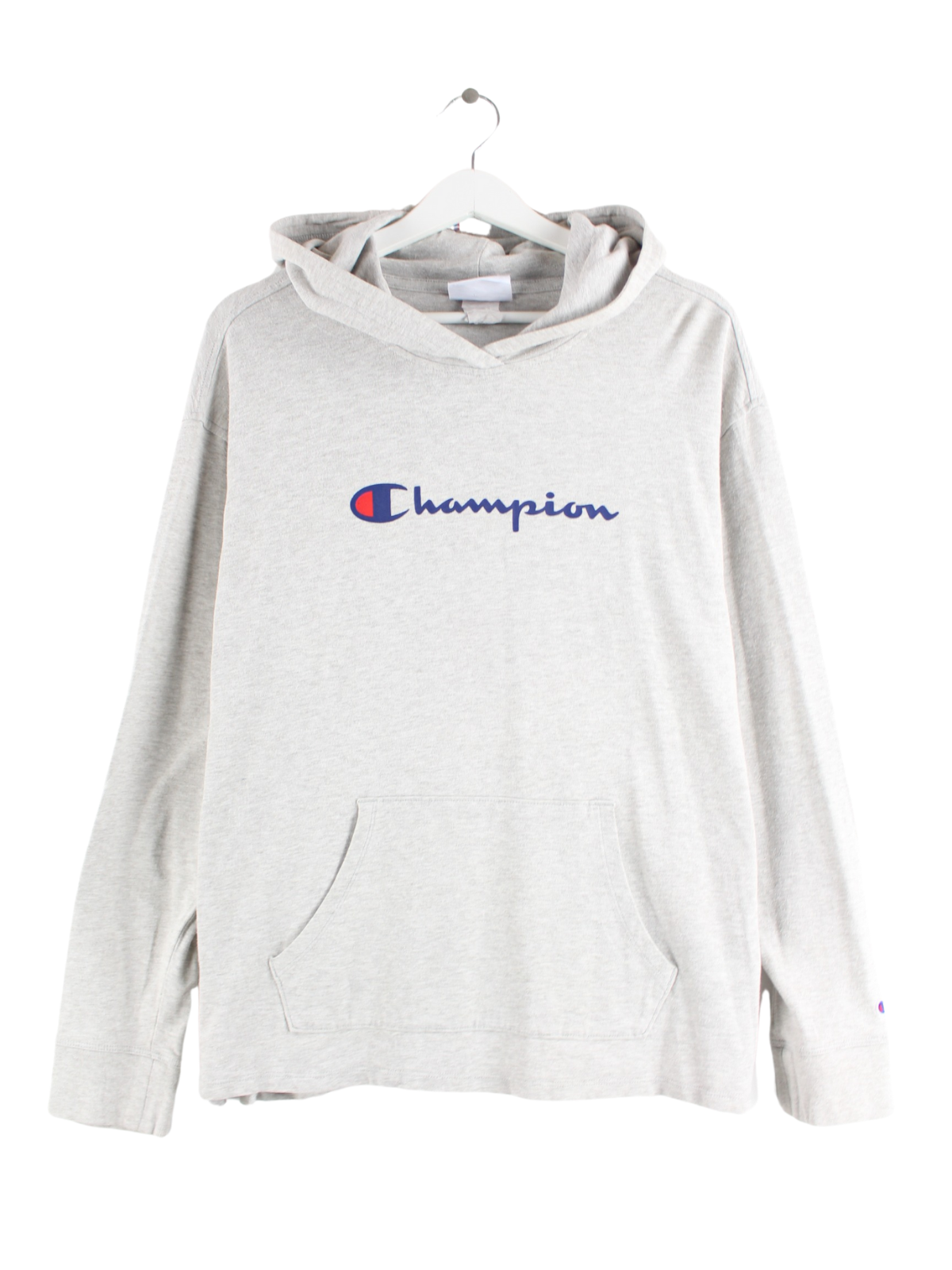 Grauer Hoodie aus dem Hause Champion in Größe XL. Er ist aus einer Baumwollmischung gefertigt und in gutem Zustand lieferbar. Mit schönem Print.