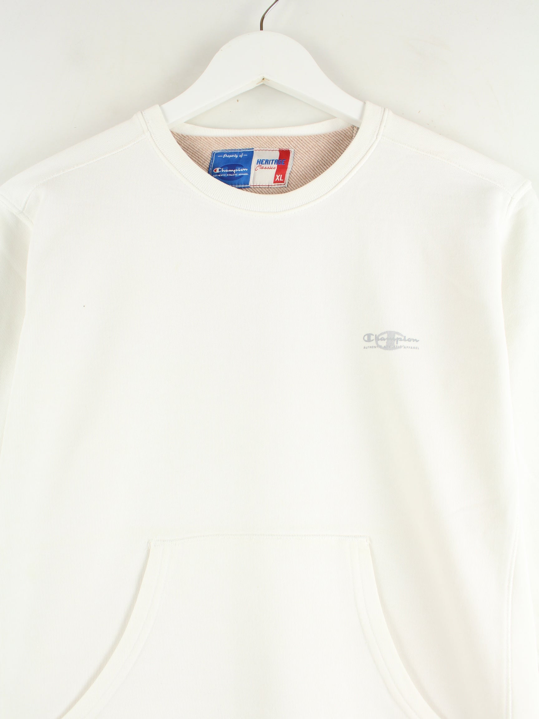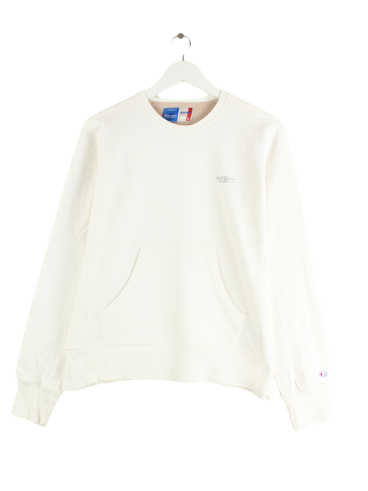 Weißer Sweater der Marke Champion in Größe L. Er ist aus einer Baumwollmischung produziert und in gutem Zustand im Angebot. Mit seltenem Print.