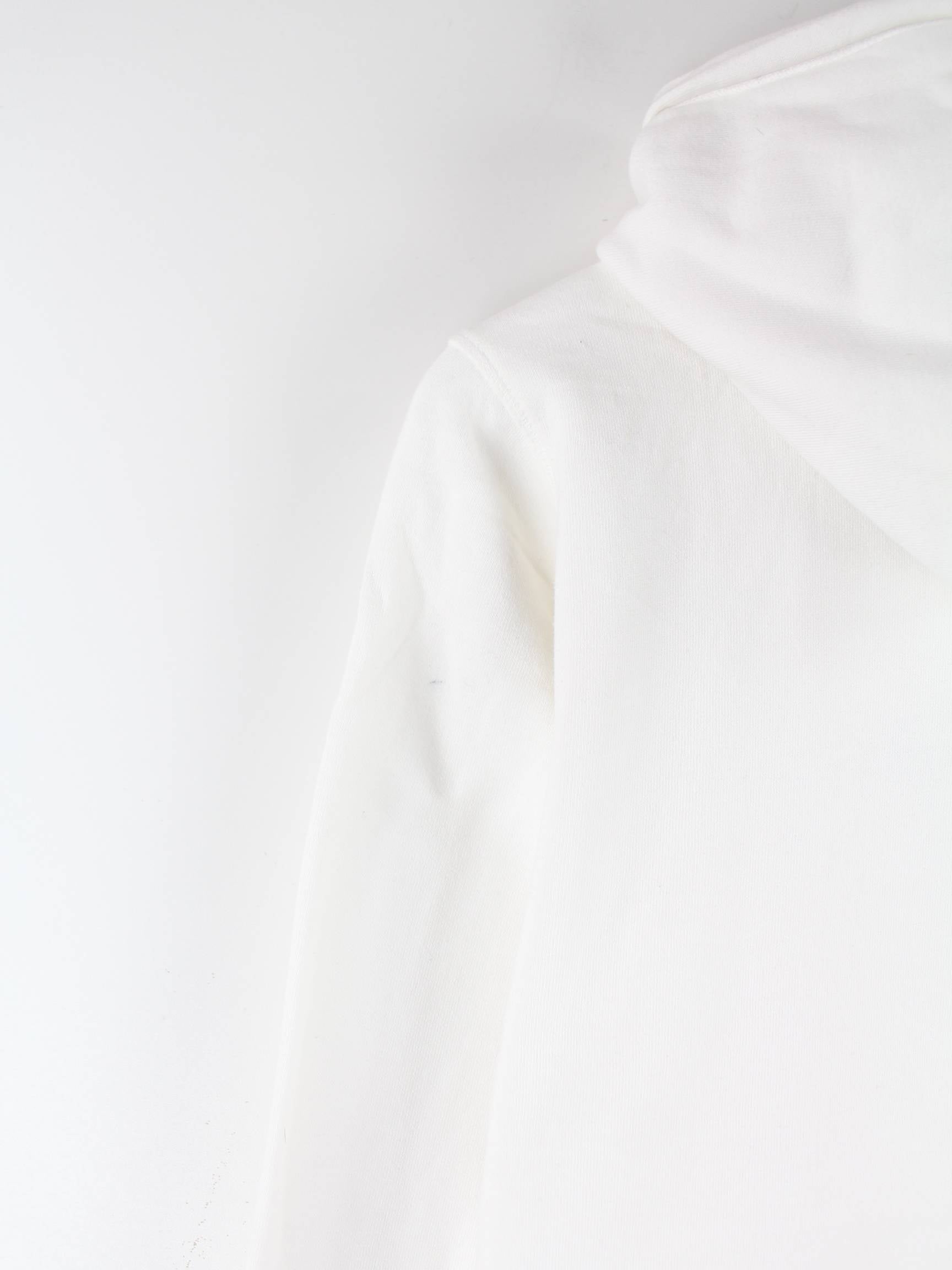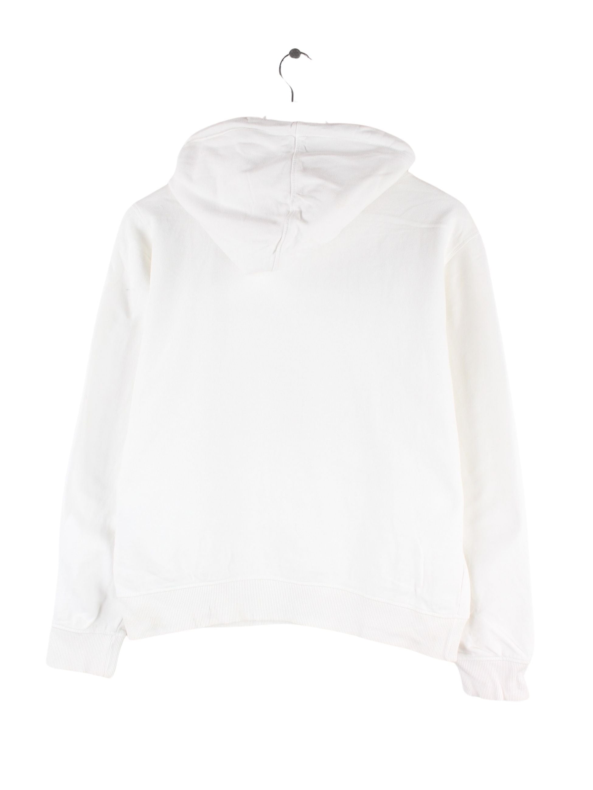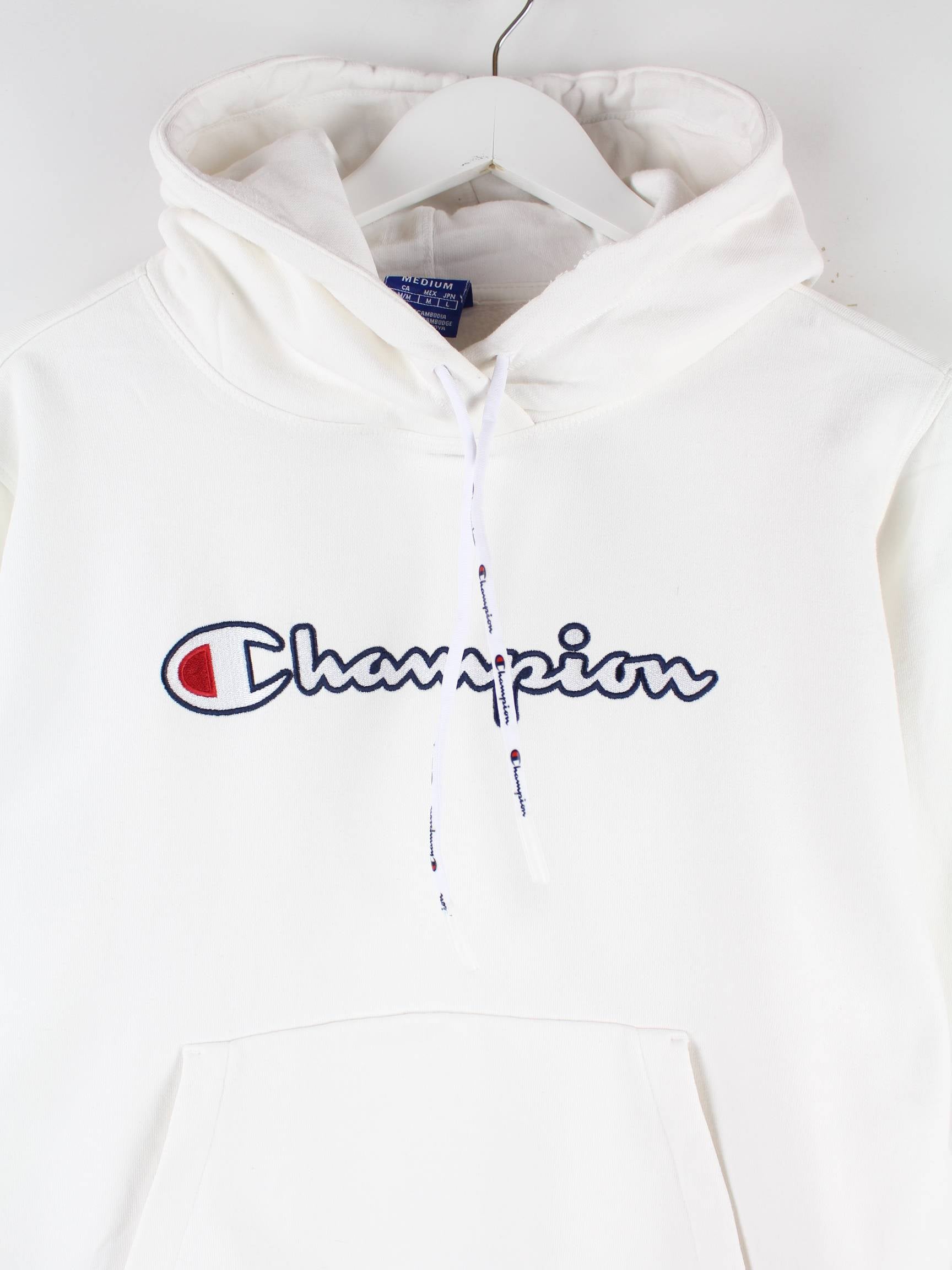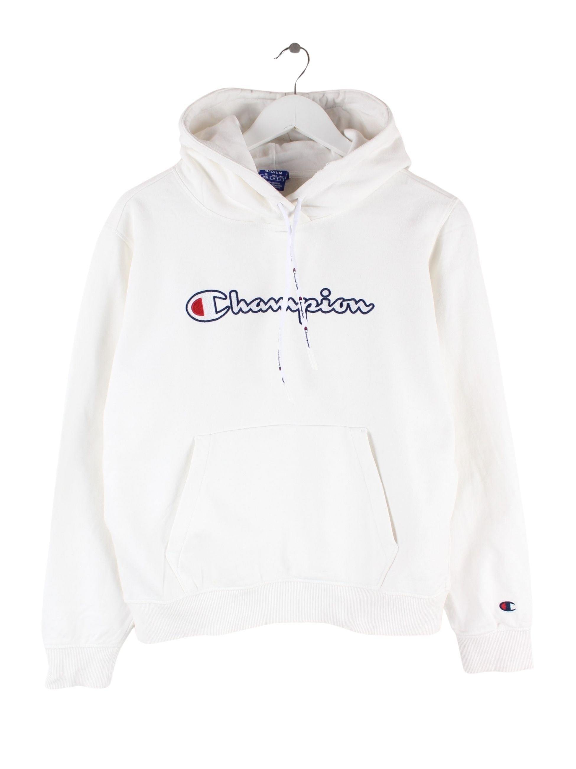 Hoodie des Labels Champion mit Stickereien in Größe M. Er ist aus einer Baumwollmischung gemacht und in Weiß vorrätig.