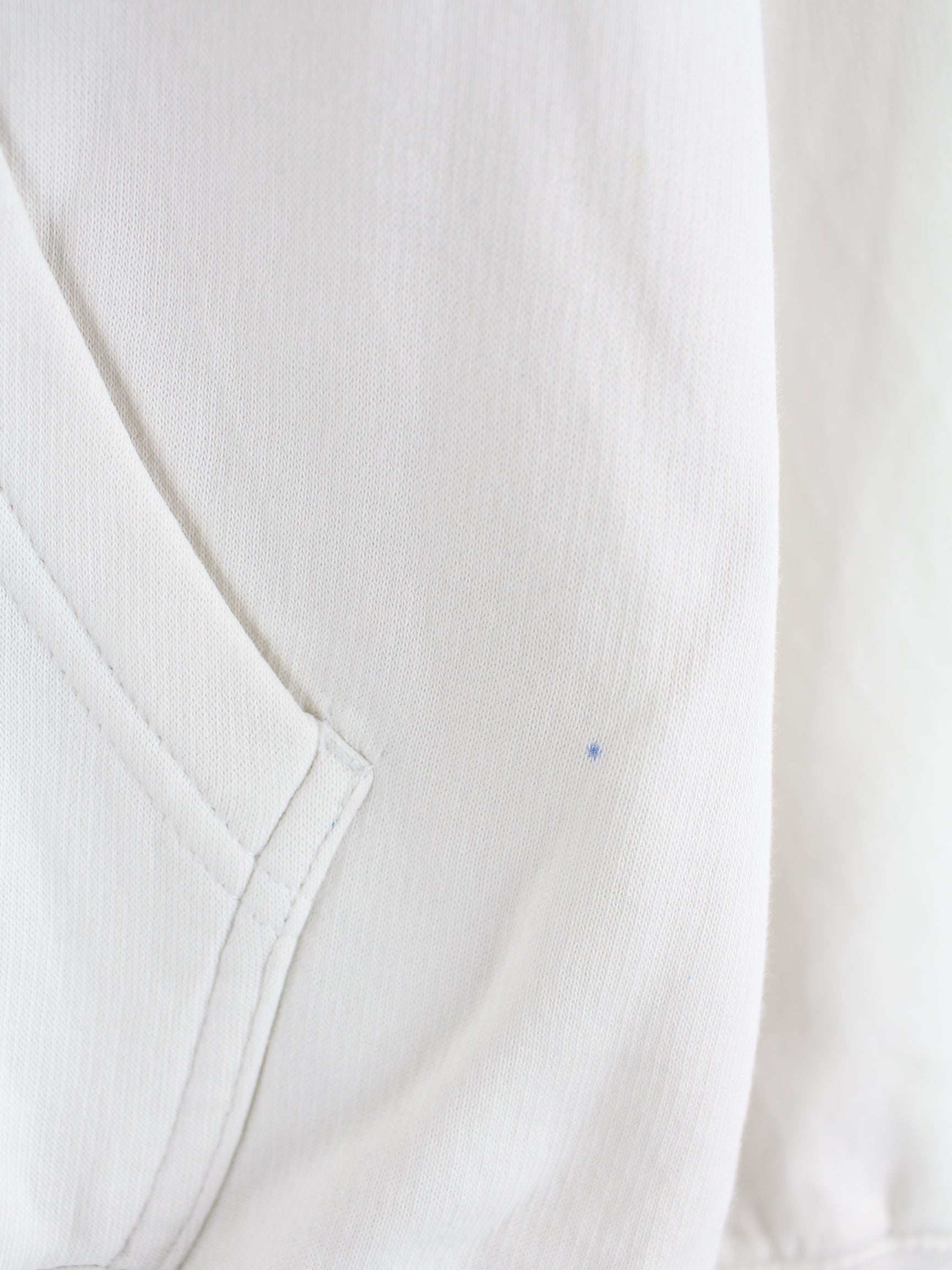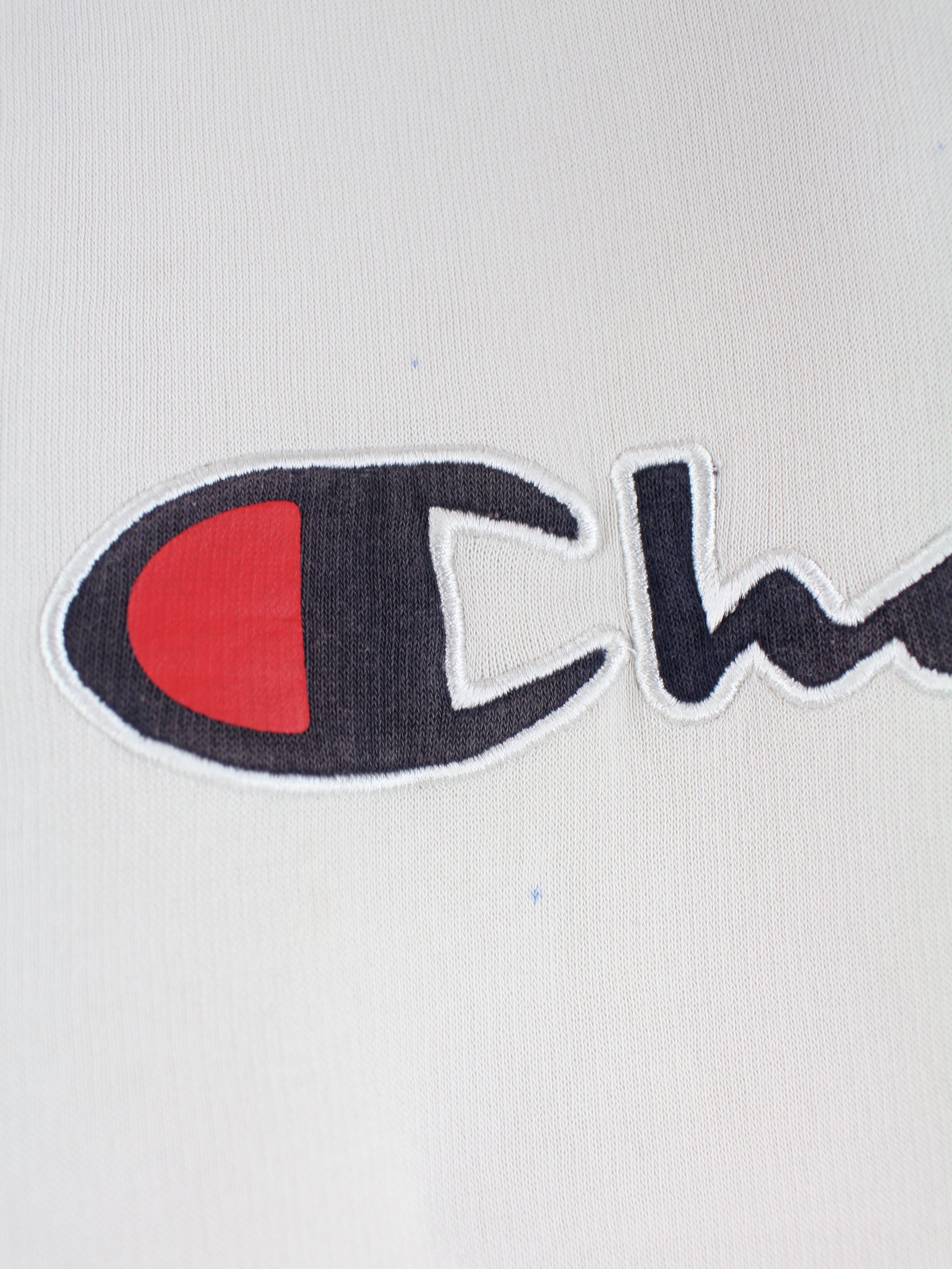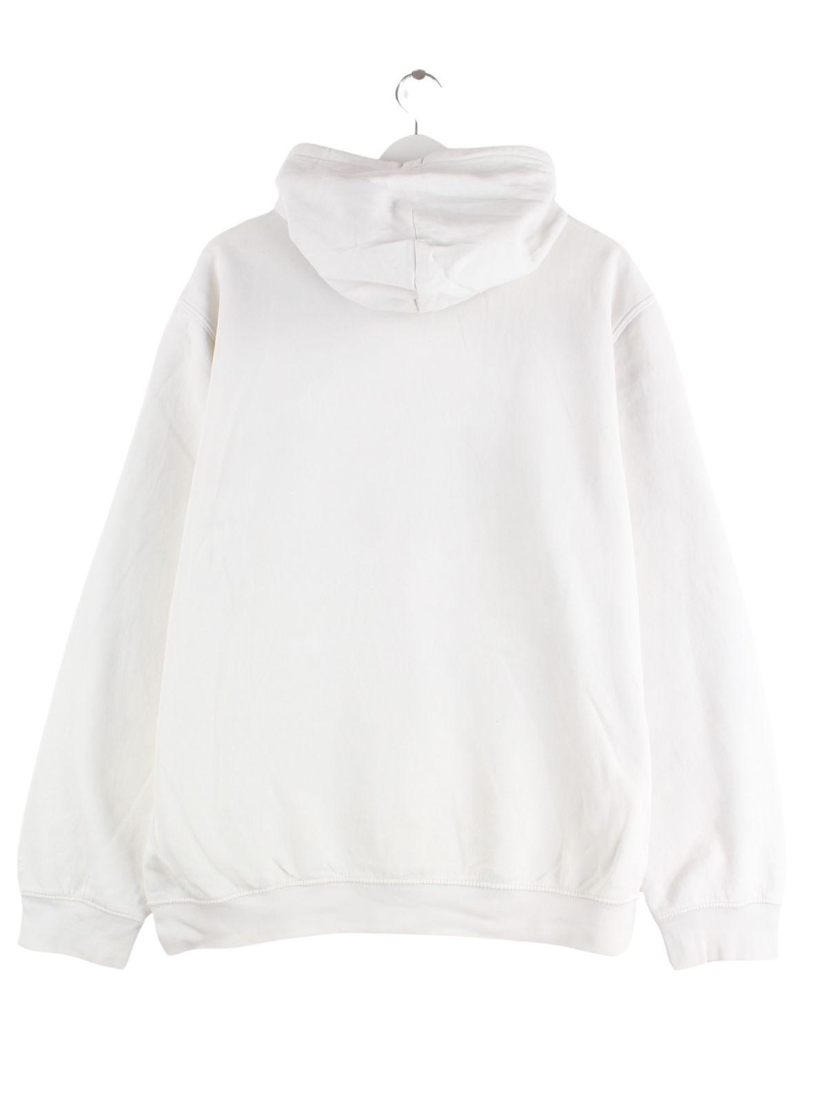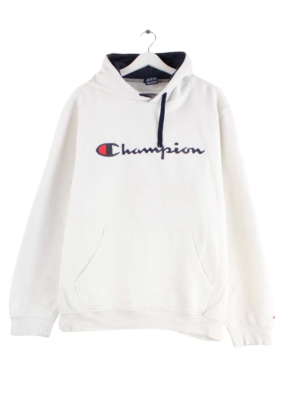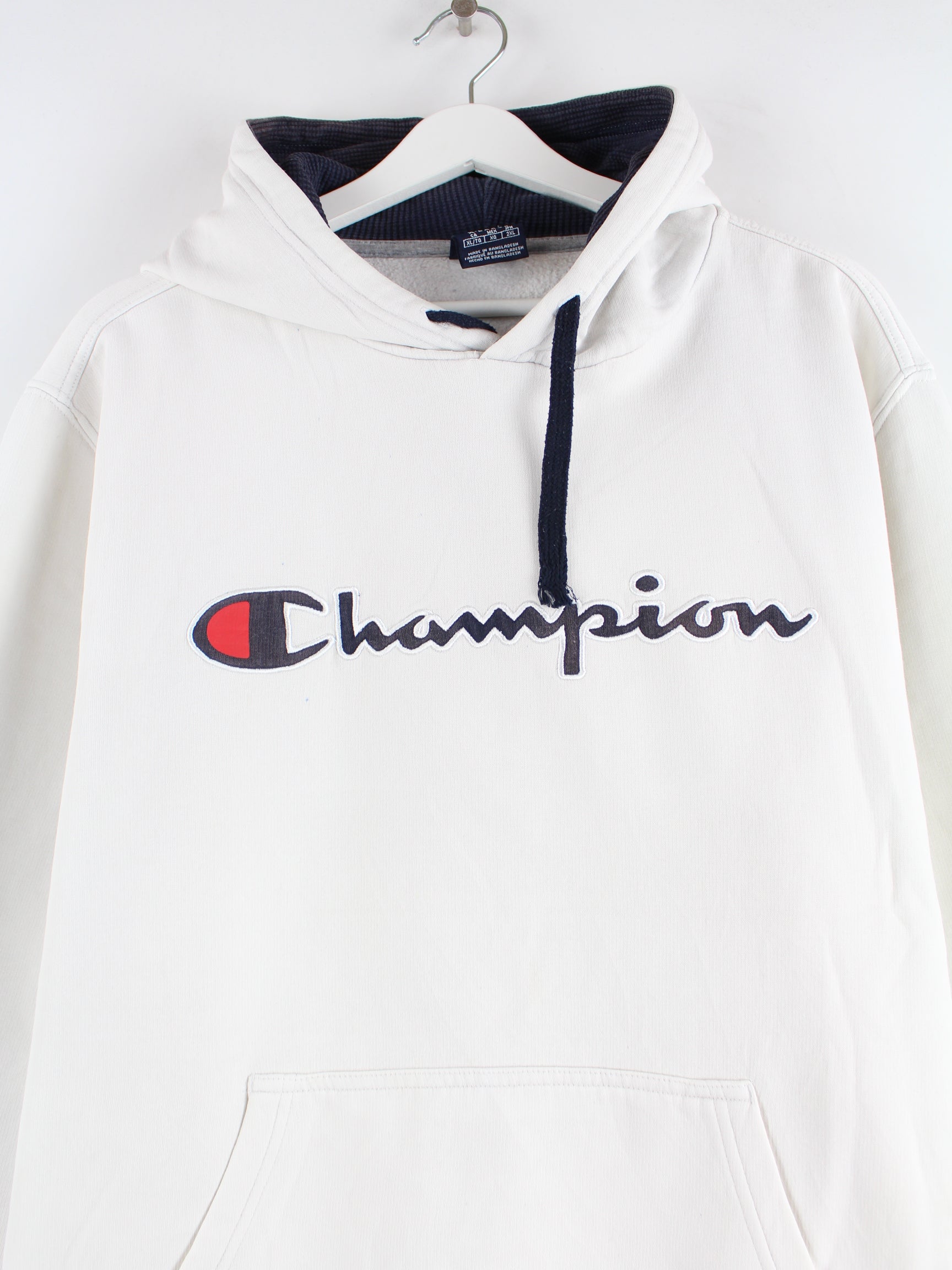 Hoodie der Marke Champion mit Stickereien in Größe XL. Er ist aus einer Baumwollmischung angefertigt und in Weiß zu haben.
