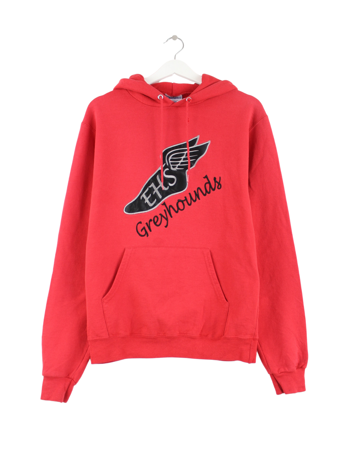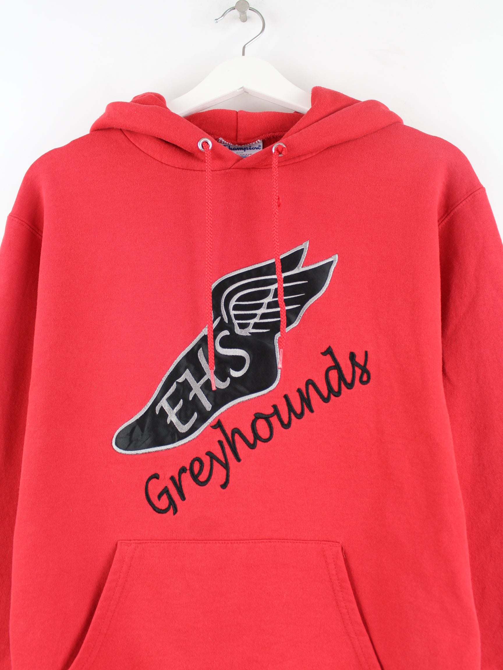 Hoodie von Champion mit gesticktem Logo in Größe S. Er ist aus einer Baumwollmischung hergestellt und in Rot lieferbar.