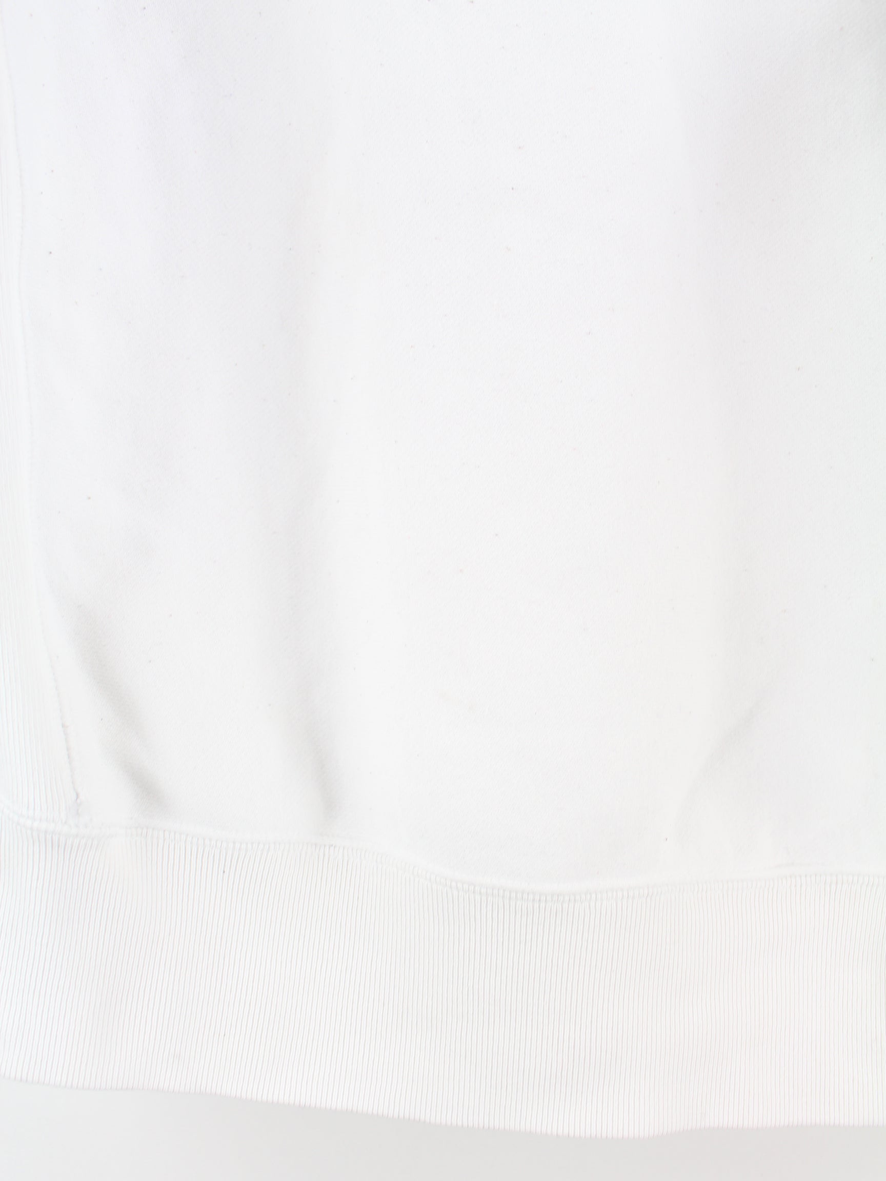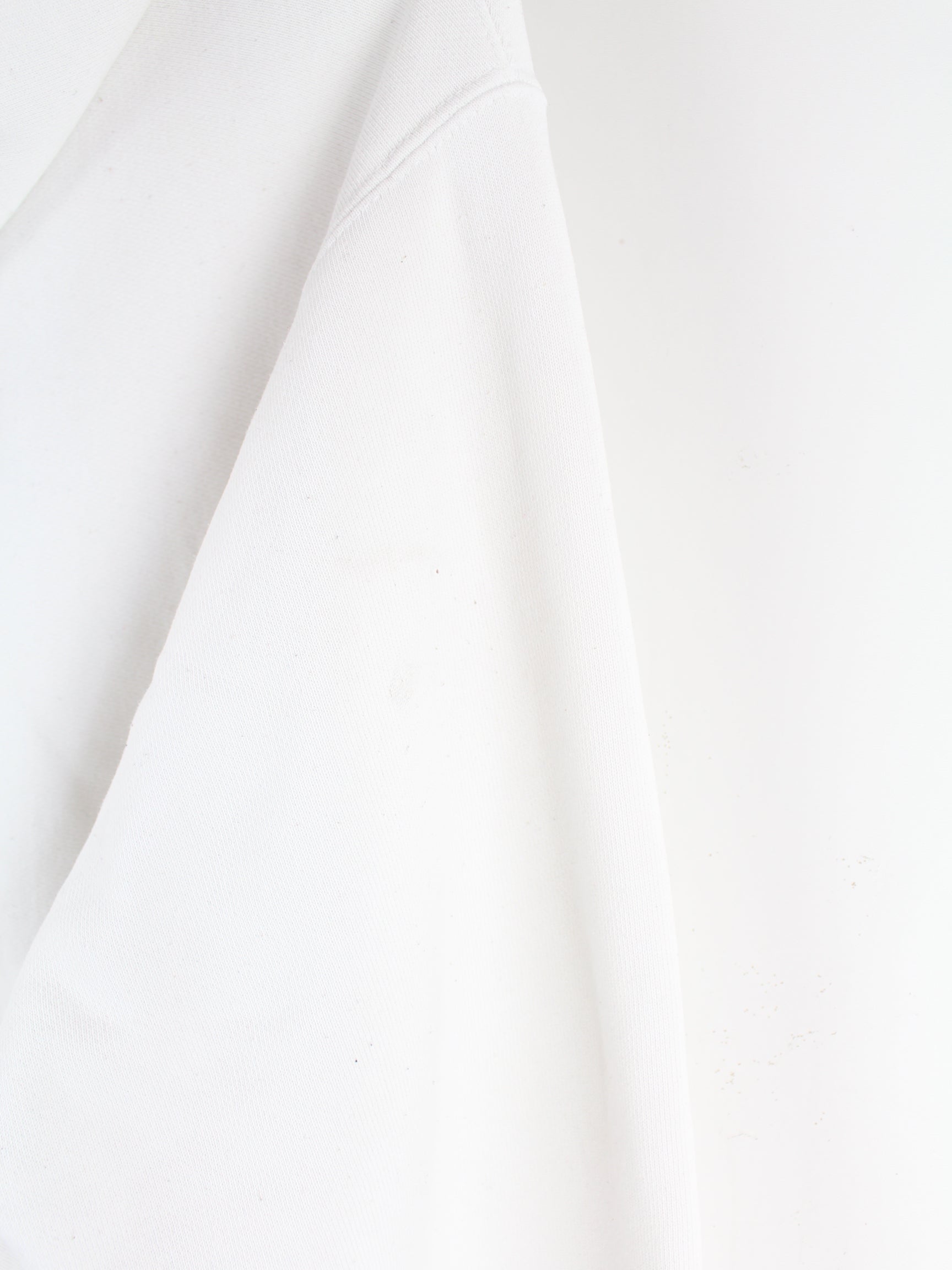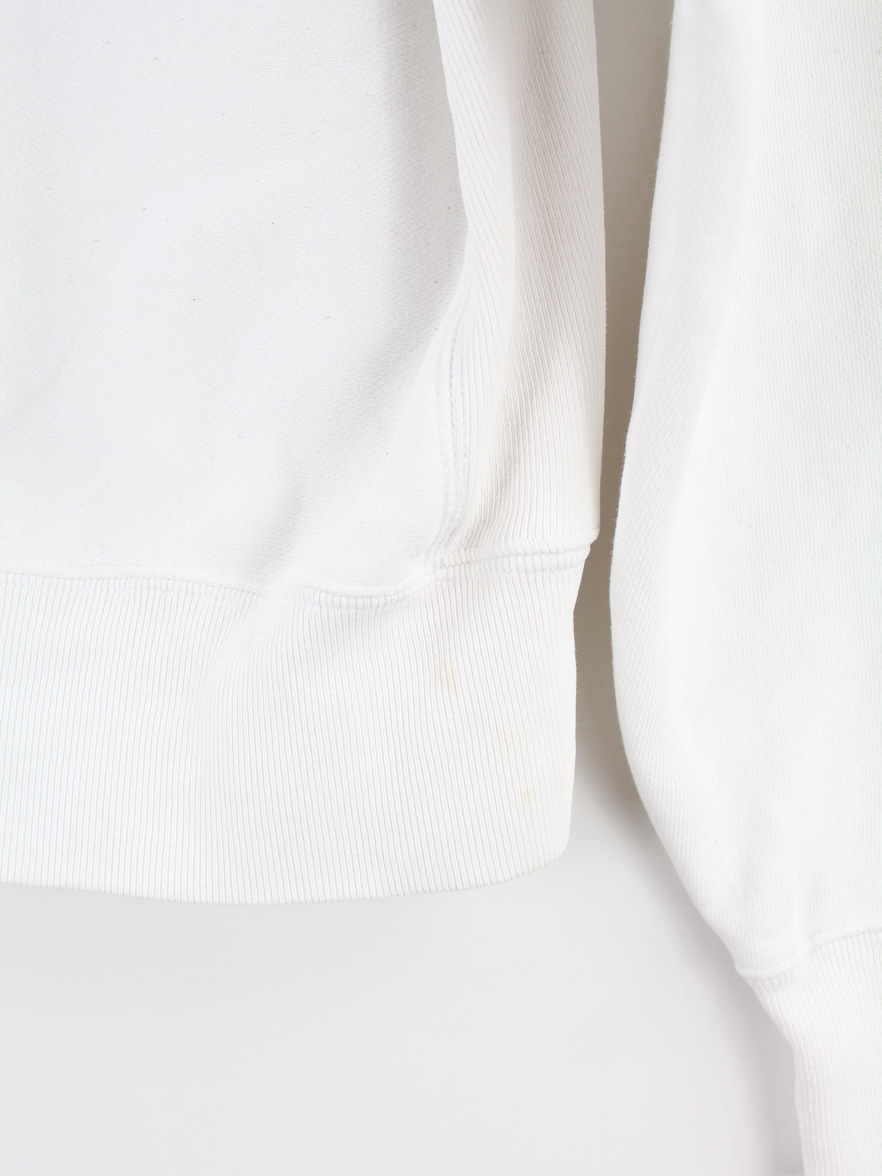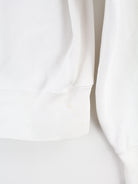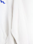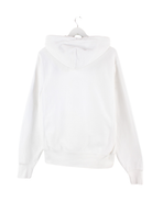 Weißer Hoodie mit Stickereien des Labels Champion in Größe S. Er ist aus einer Baumwollmischung gemacht. Den Zustand würden wir als 'In Ordnung' bezeichnen (vergl. Bilder).