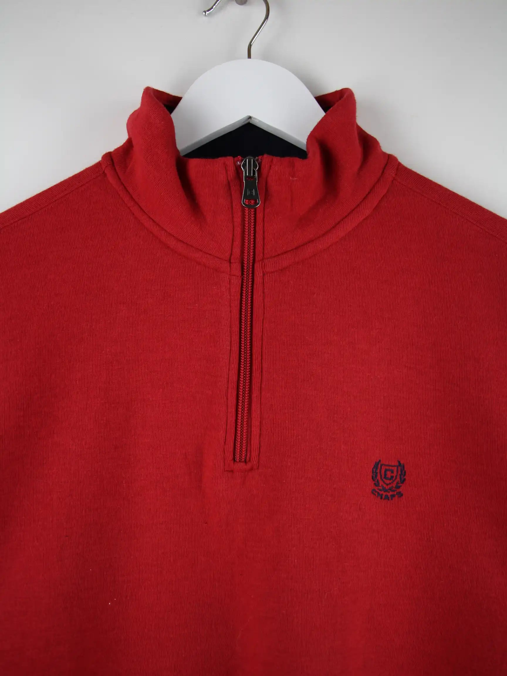 Roter Sweater mit kurzem Reißverschluß aus dem Hause Chaps by Ralph Lauren in Größe L. Er ist aus einer Baumwollmischung gefertigt und in sehr gutem Zustand bei uns zu bekommen.