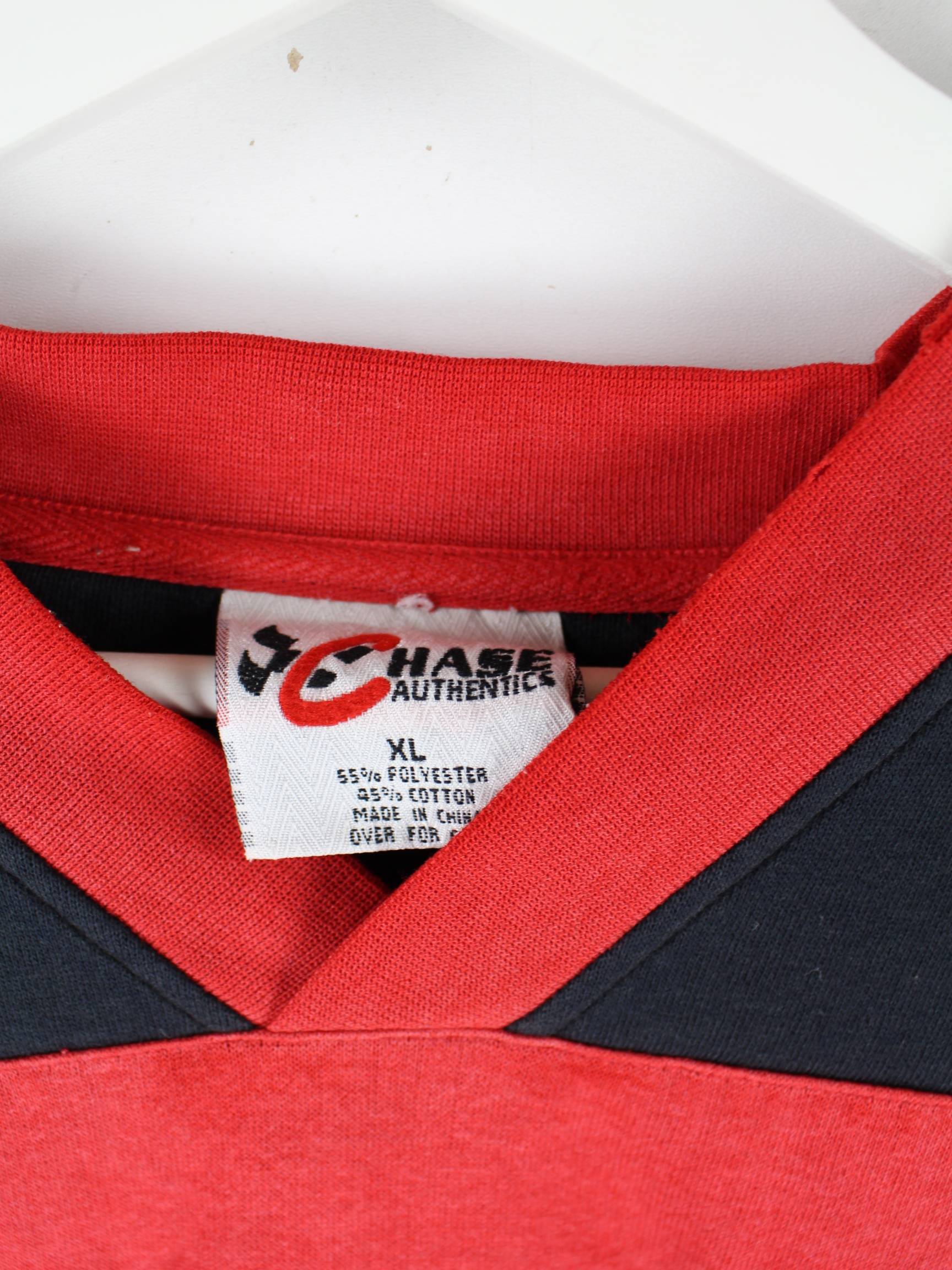 Sweater des Labels Chase mit Stick in Größe XL aus den 90'ern. Er ist aus einer Baumwollmischung produziert und in Rot bei uns zu bekommen.