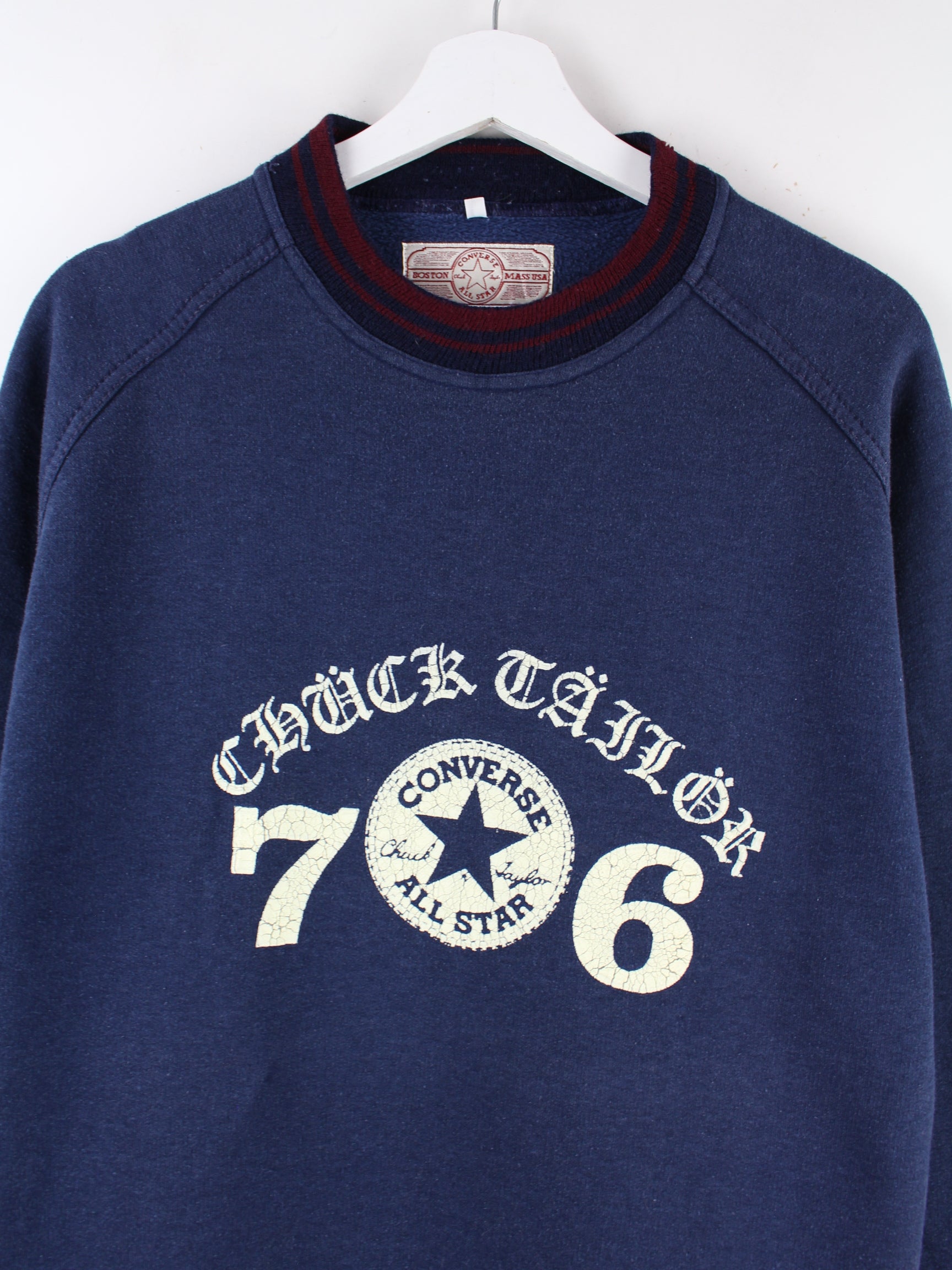 Sweater vom Brand Converse in Größe XXL. Er ist aus einer Baumwollmischung gefertigt und in Blau in Stock. Mit seltenem 00s Print.