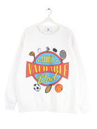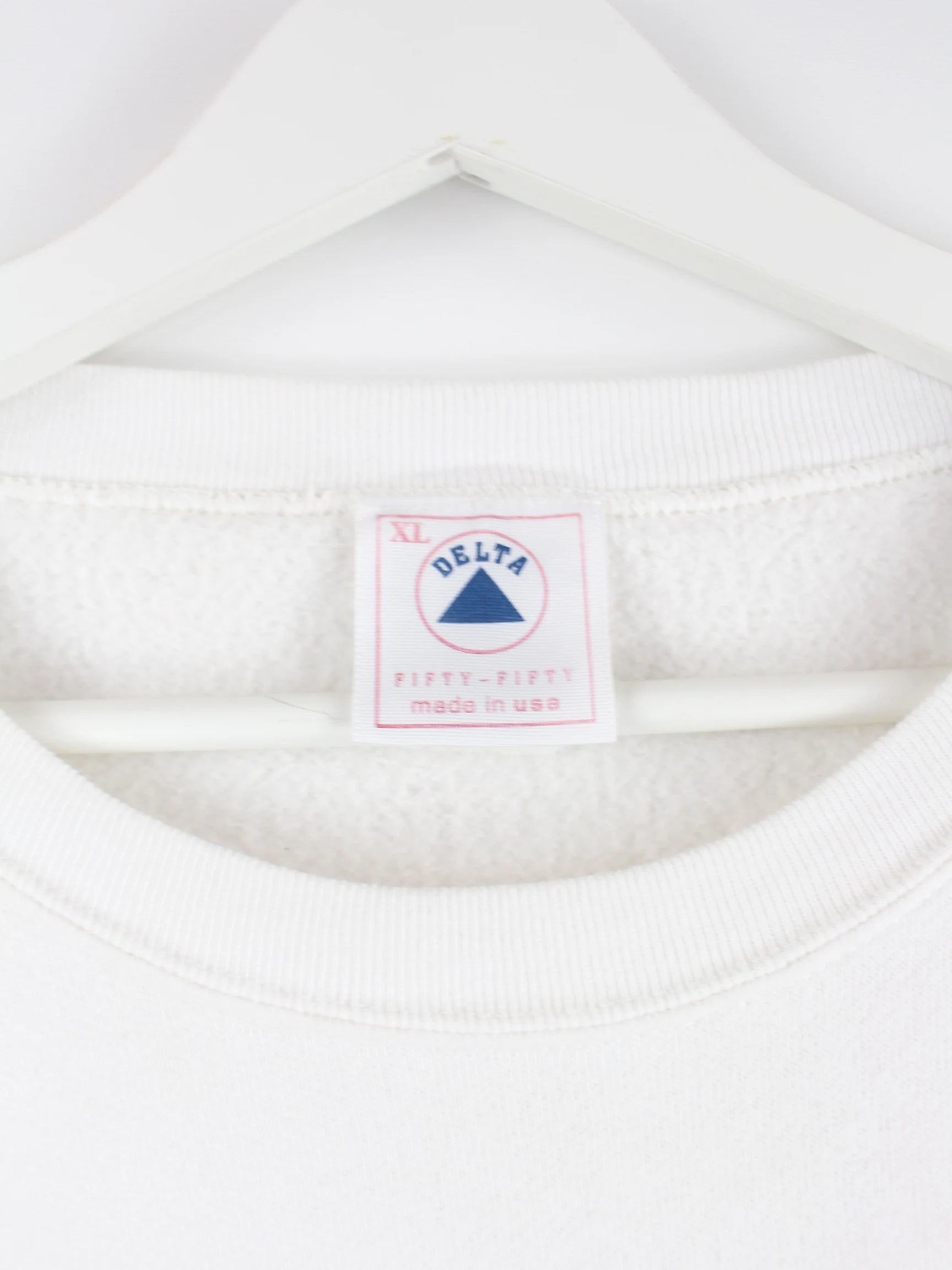 Sweater der Marke Delta in Größe XL aus den 90'ern. Er ist aus einer Baumwollmischung hergestellt und in Weiß auf Lager. Mit seltenem Games Print.