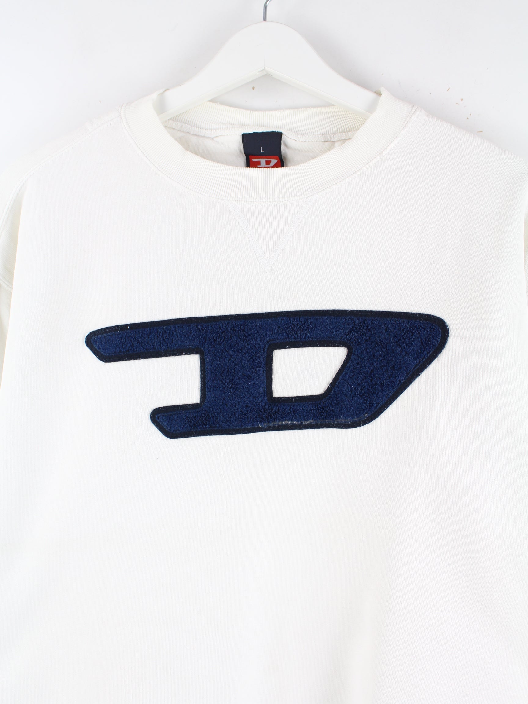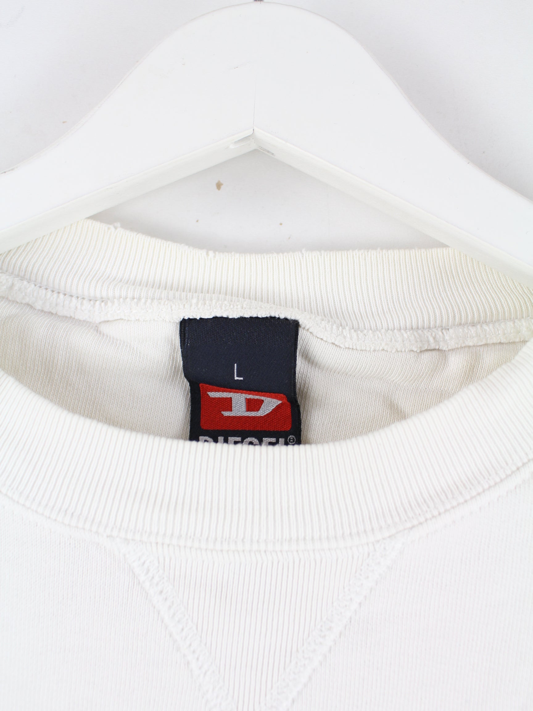 Sweater der Marke Diesel mit gestickten Motiven in Größe L aus den 90'ern. Er ist aus einer Baumwollmischung gefertigt und in Weiß im Bestand.