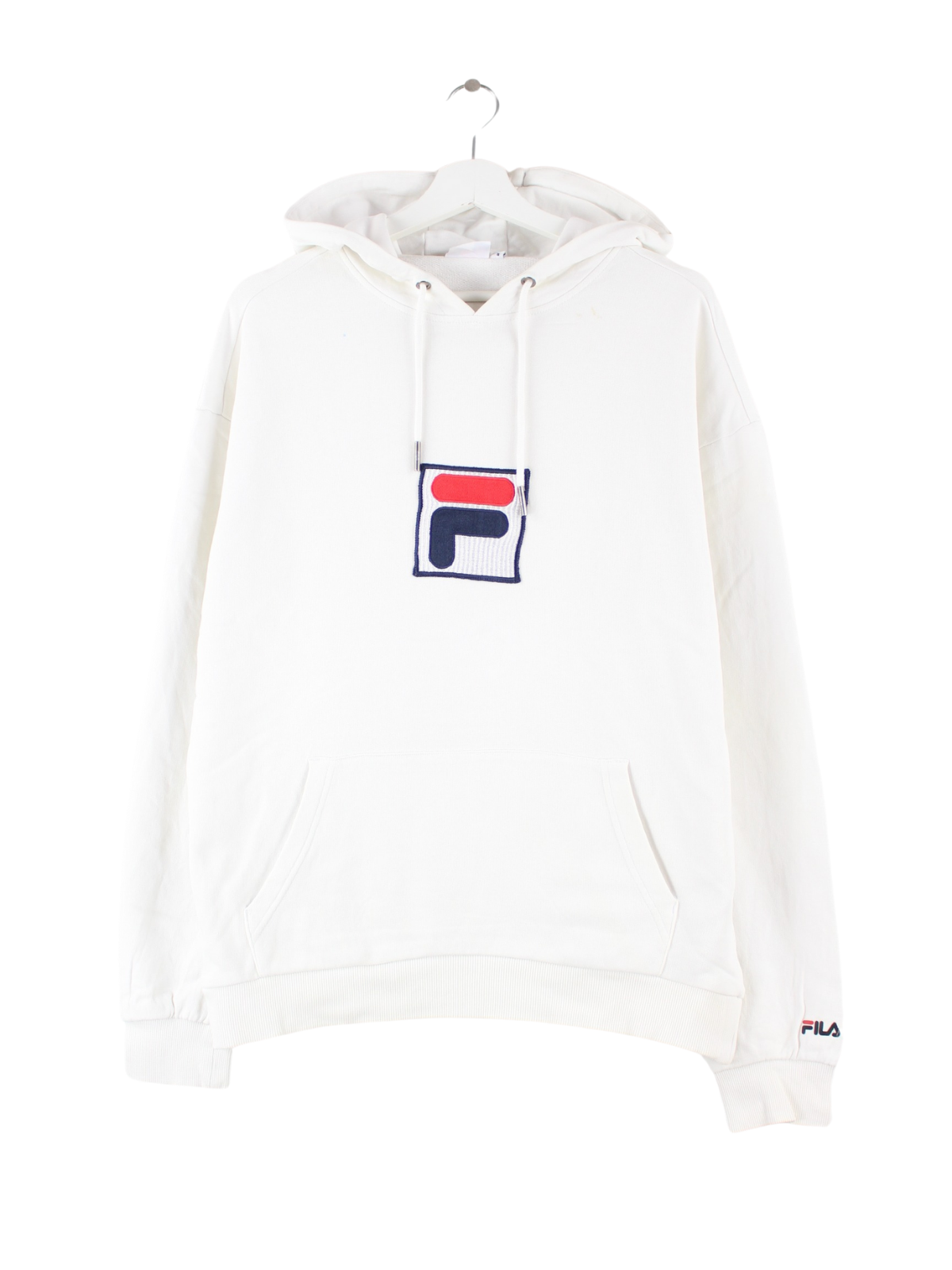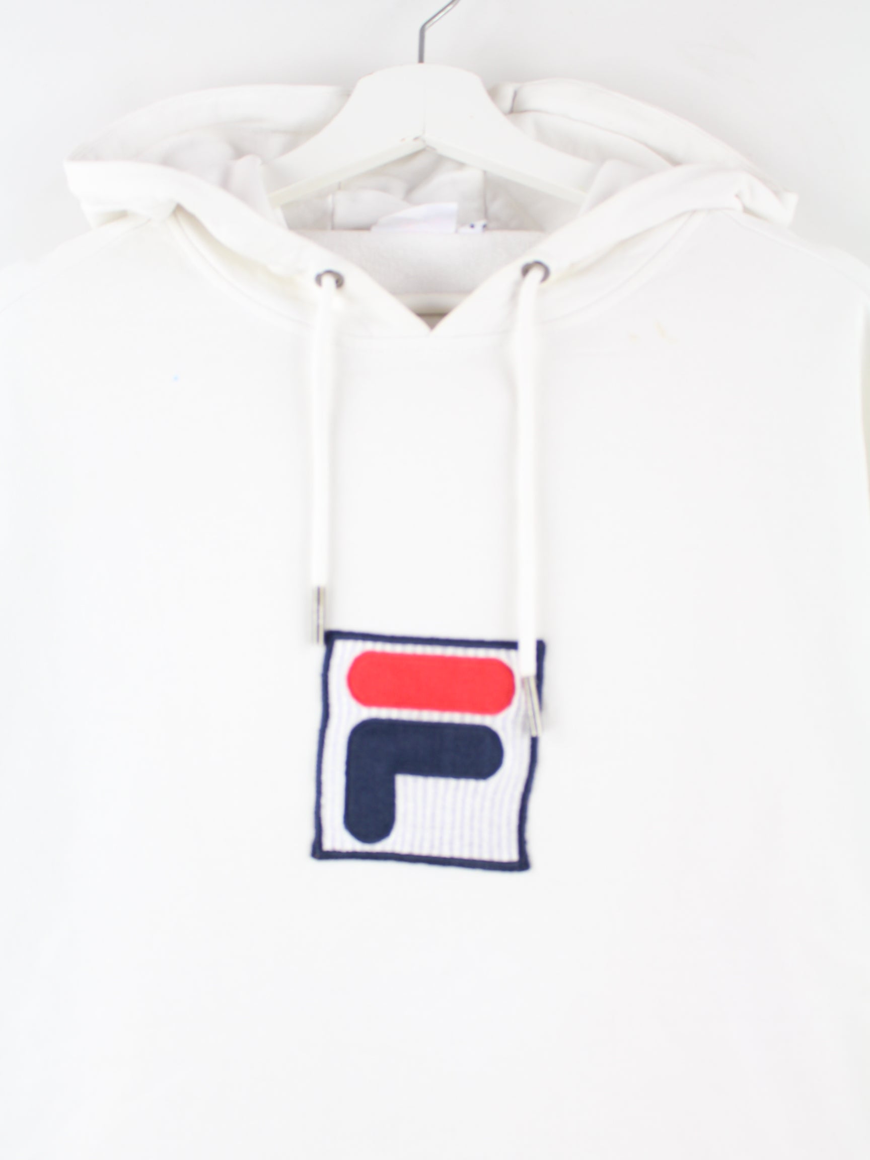 Hoodie vom Brand Fila mit gestickten Motiven in Größe S. Er ist aus einer Baumwollmischung hergestellt und in Weiß bei uns zu bekommen.