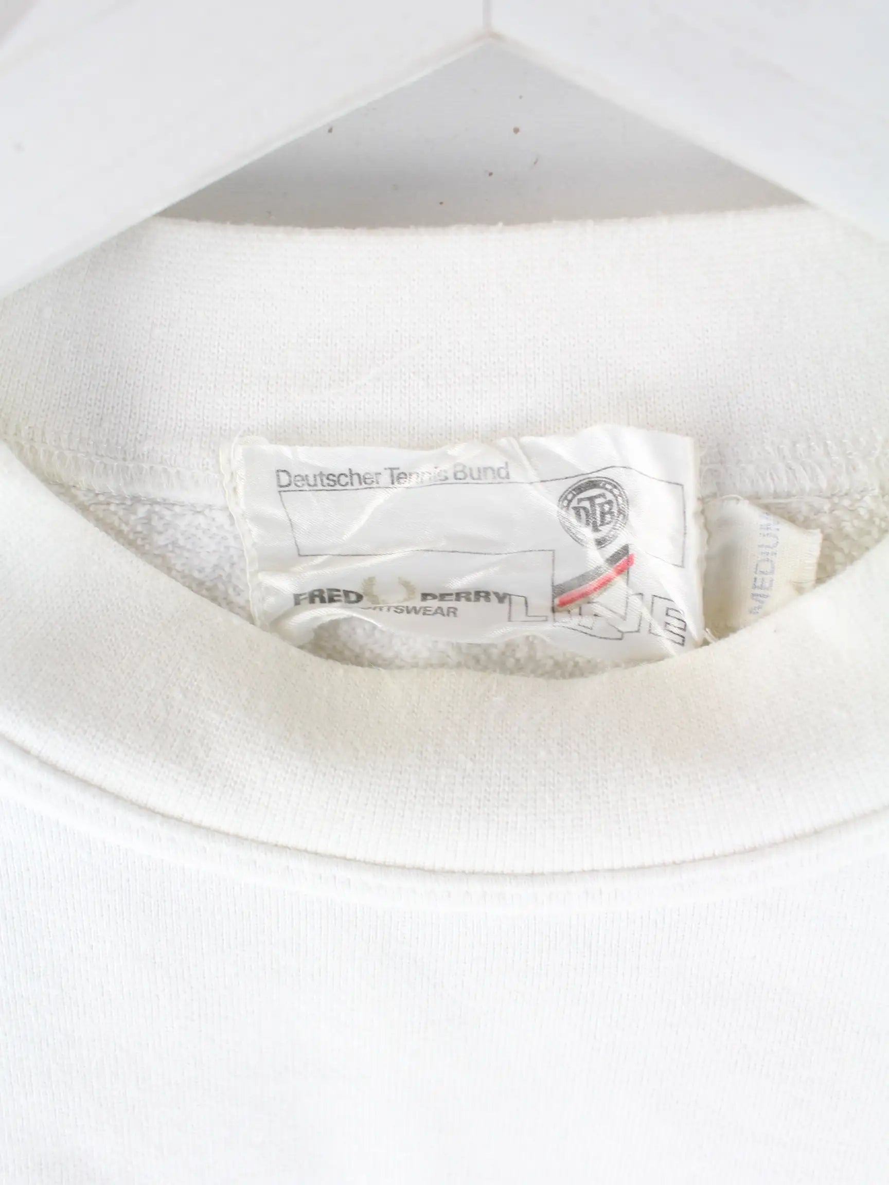 Weißer Sweater der Brand Fred Perry aus den 90'ern in Größe M. Er ist aus einer Baumwollmischung hergestellt und in gutem Zustand im Angebot. Mit chiquem Bund Print.