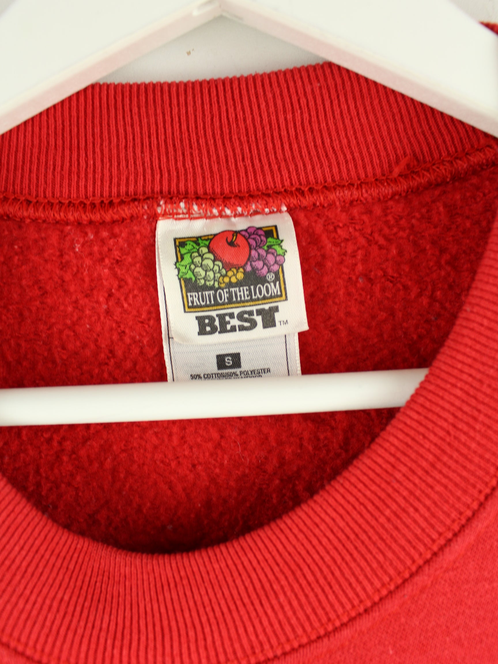 Sweater vom Brand Fruit of the Loom in Größe XS. Er ist aus einer Baumwollmischung gemacht und in Rot in Stock. Mit seltenem Annie Print.