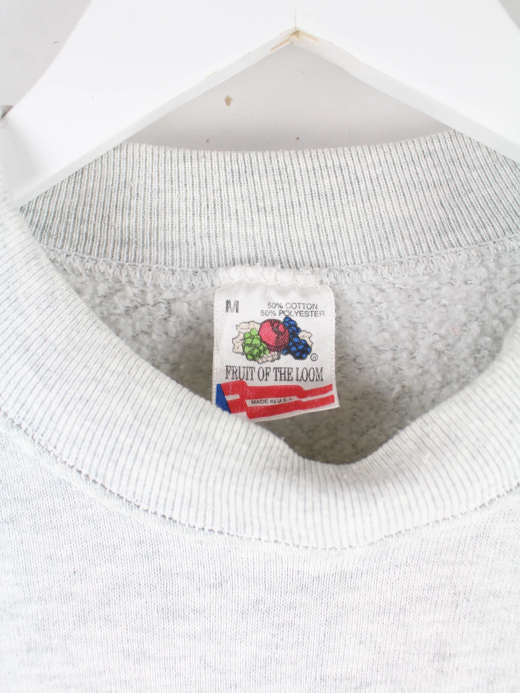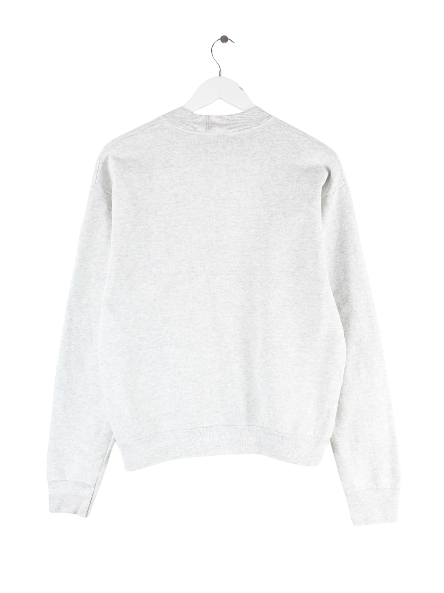 Grauer Sweater mit Stickereien der Marke Fruit of the Loom aus den 90'ern in Größe M. Er ist aus einer Baumwollmischung produziert und in gutem Zustand im Bestand.