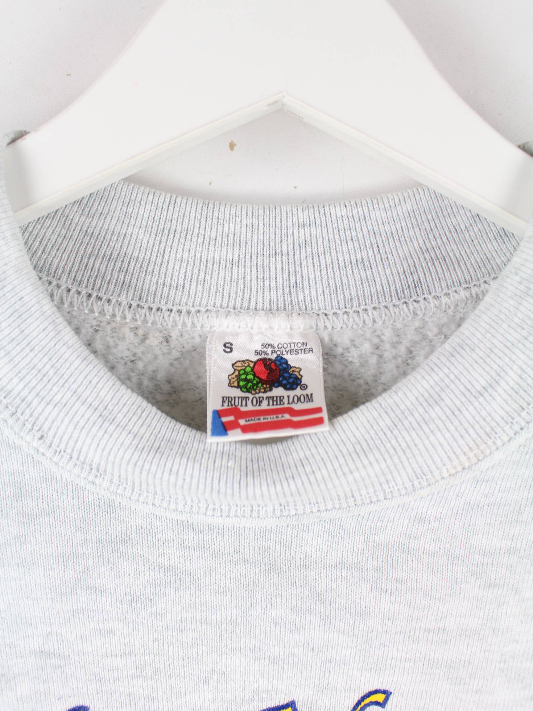 Sweater des Labels Fruit of the Loom in Größe S aus den 90'ern. Er ist aus einer Baumwollmischung gefertigt und in Grau im Angebot. Mit seltenem Name Print.