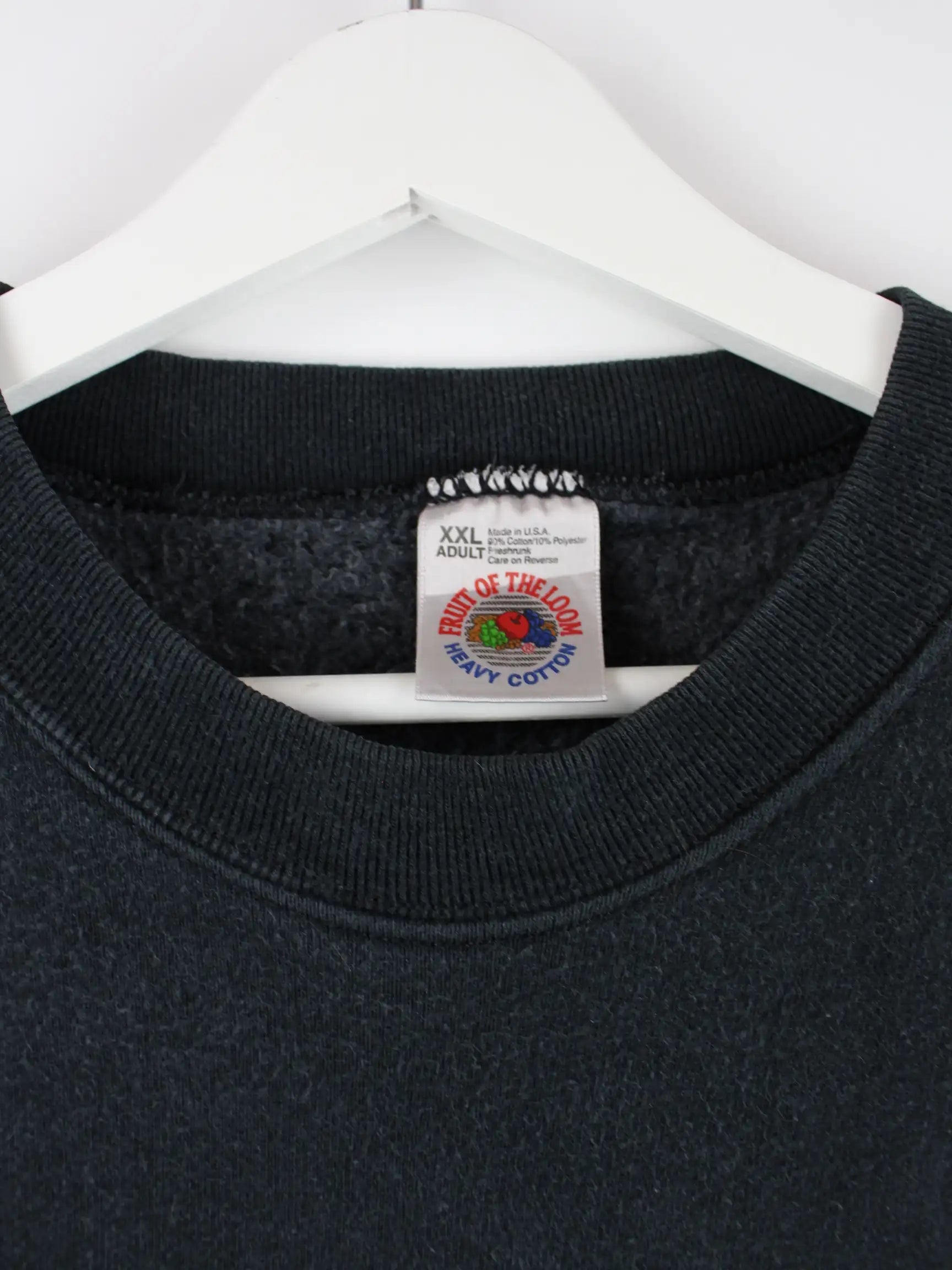 Schwarzer Sweater vom Label Fruit of the Loom aus den 90'ern in Größe XXL. Er ist aus einer Baumwollmischung produziert und in sehr gutem Zustand vorrätig.