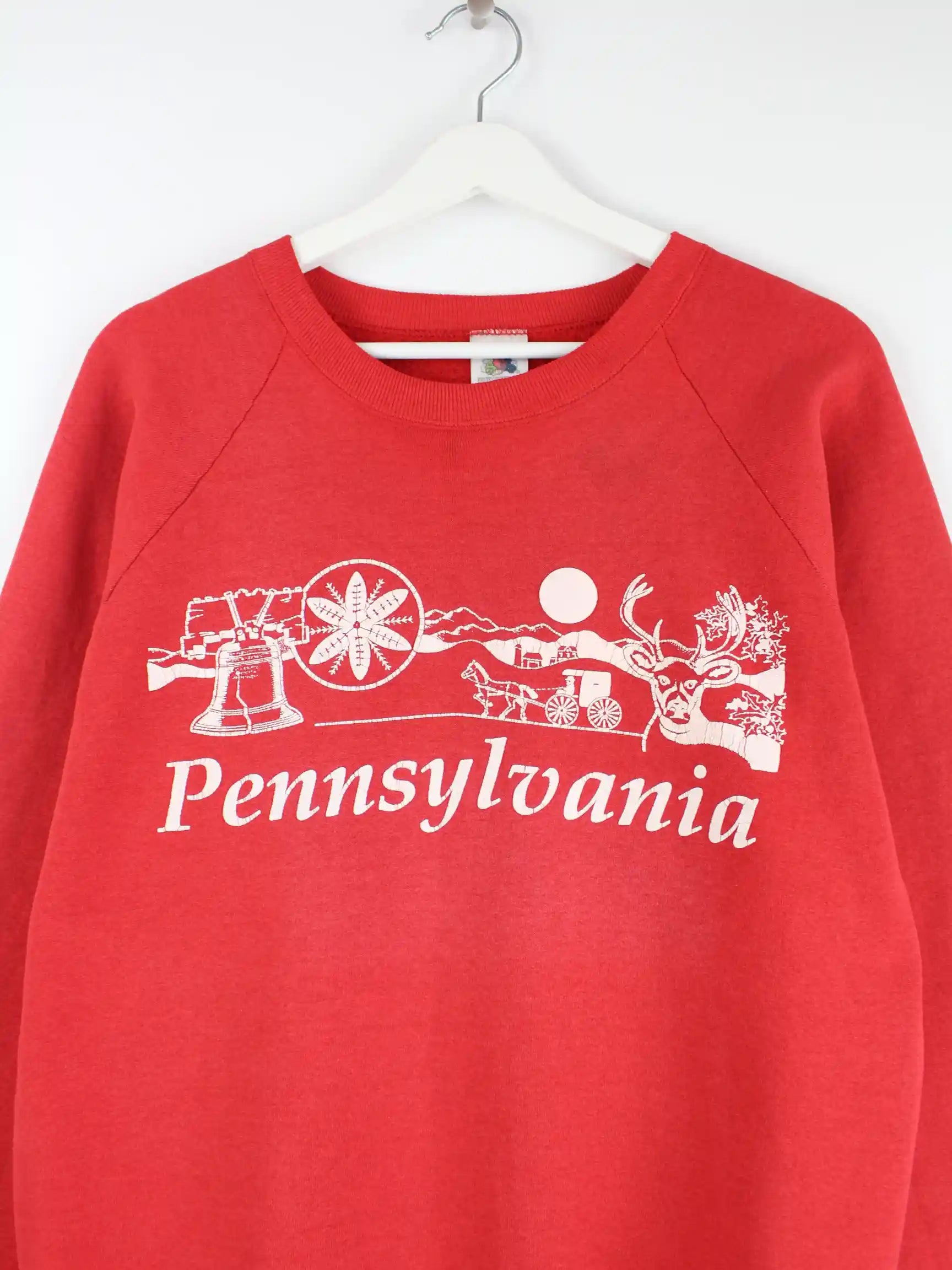 Sweater vom Brand Fruit of the Loom in Größe L aus den 90'ern. Er ist aus einer Baumwollmischung gemacht und in Rot im Angebot. Mit schönem Pennsylvania Print.