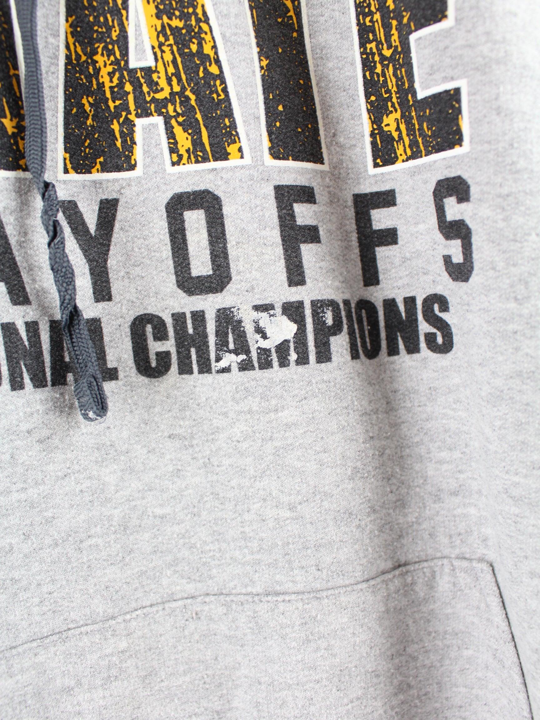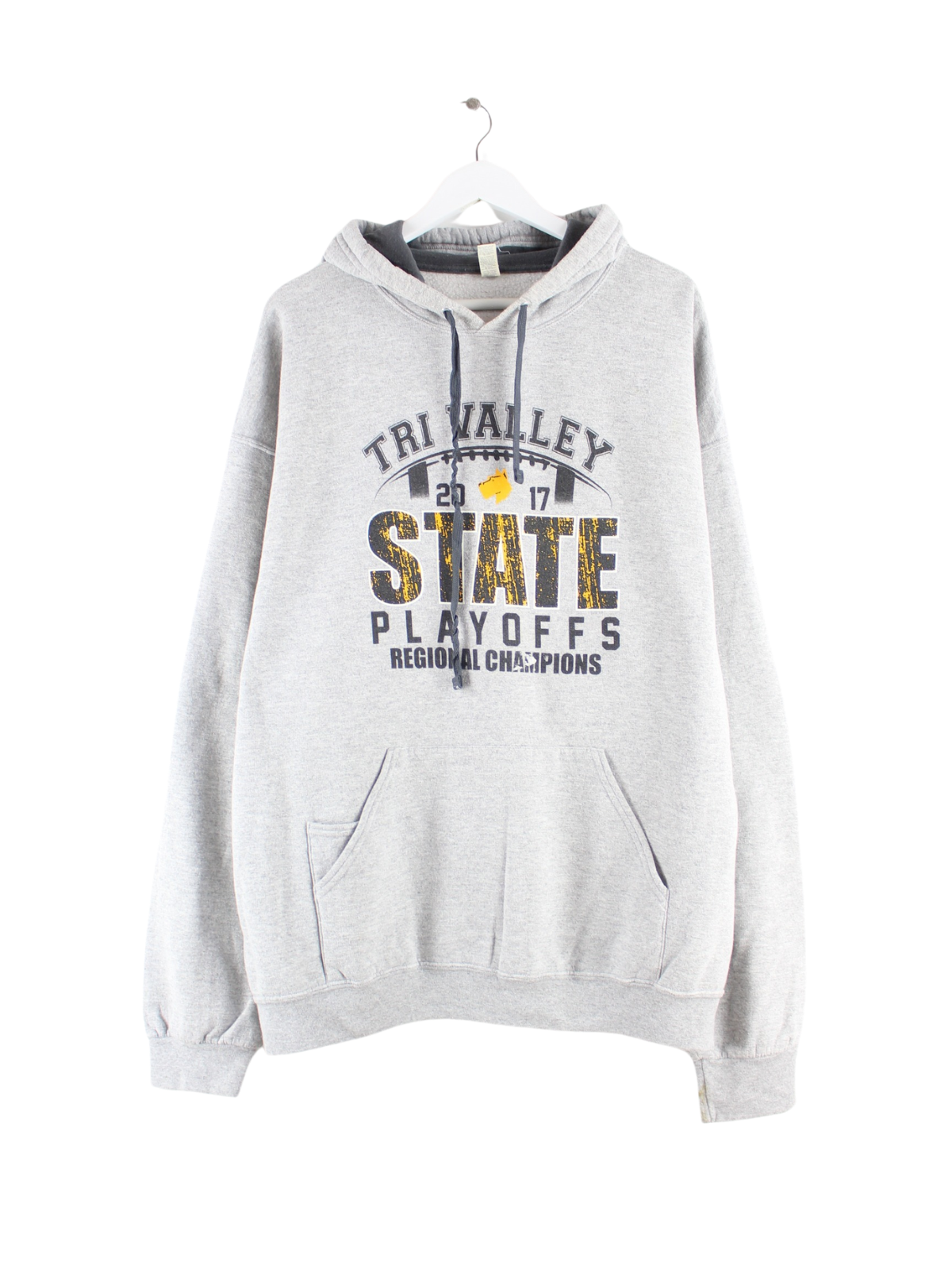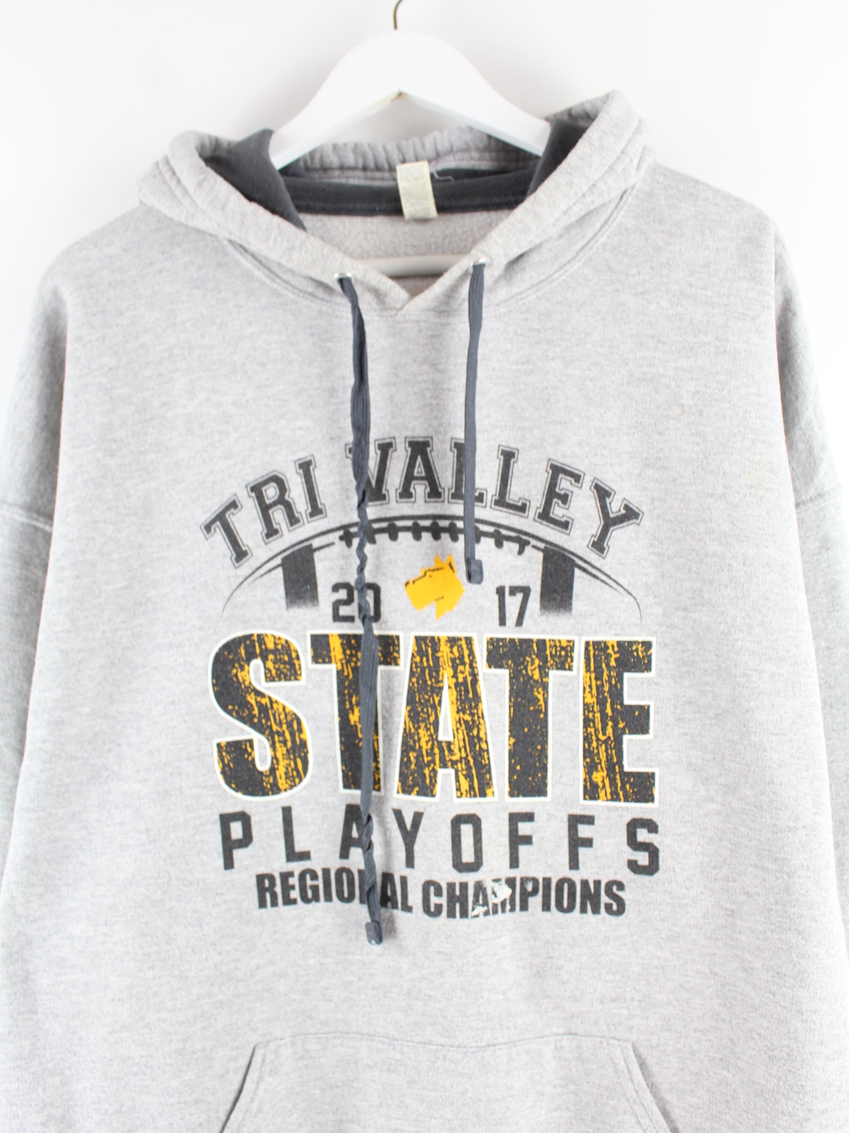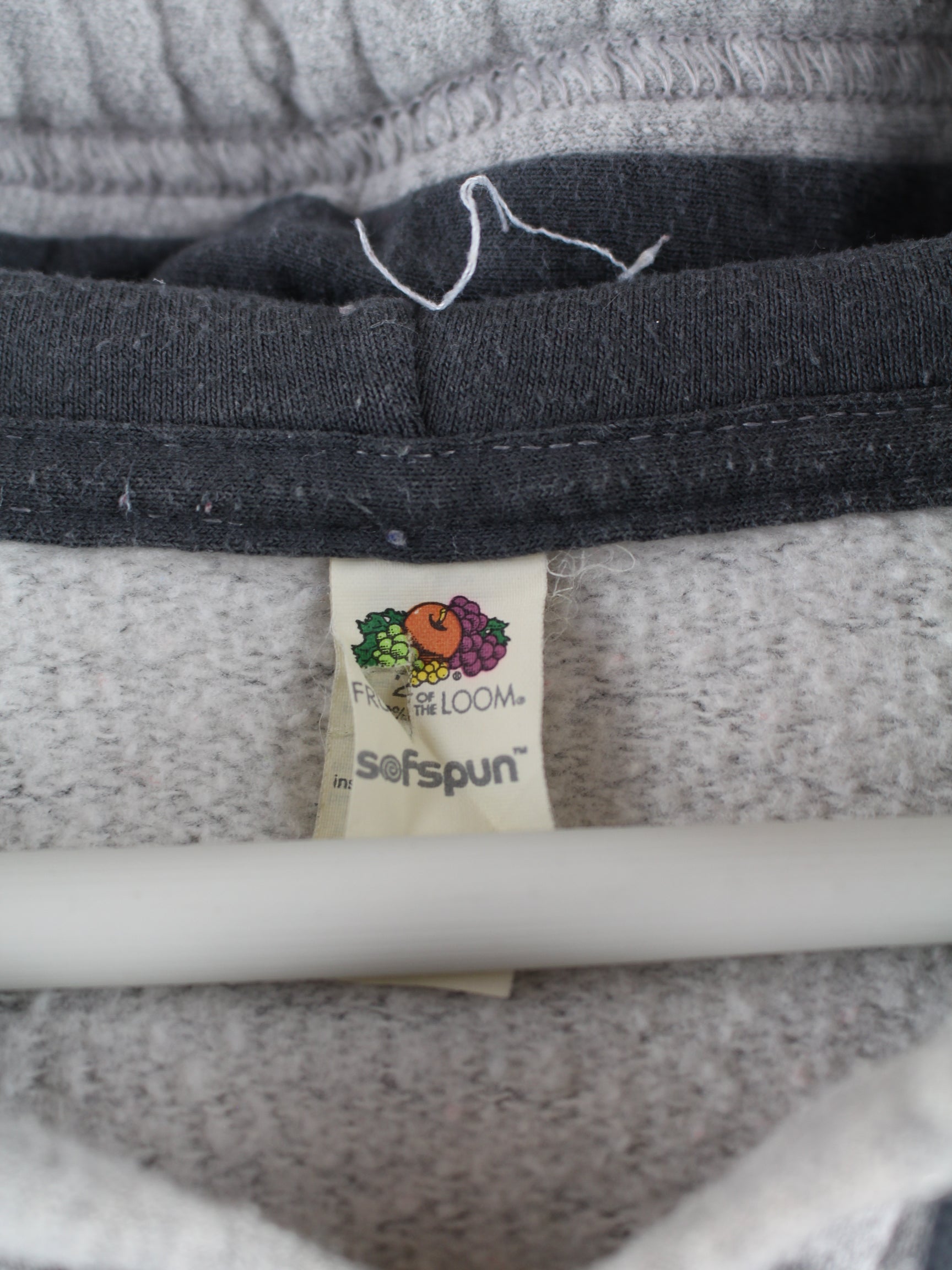Grauer Hoodie vom Label Fruit of the Loom aus Anfang der 2000'er in Größe XXL. Er ist aus einer Baumwollmischung angefertigt und in gutem Zustand zu haben. Mit chiquem Valley Print.