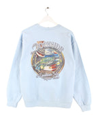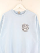Blauer Sweater vom Label Gildan in Größe M. Er ist aus einer Baumwollmischung gefertigt und in gutem Zustand im Bestand. Mit tollem Beach Print.