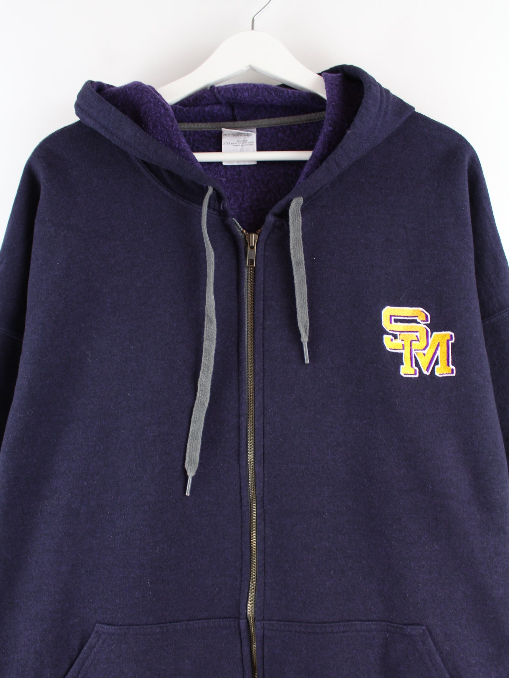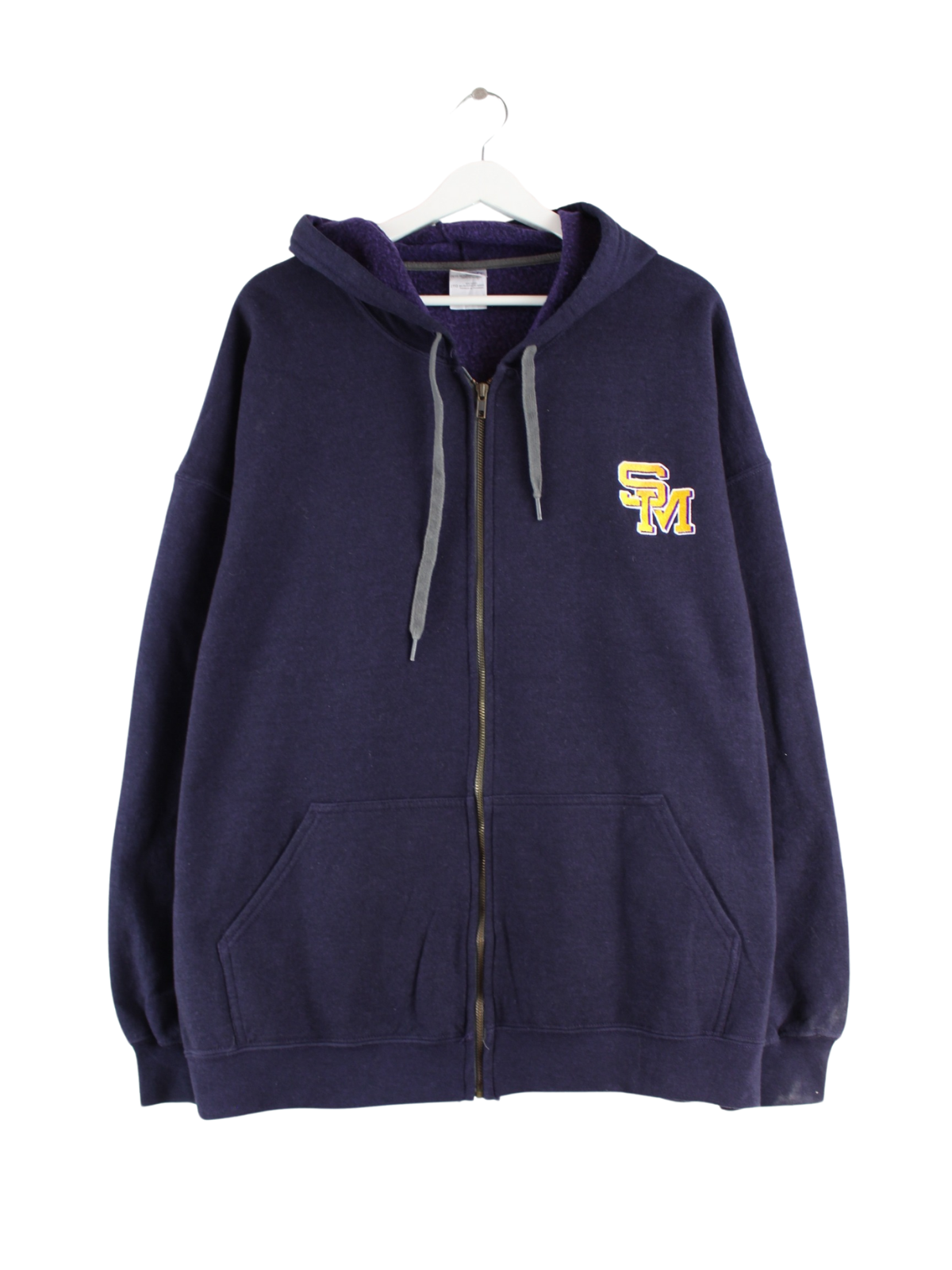 Hoodie der Marke Gildan mit gestickten Motiven und durchgehendem Reißverschluß in Größe 3XL. Er ist aus einer Baumwollmischung gefertigt und in Lila im Angebot.