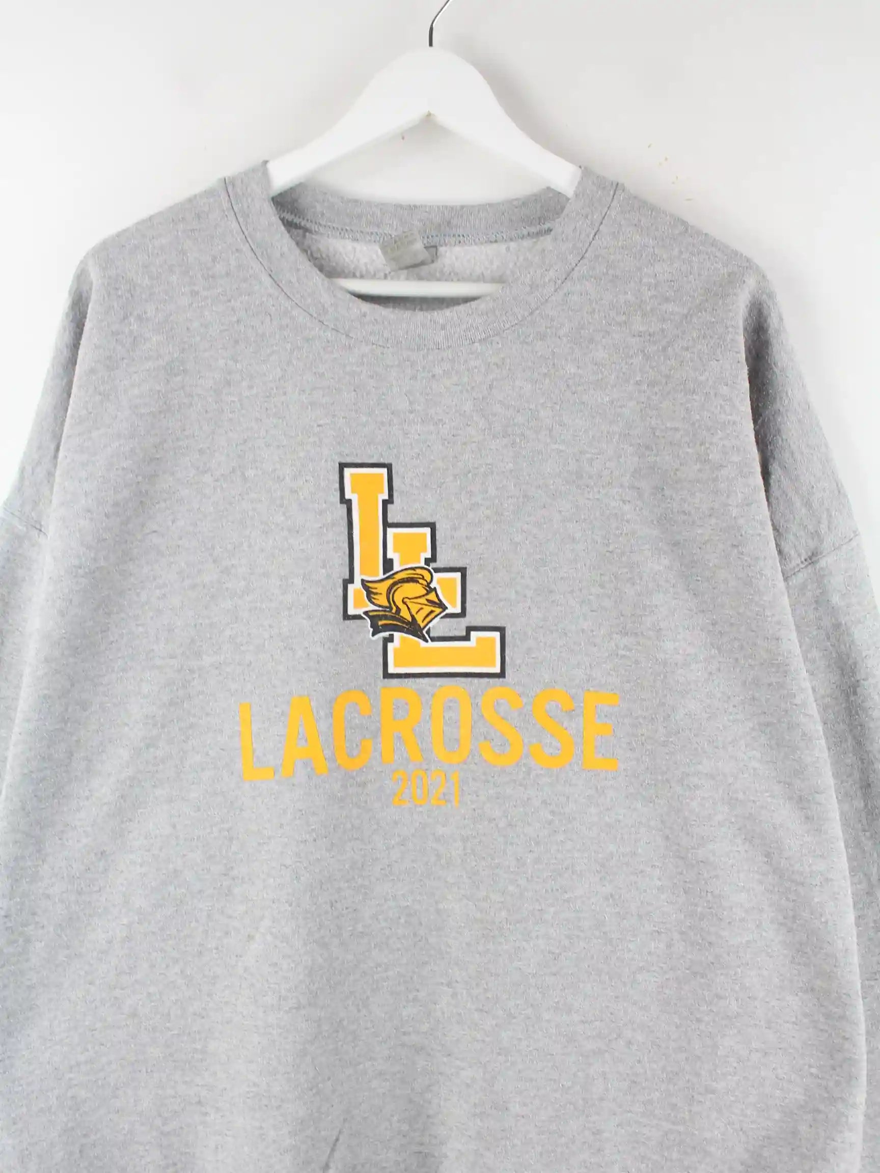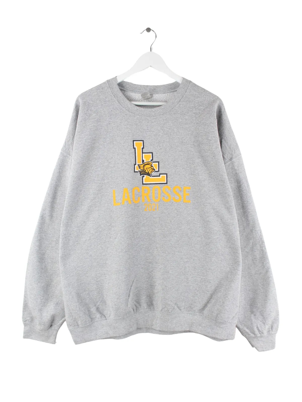 Grauer Sweater der Marke Gildan in Größe XXL. Er ist aus einer Baumwollmischung angefertigt und in sehr gutem Zustand vorrätig. Mit seltenem Lacrosse Print.