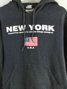 Grauer Hoodie der Brand Jerzees in Größe S. Er ist aus einer Baumwollmischung angefertigt und in sehr gutem Zustand lieferbar. Mit schönem York Print.