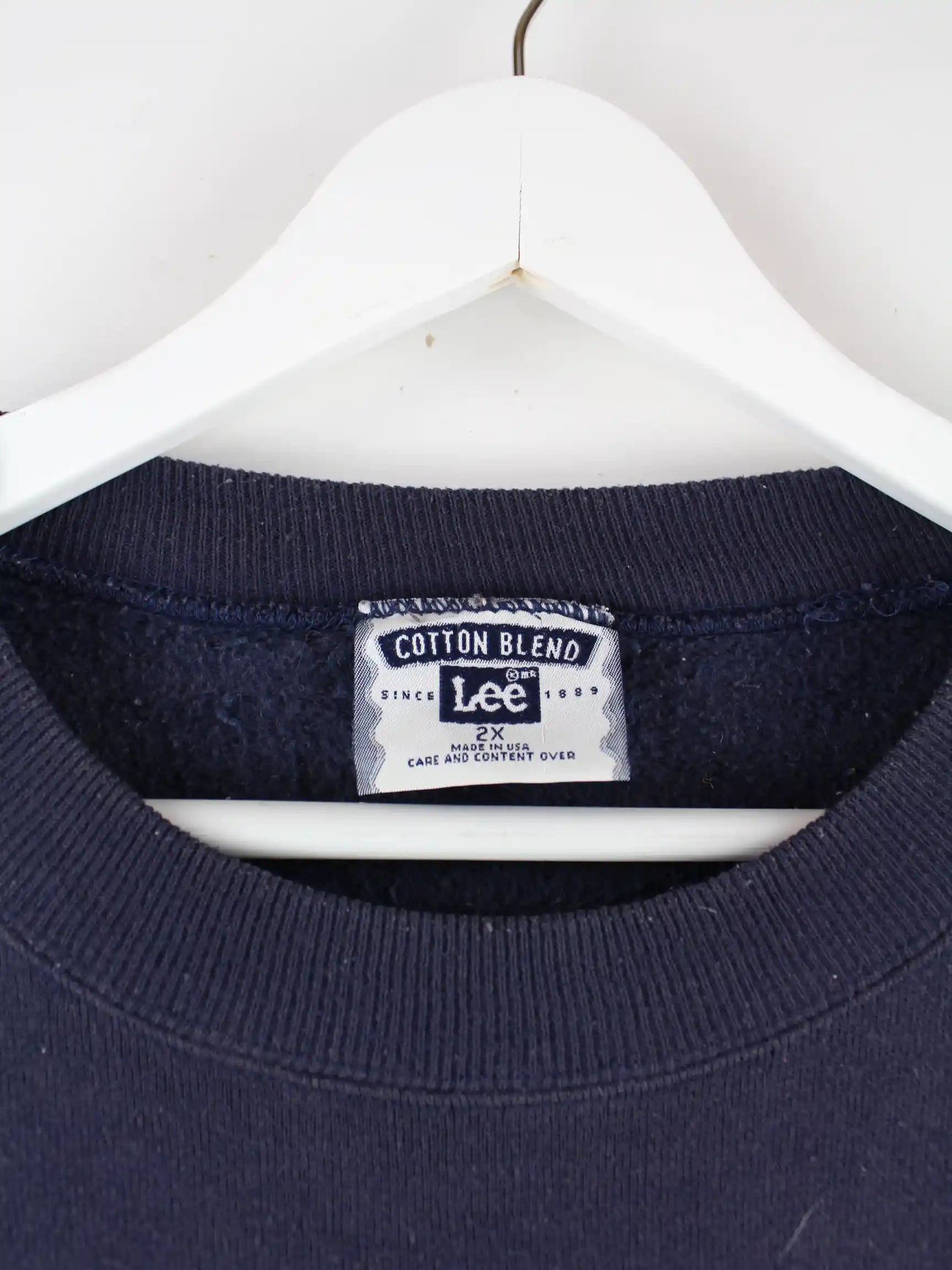 Sweater der Brand Lee mit gestickten Motiven in Größe 3XL aus den 90'ern. Er ist aus einer Baumwollmischung gemacht und in Blau bei uns zu bekommen.