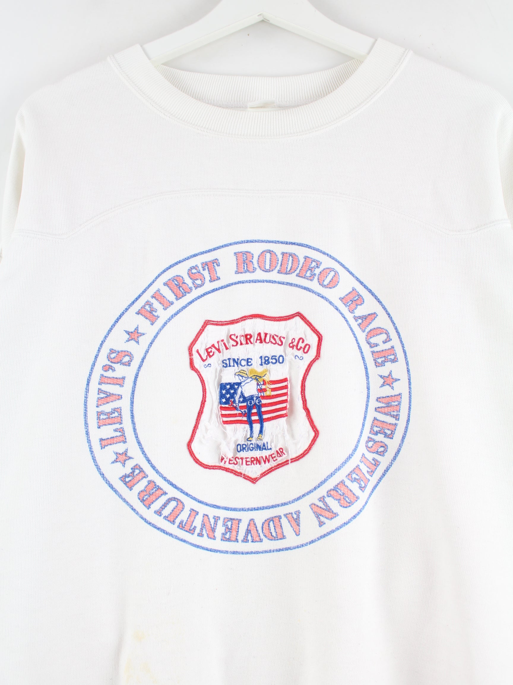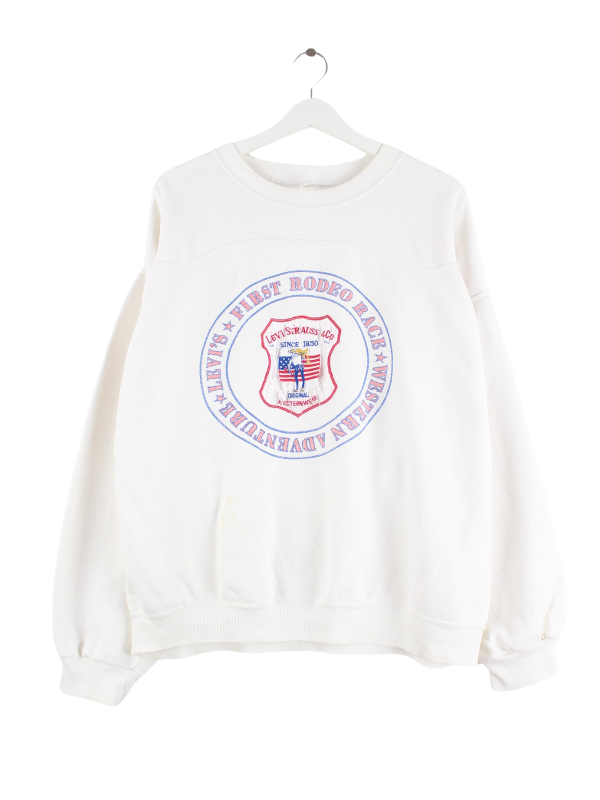Weißer Sweater des Labels Levi's aus den 80'ern in Größe XL. Er ist aus einer Baumwollmischung gefertigt. Den Zustand würden wir als 'In Ordnung' bezeichnen (vergl. Bilder).