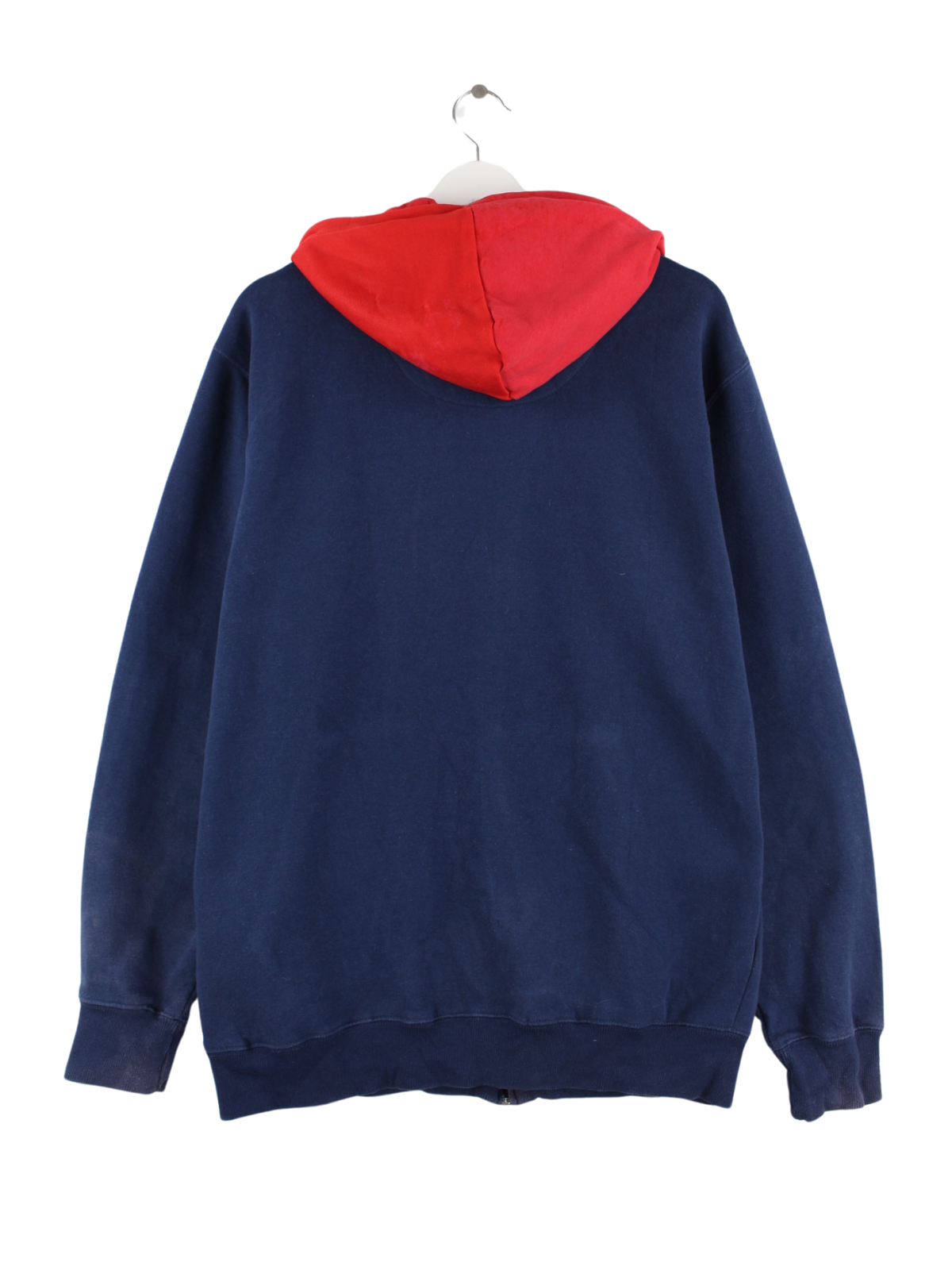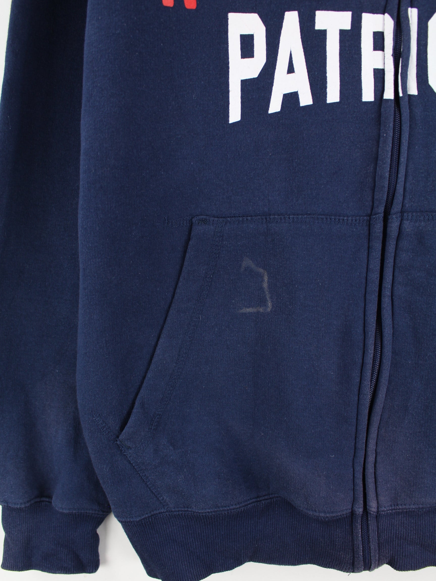 Blauer Hoodie mit langem Reißverschluß von NFL in Größe M. Er ist aus einer Baumwollmischung angefertigt. Den Zustand würden wir als 'In Ordnung' bezeichnen (vergl. Bilder).Mit schickem Patriots Print.