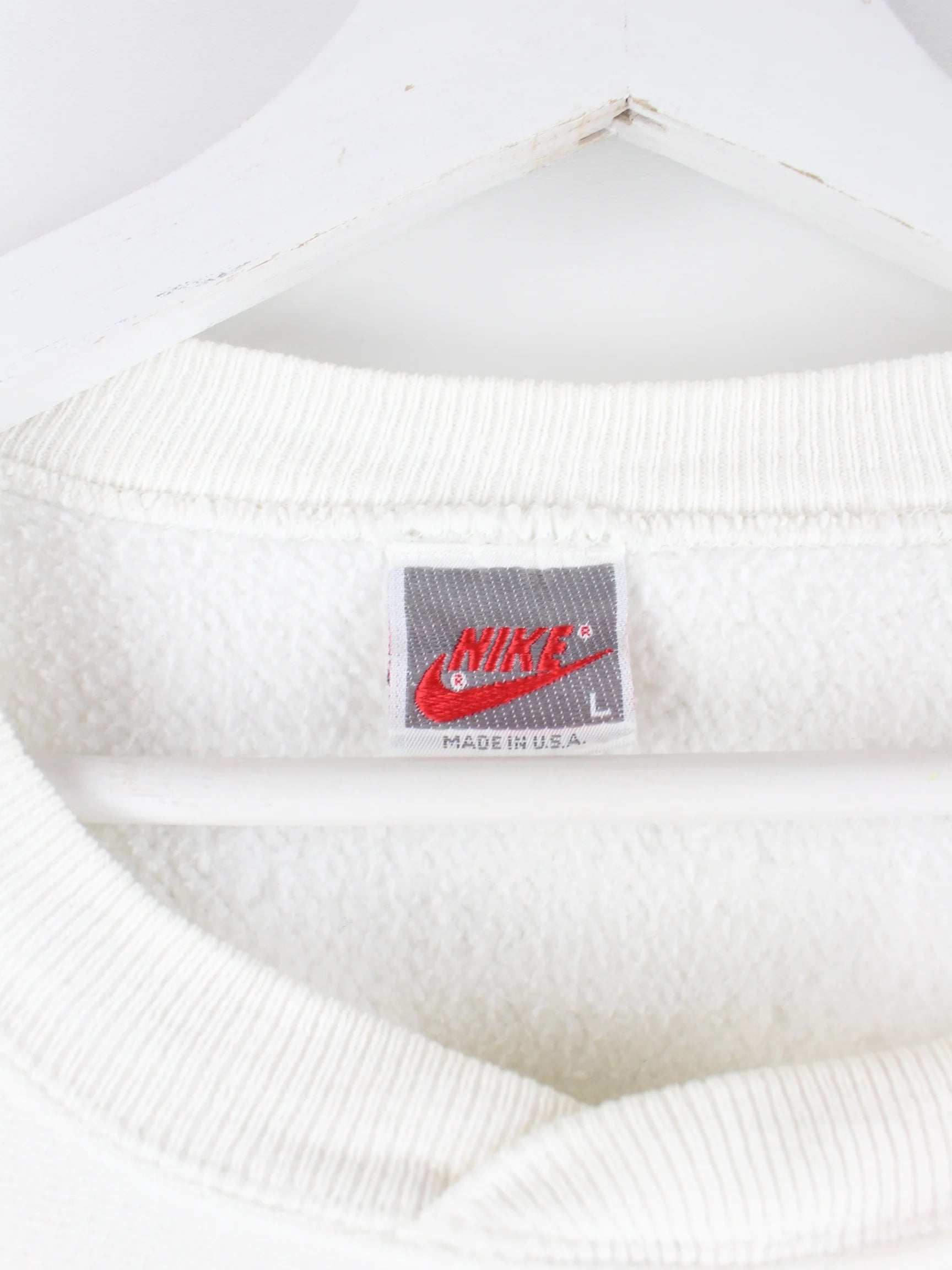Sweater des Labels Nike in Größe L aus den 80'ern. Er ist aus einer Baumwollmischung hergestellt und in Weiß auf Lager. Mit chiquem Air Print.